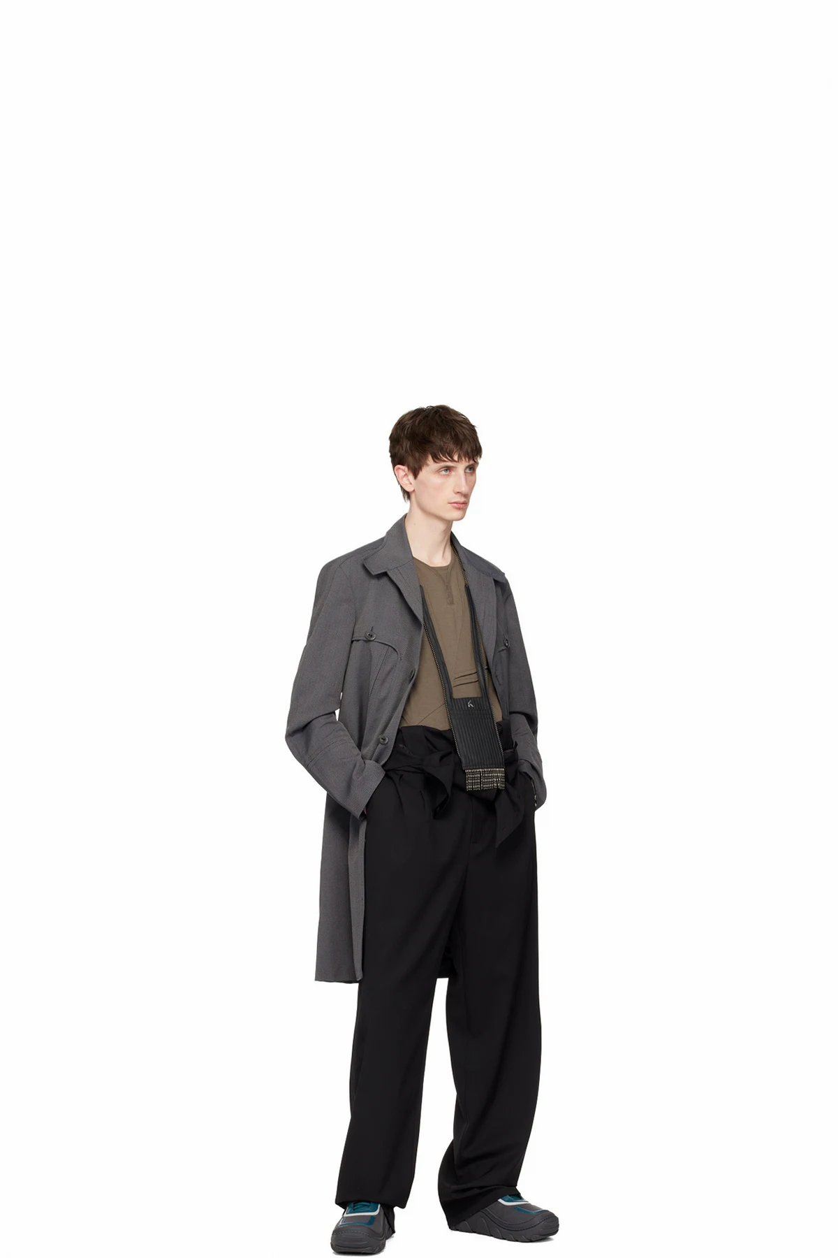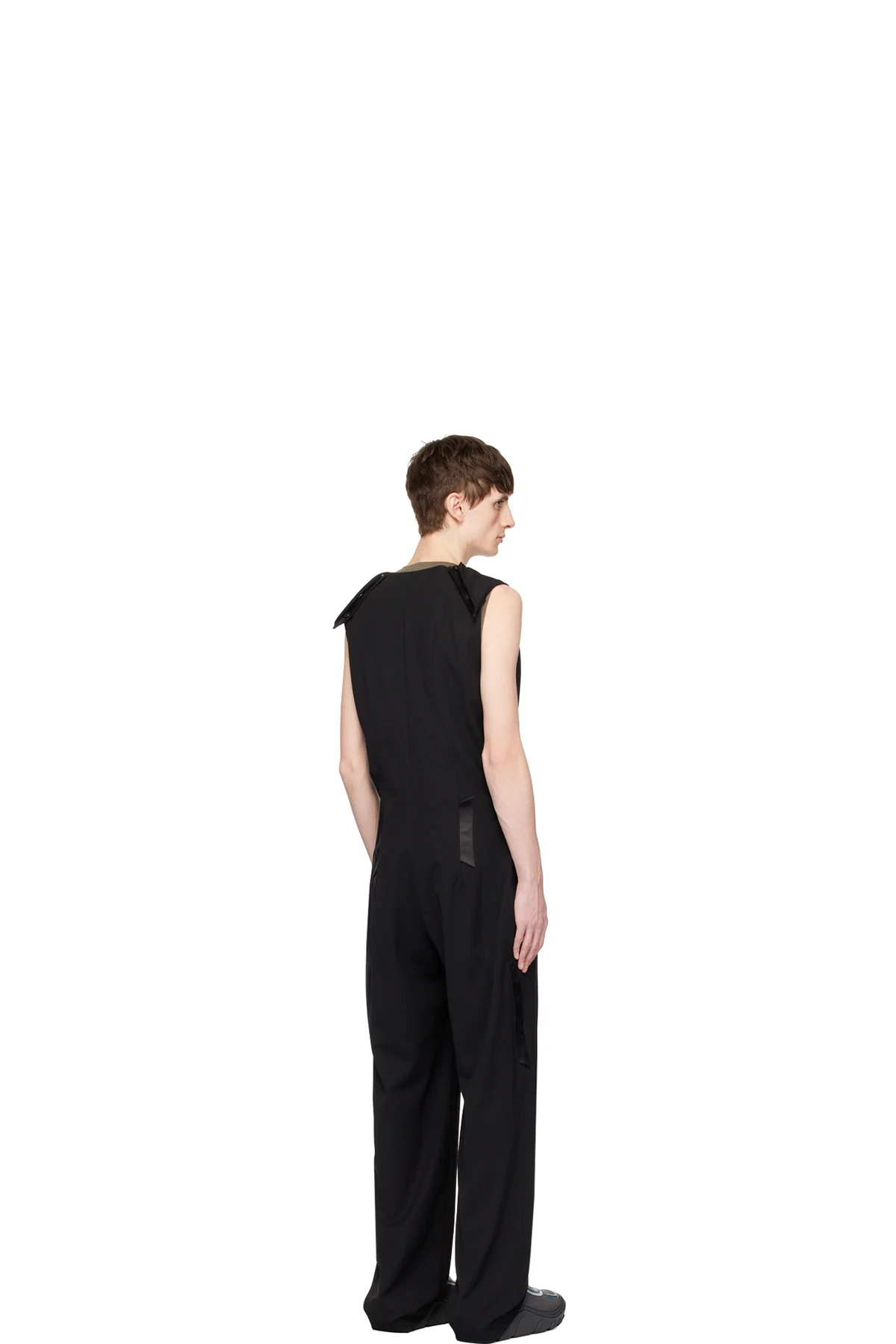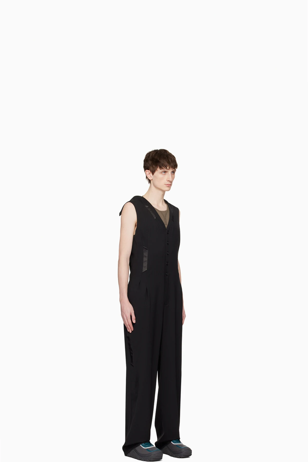 Stretch virgin wool gabardine jumpsuit. Satin trim throughout.