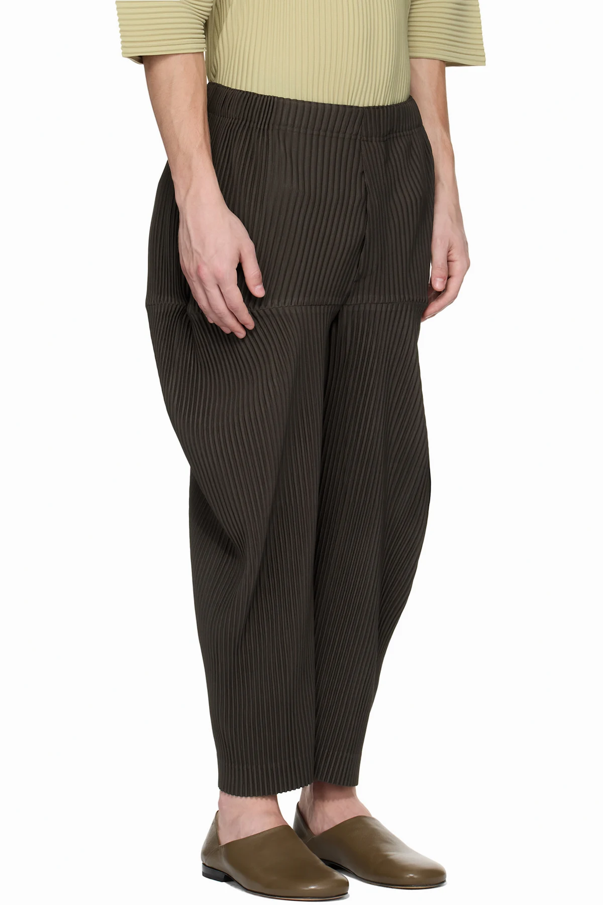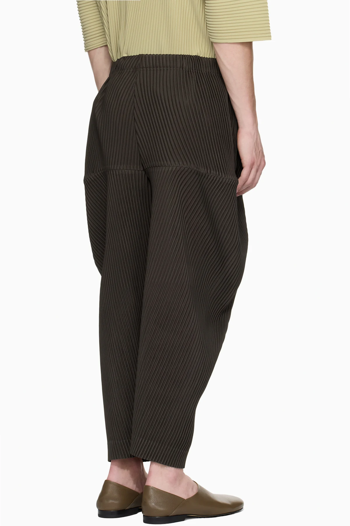 Garment-pleated polyester tricot trousers.