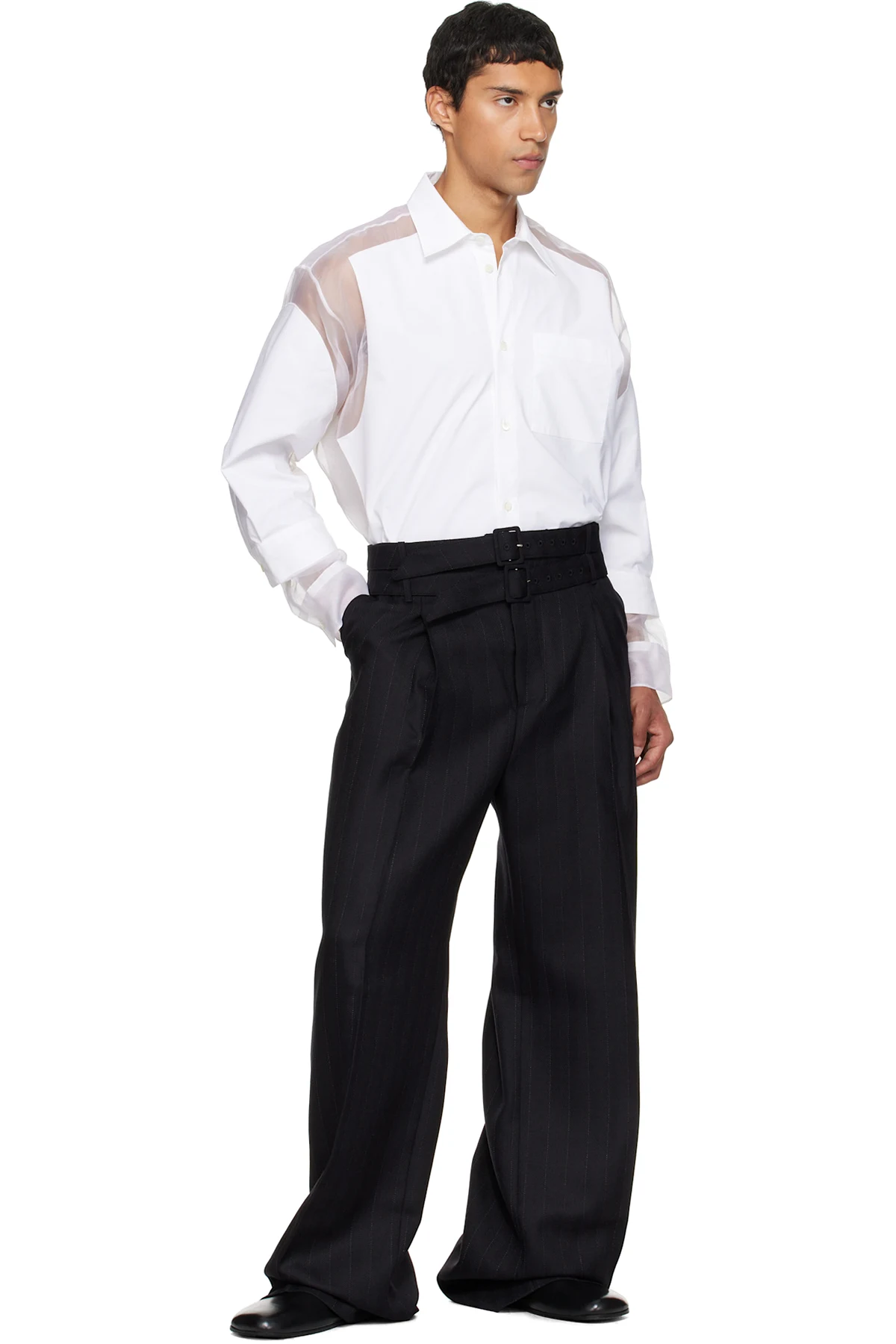 · Belt loops and detachable pin-buckle belts at waistband
