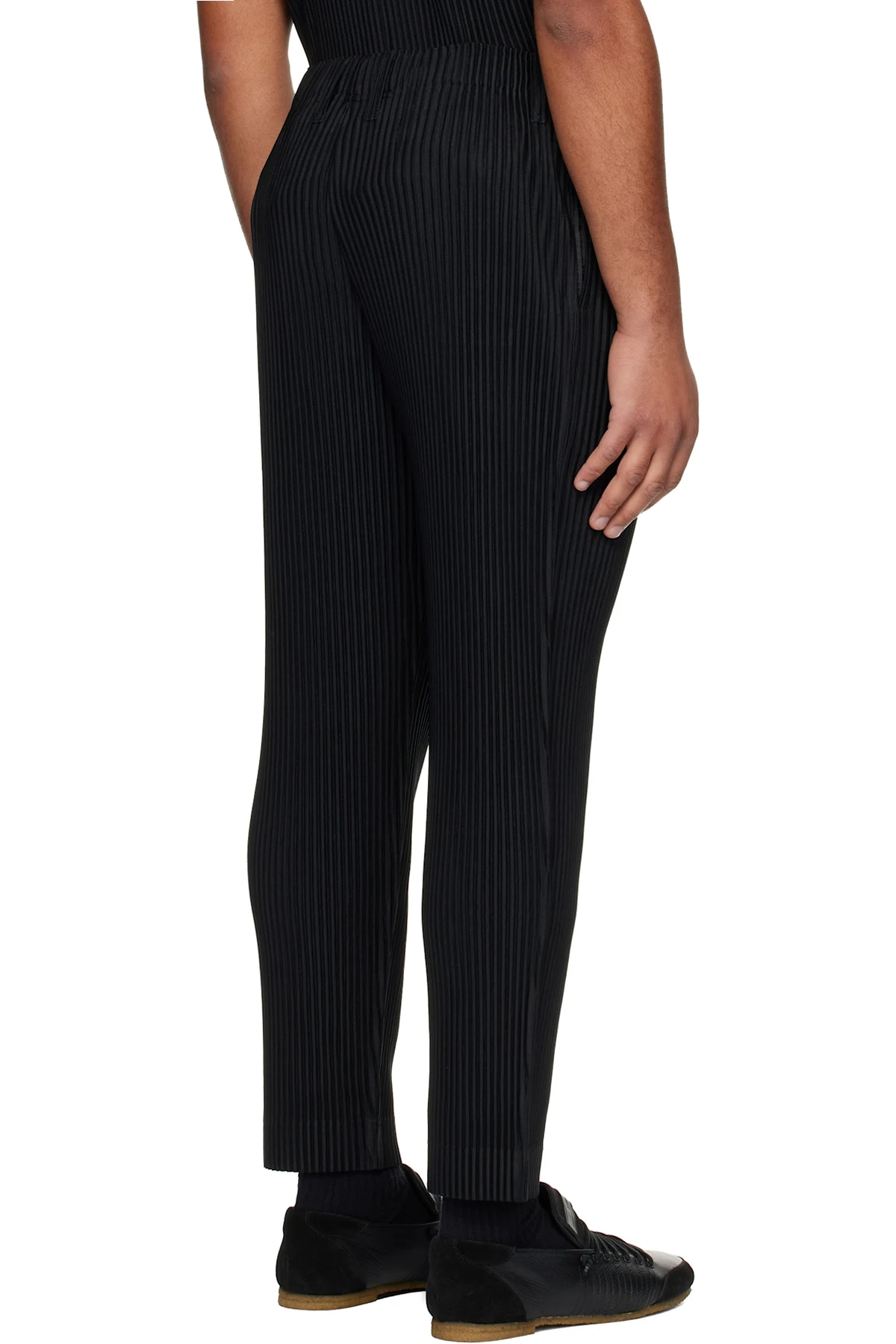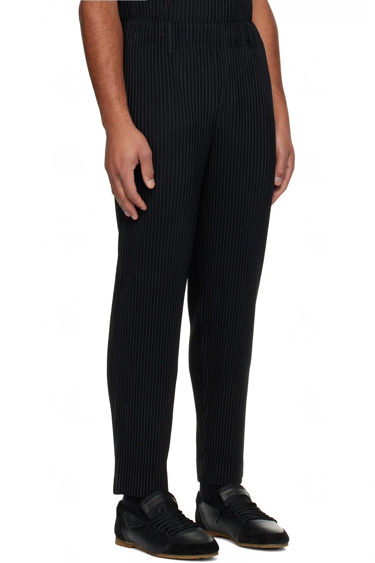 Garment-pleated polyester tricot trousers.