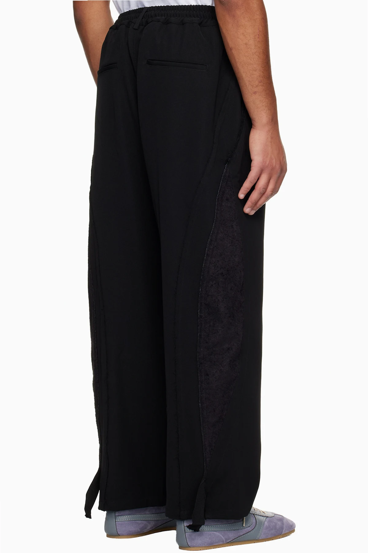 · Faux-suede panel and raw edges at curved outseams