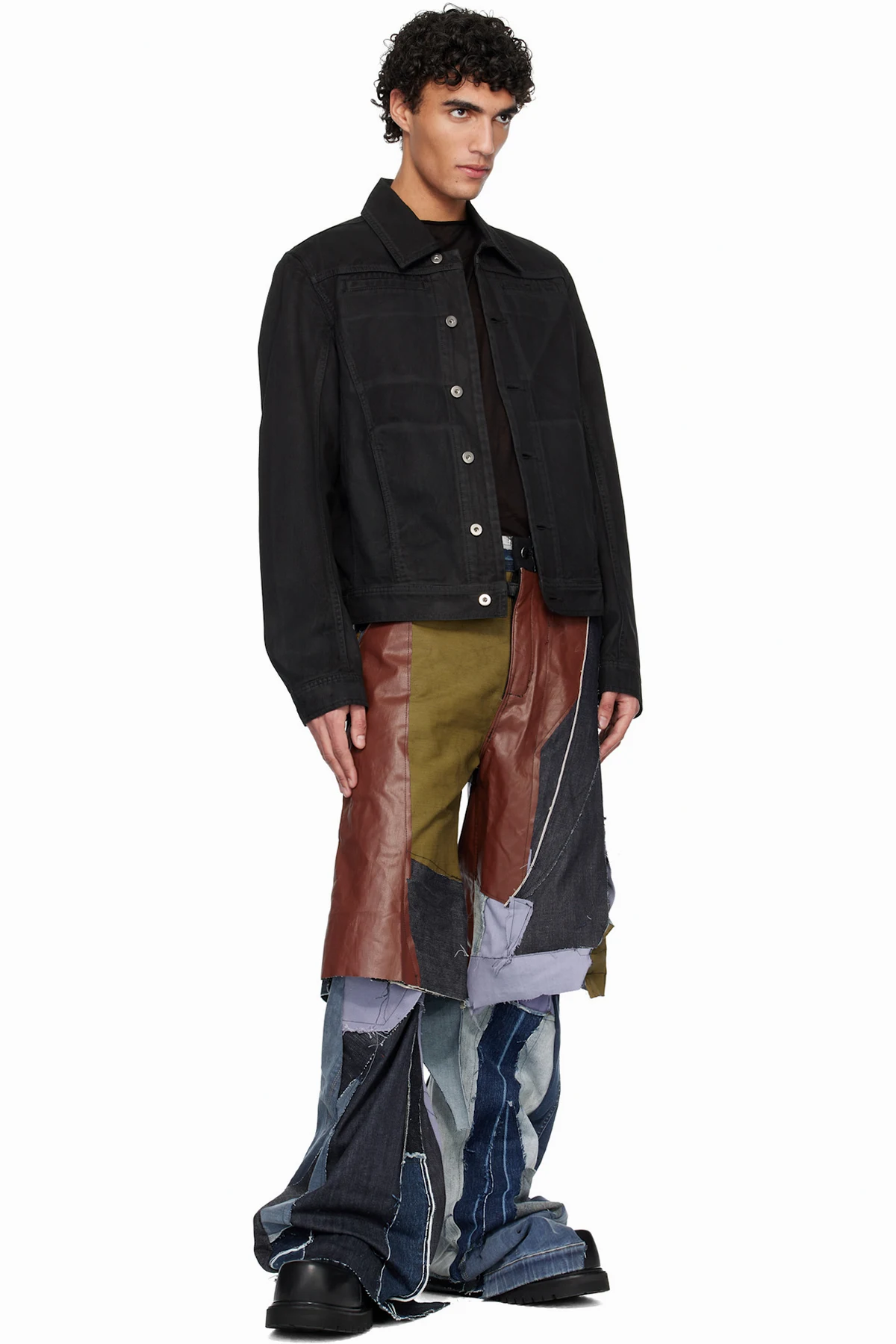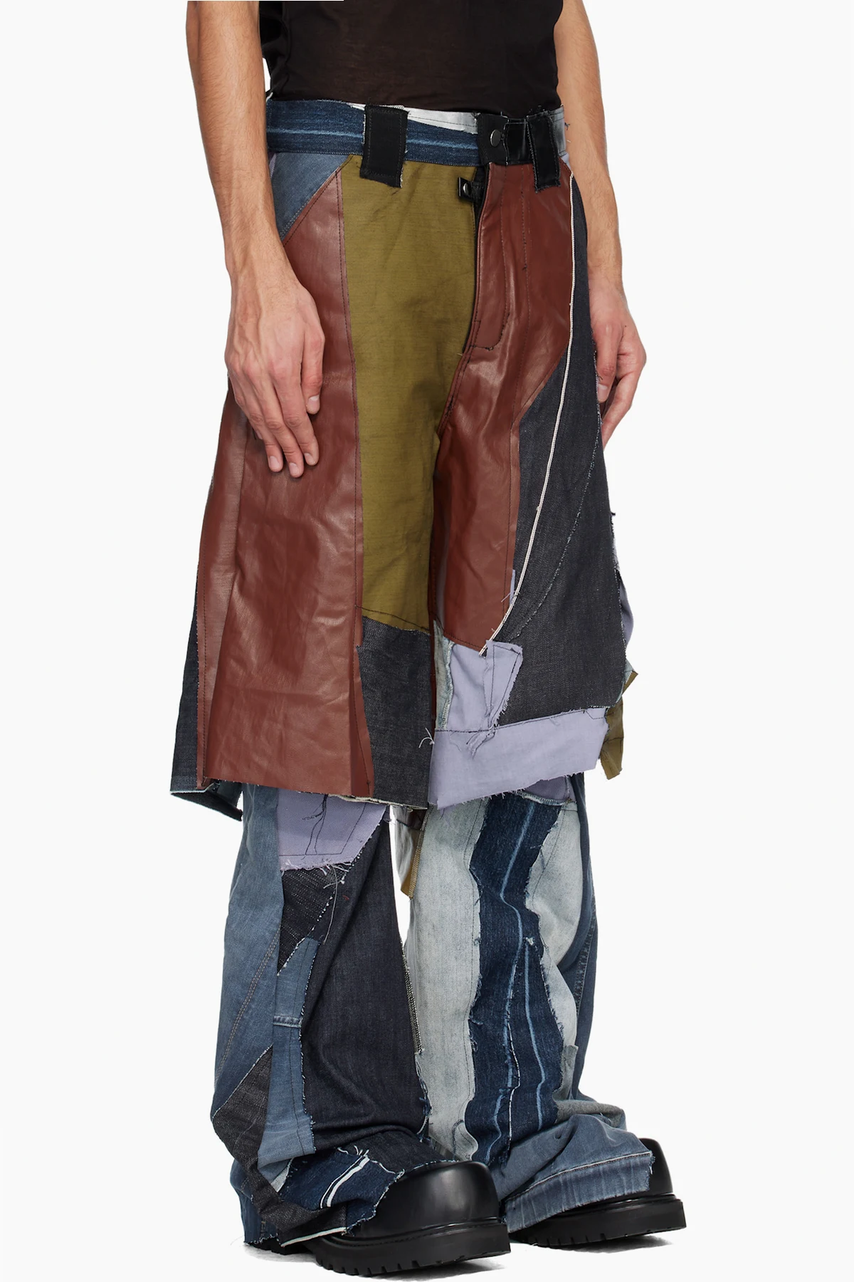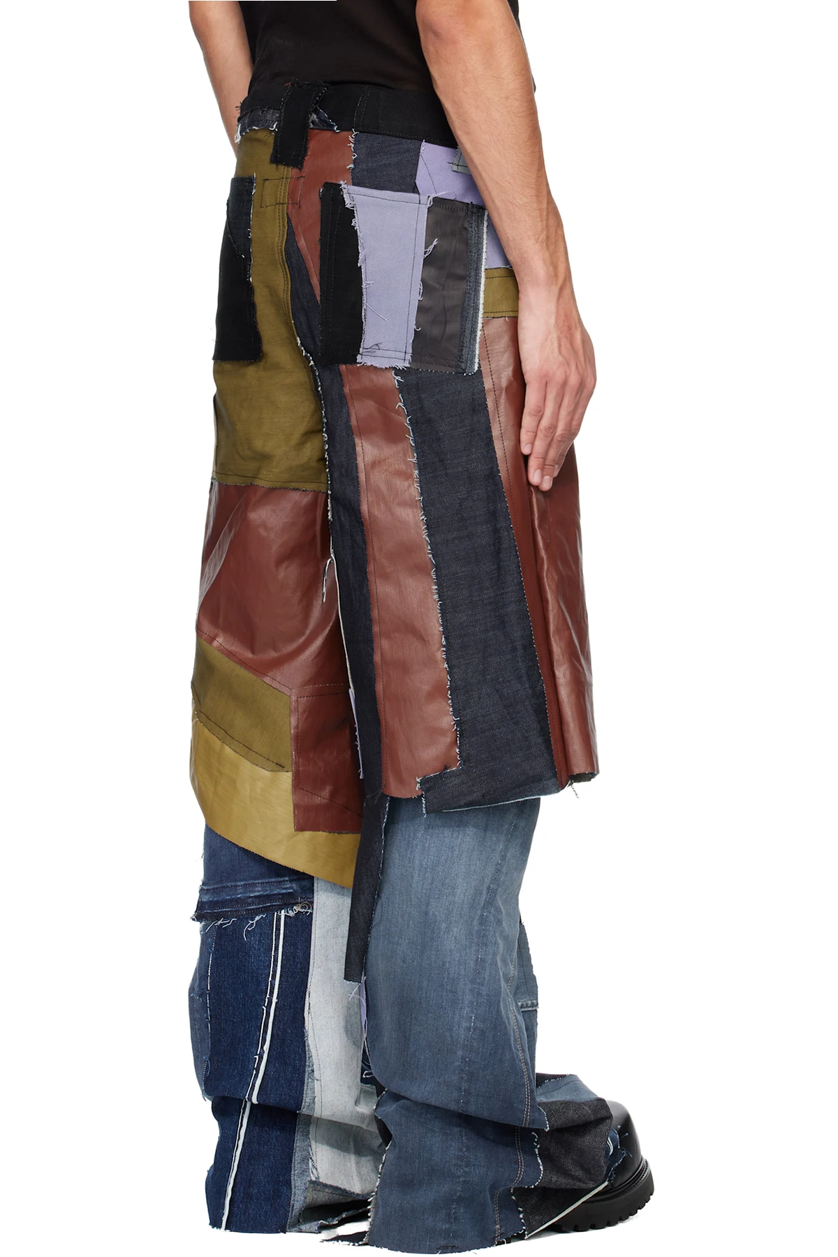 Upcycled non-stretch denim and leather trousers.