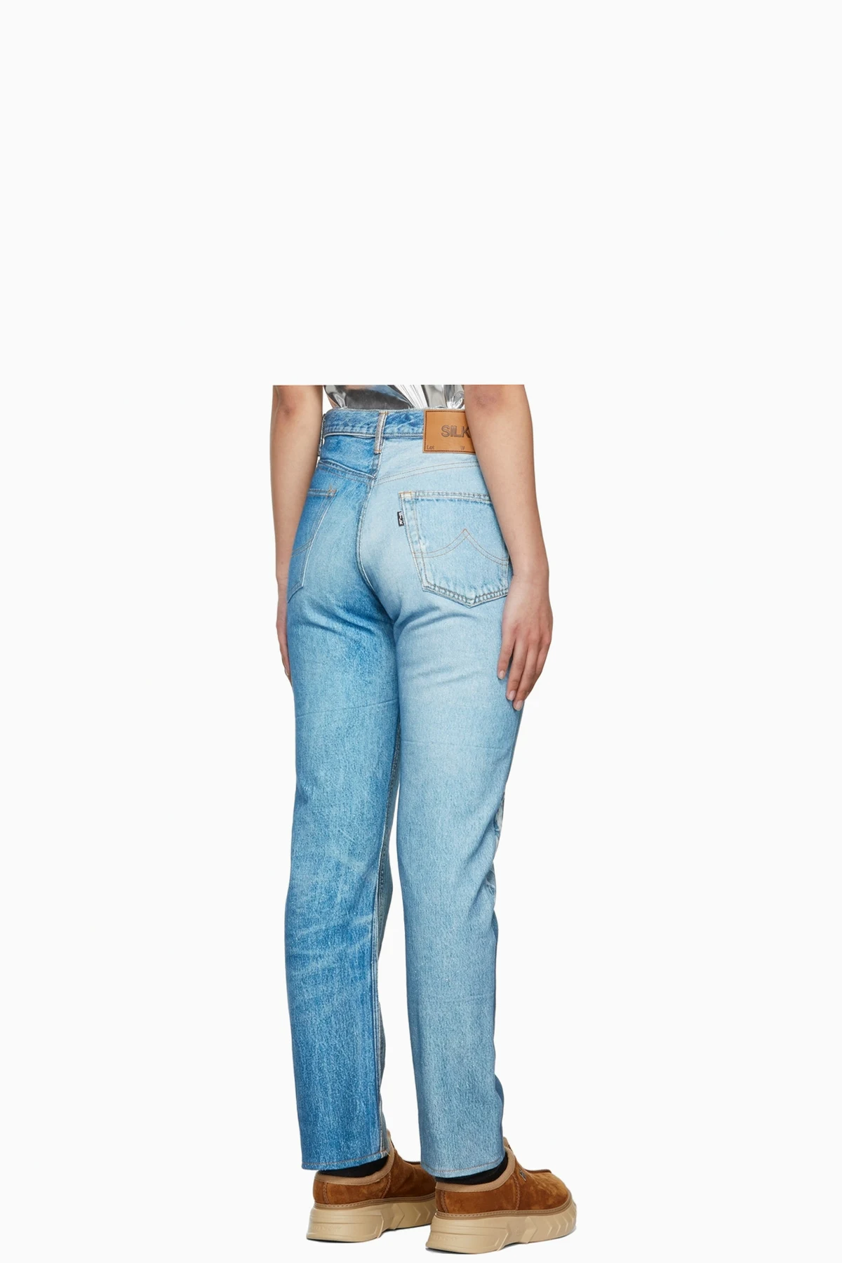 · Leather logo patch in tan at back waistband
