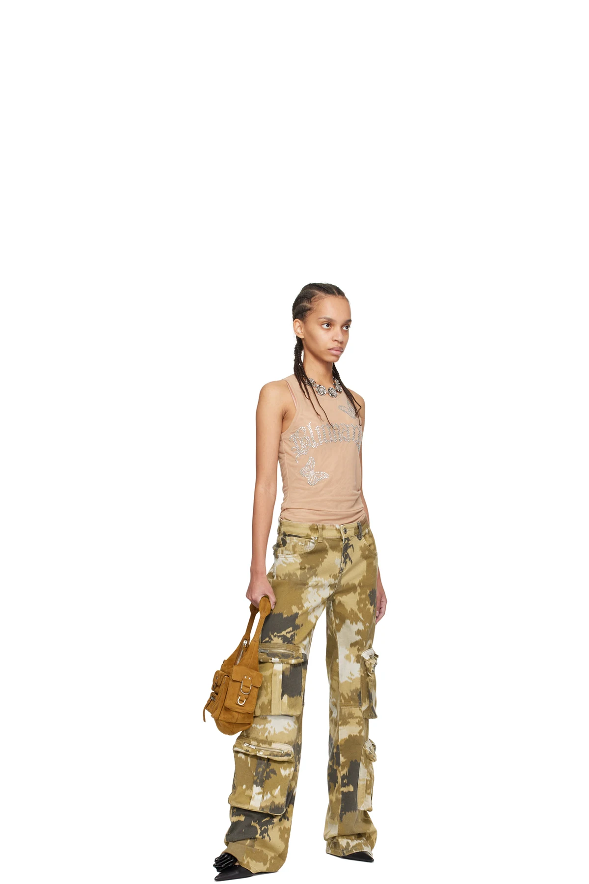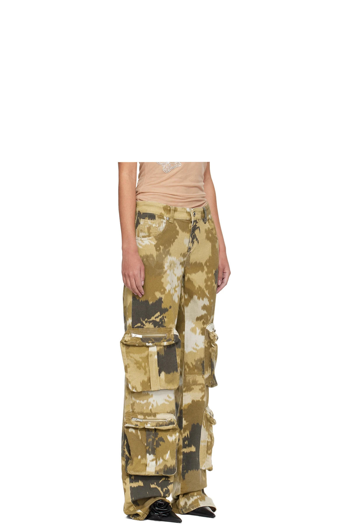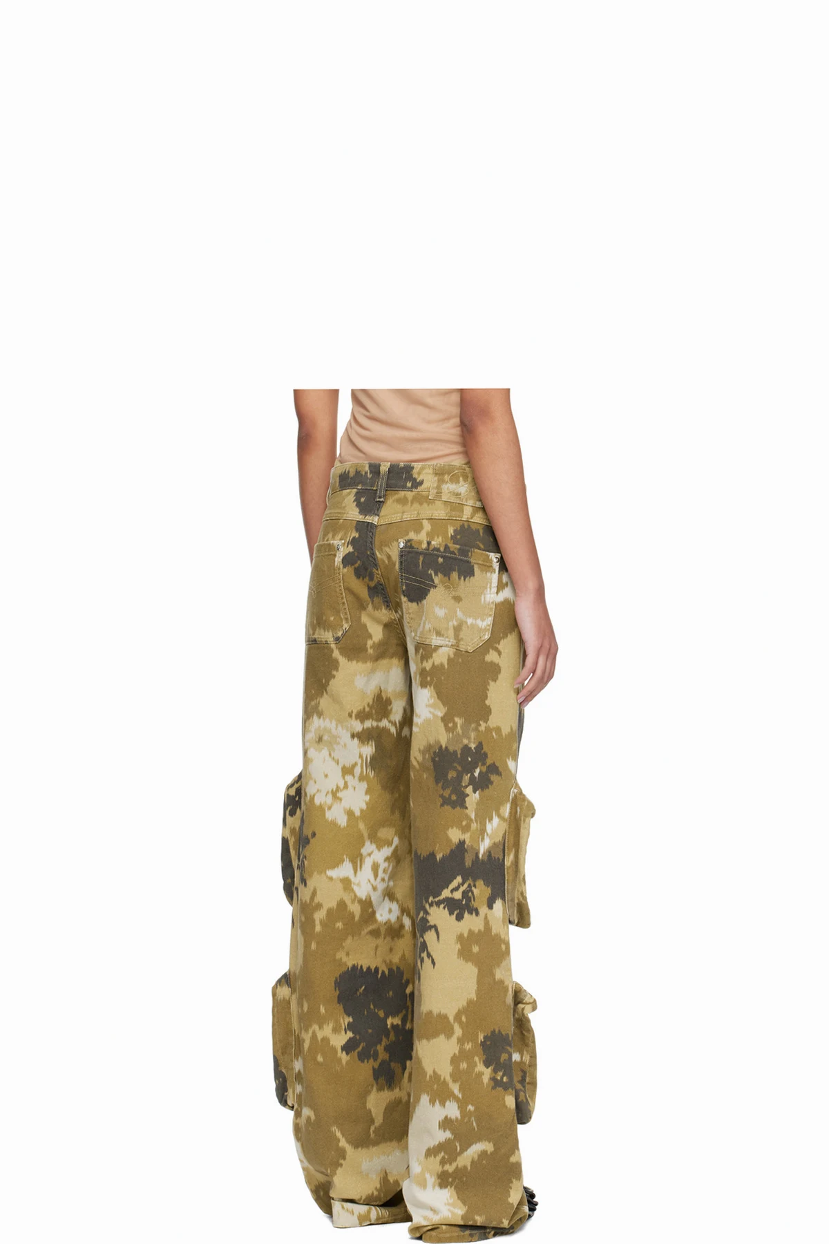 Handcrafted wide-leg stretch denim cargo pants. Camouflage pattern printed throughout.