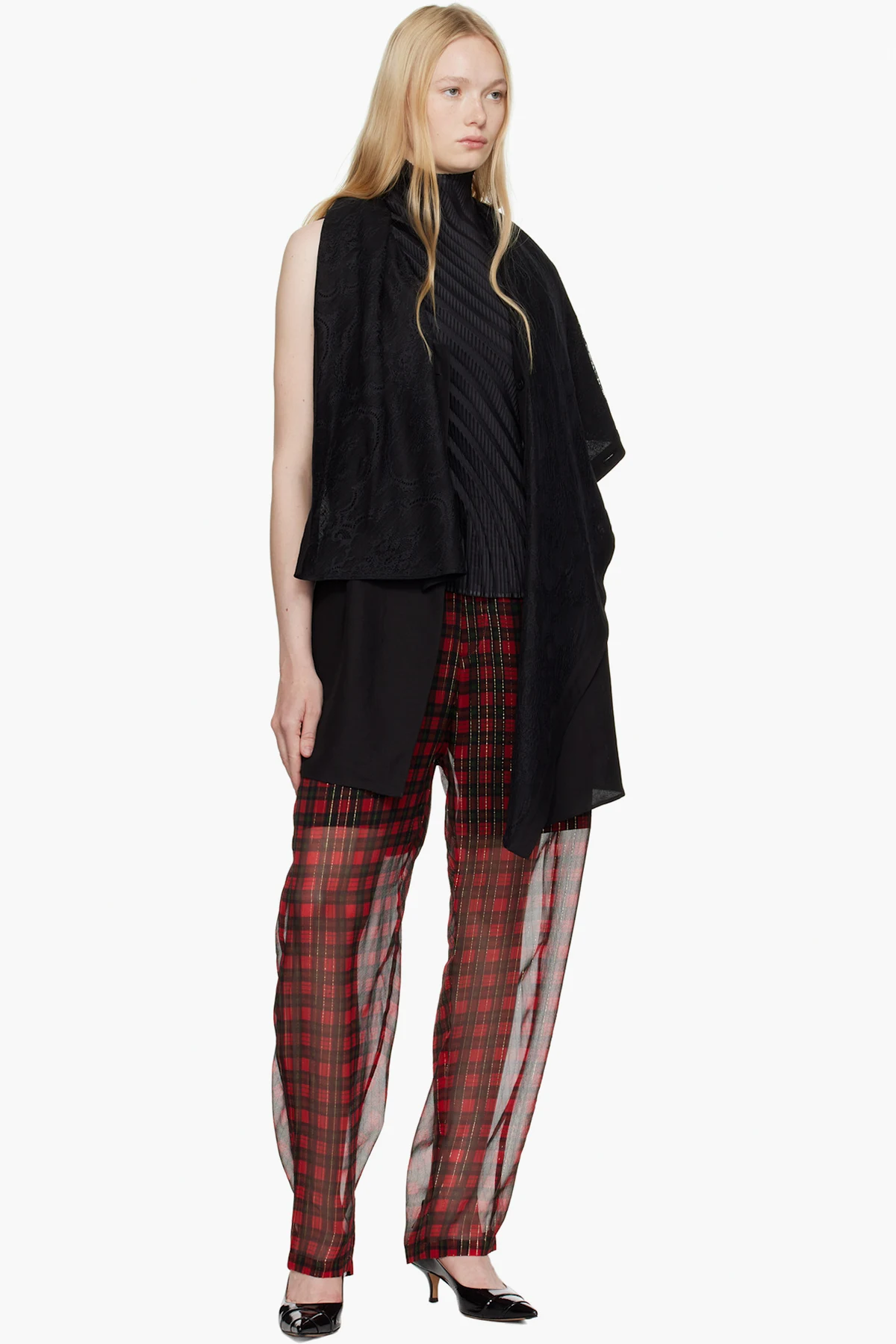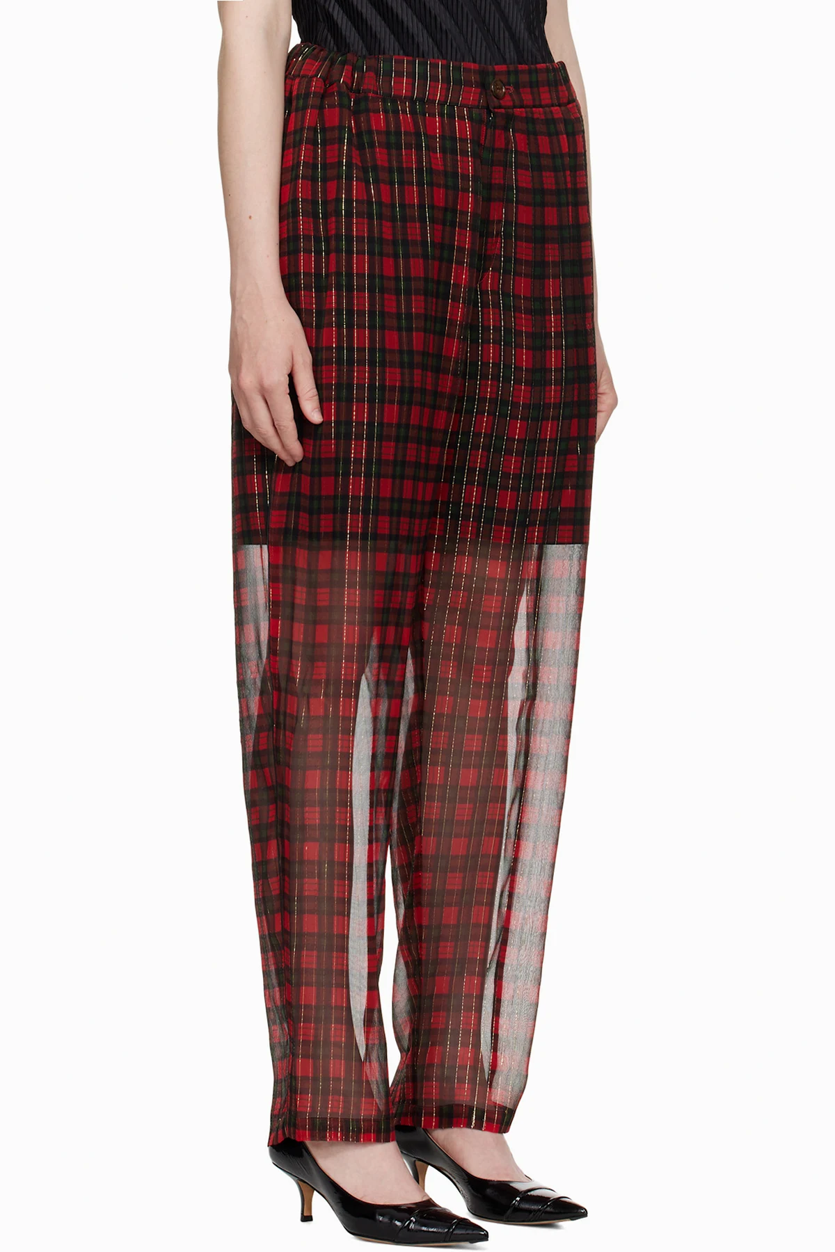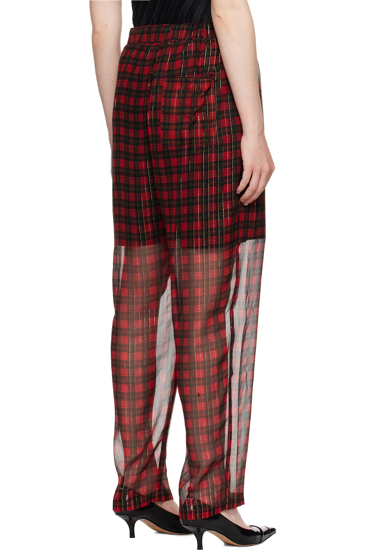 Semi-sheer silk-blend gauze trousers. Check pattern and metallic thread detailing throughout.