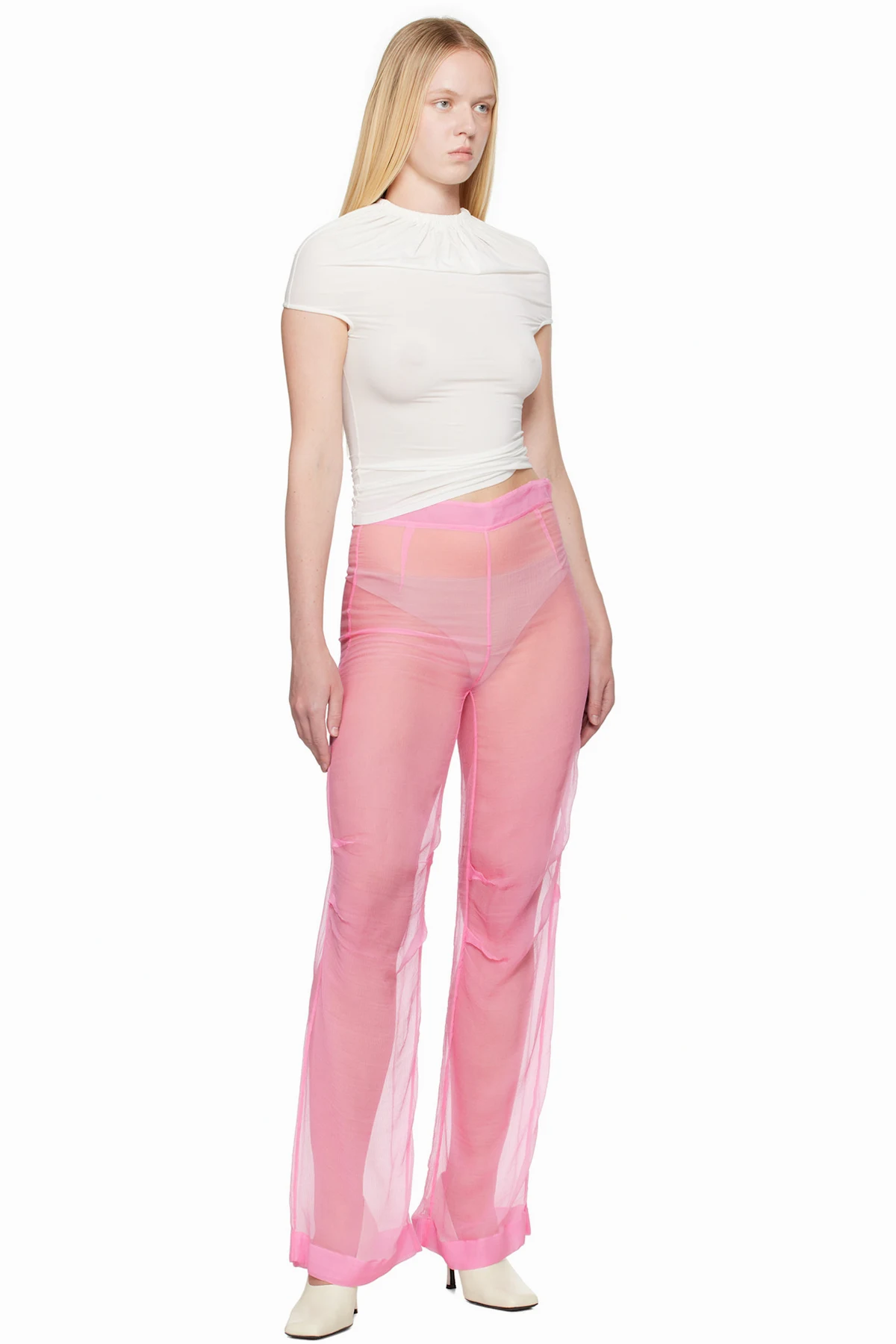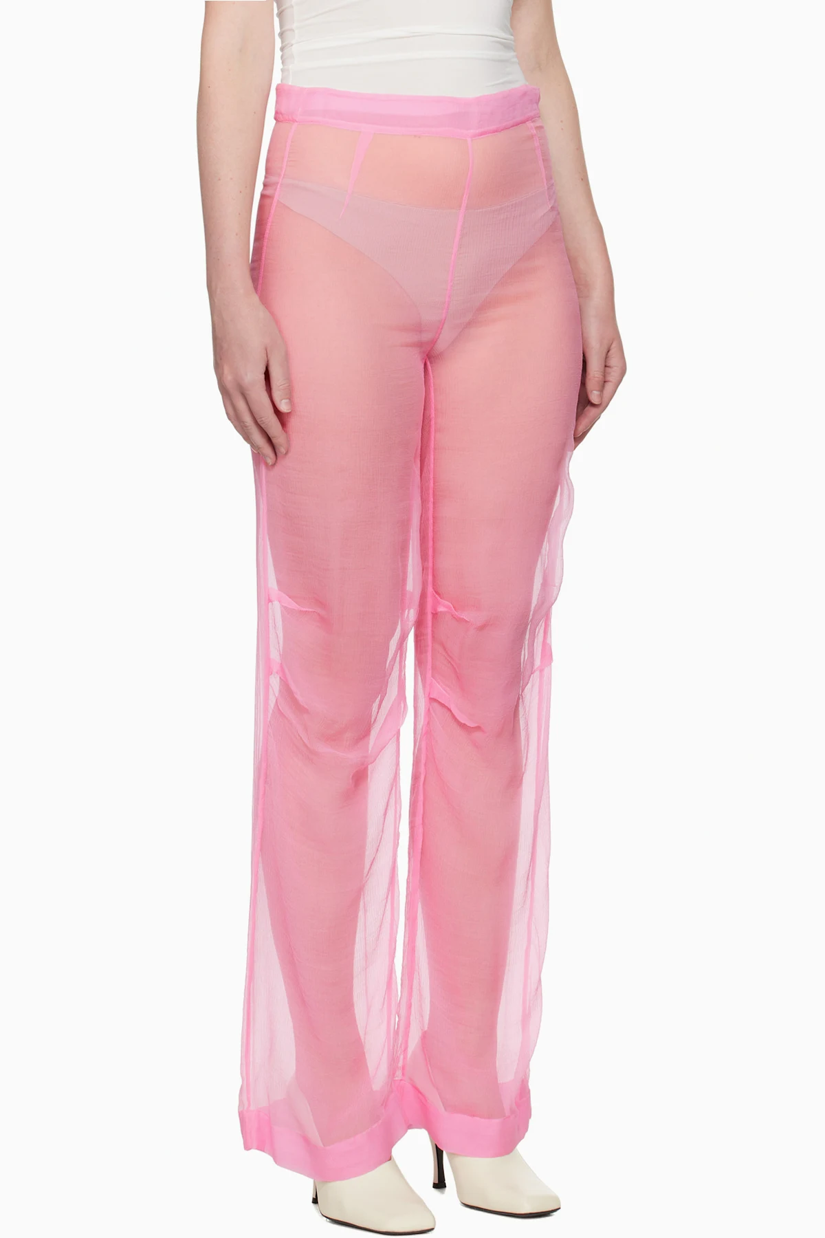 Sheer silk chiffon trousers.