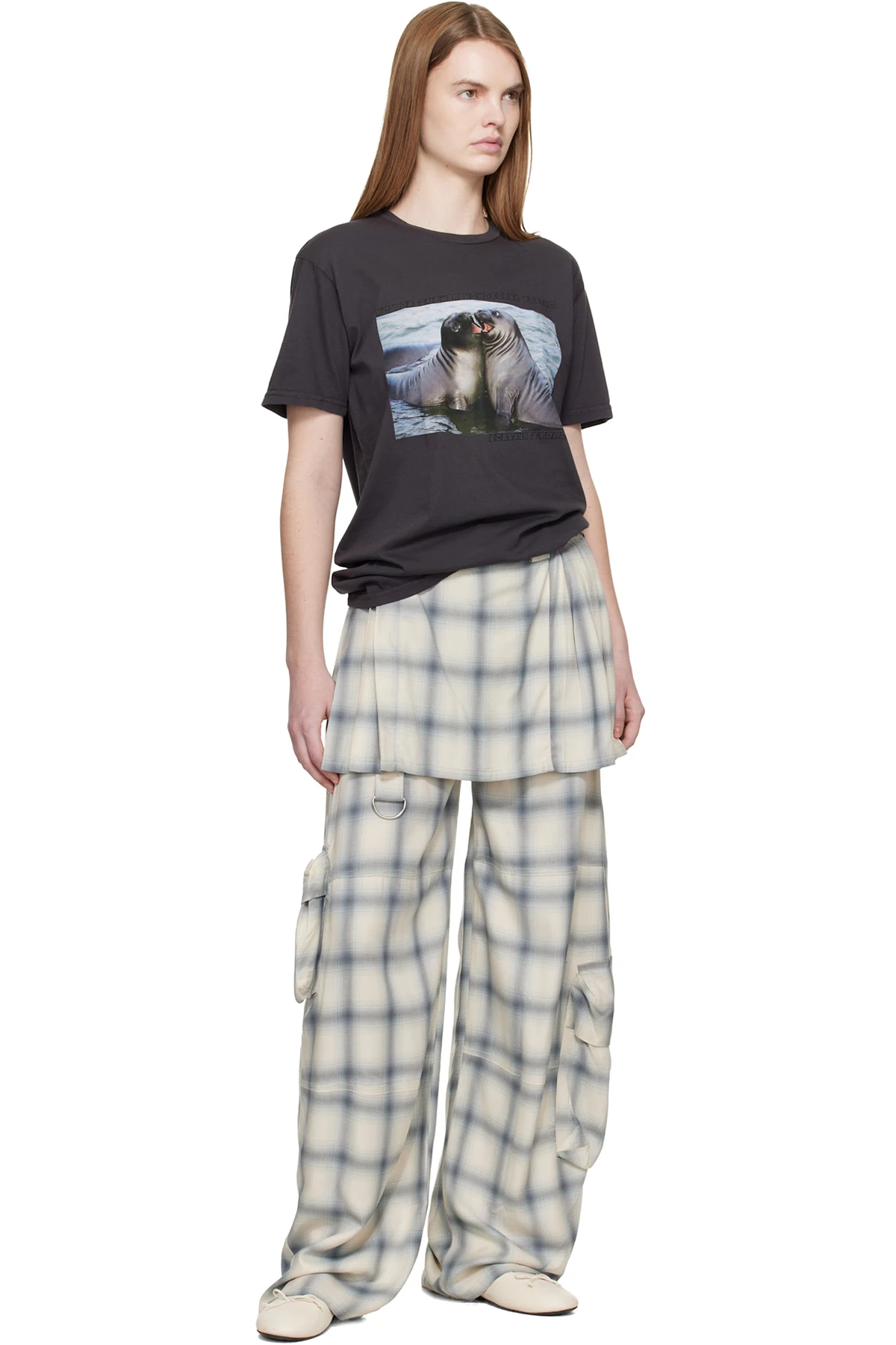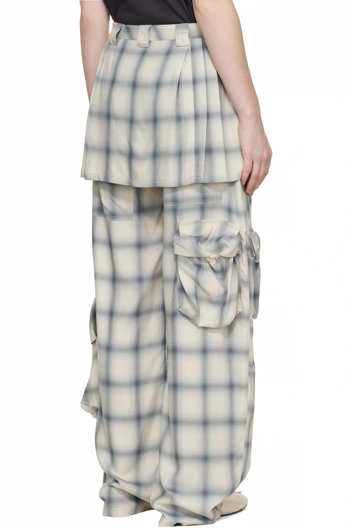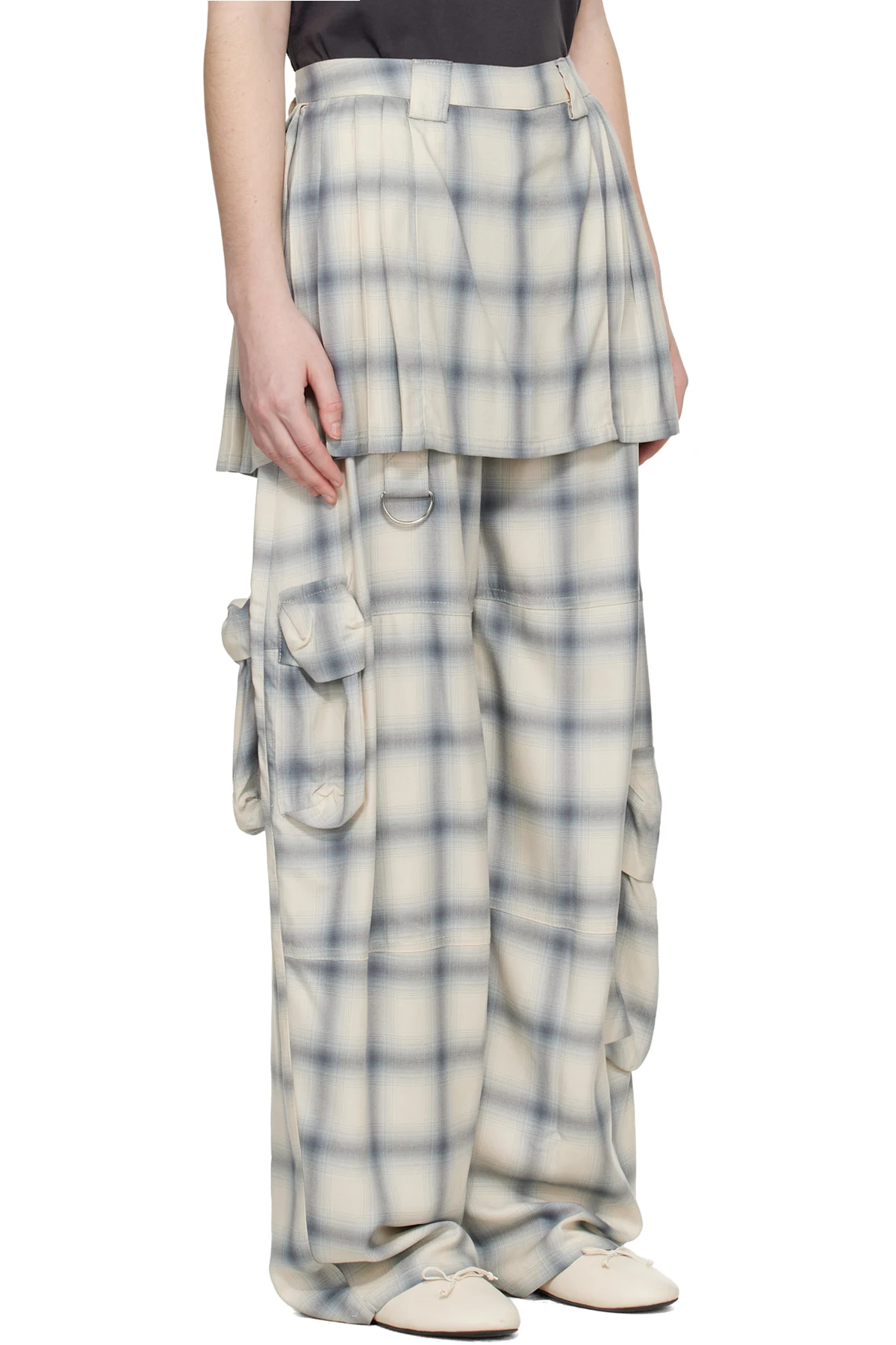 Sateen cargo pants. Integrated pleated skirt-style overlay.