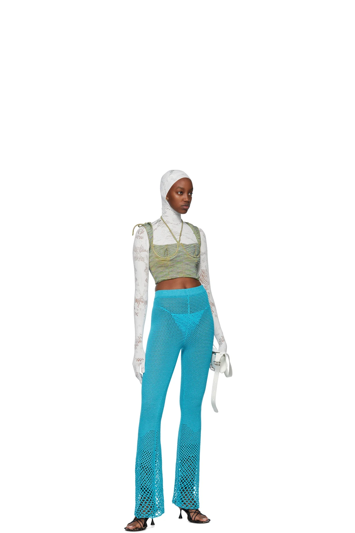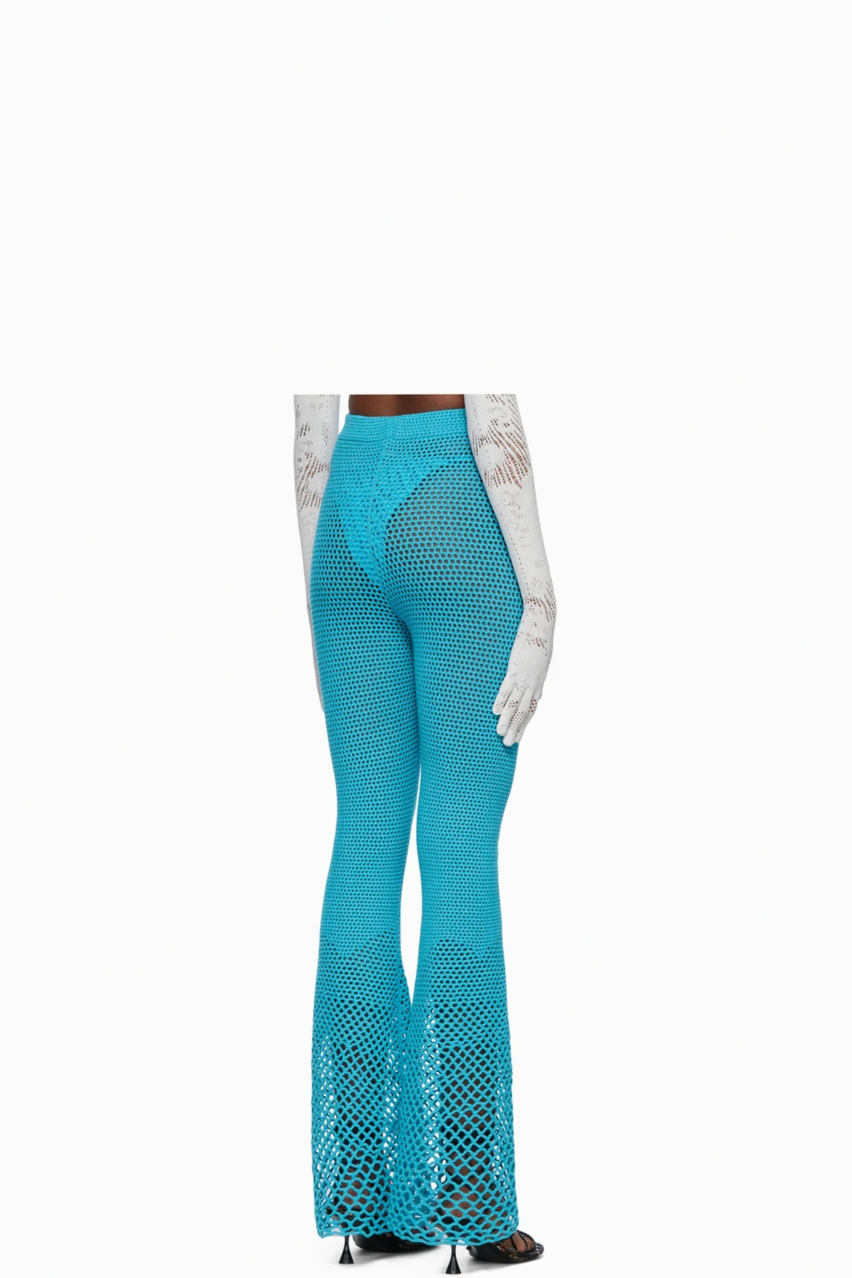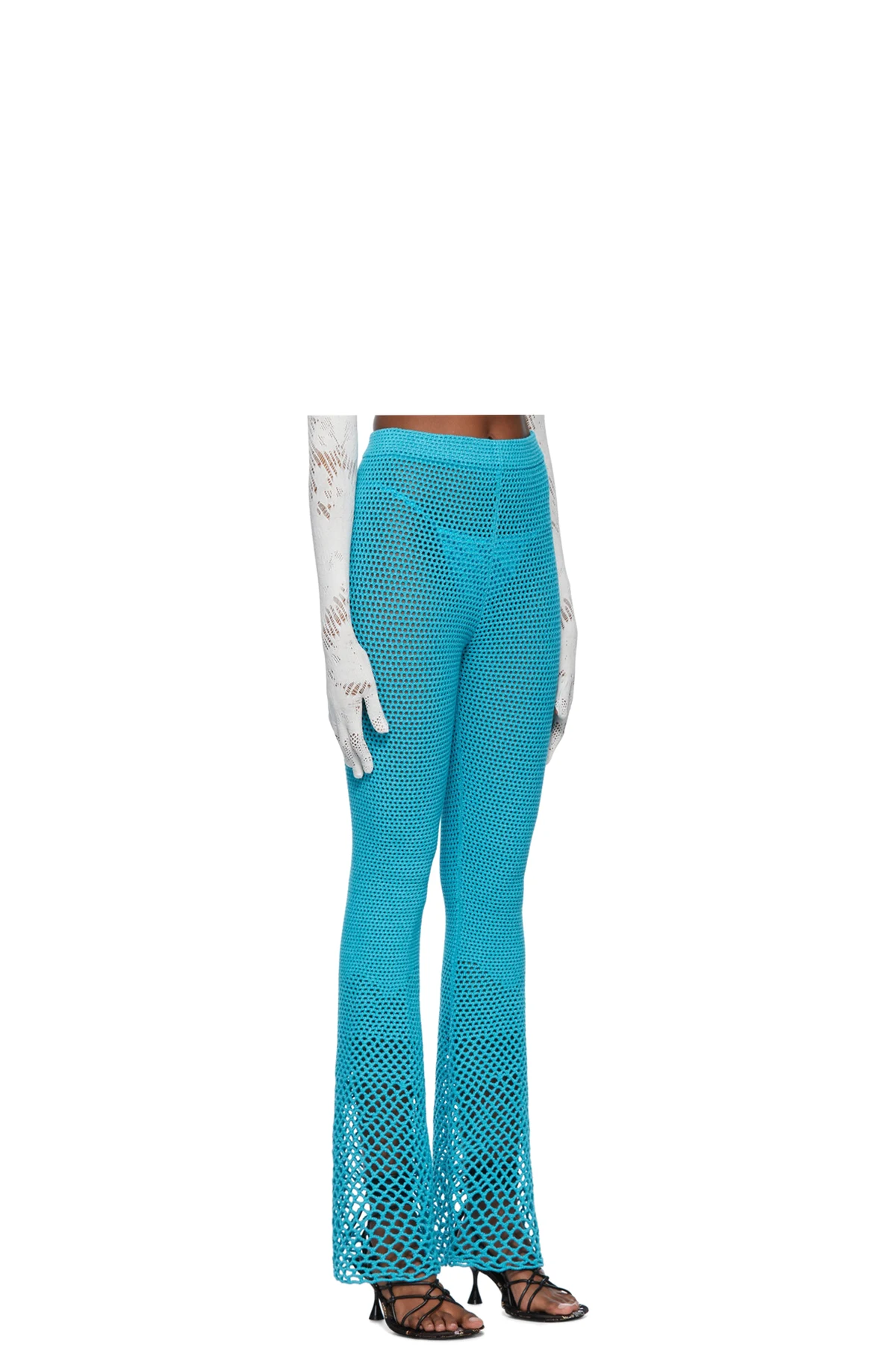 Handcrafted open crocheted stretch acrylic lounge pants. Elasticized waistband.