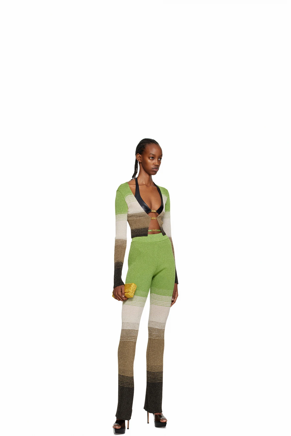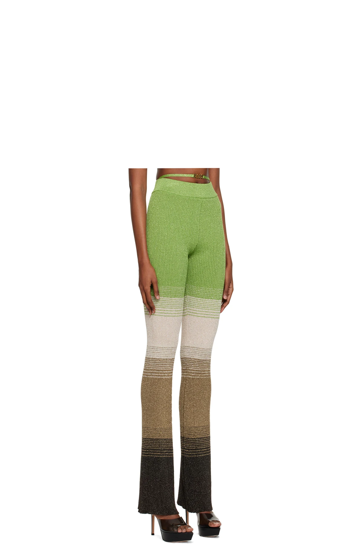 Flared rib knit viscose-blend lounge pants. Gradient pattern, stripes, and metallic thread detailing throughout.