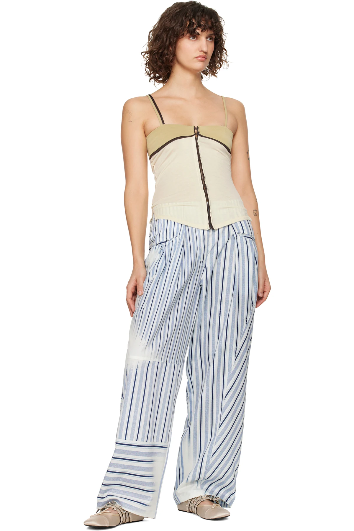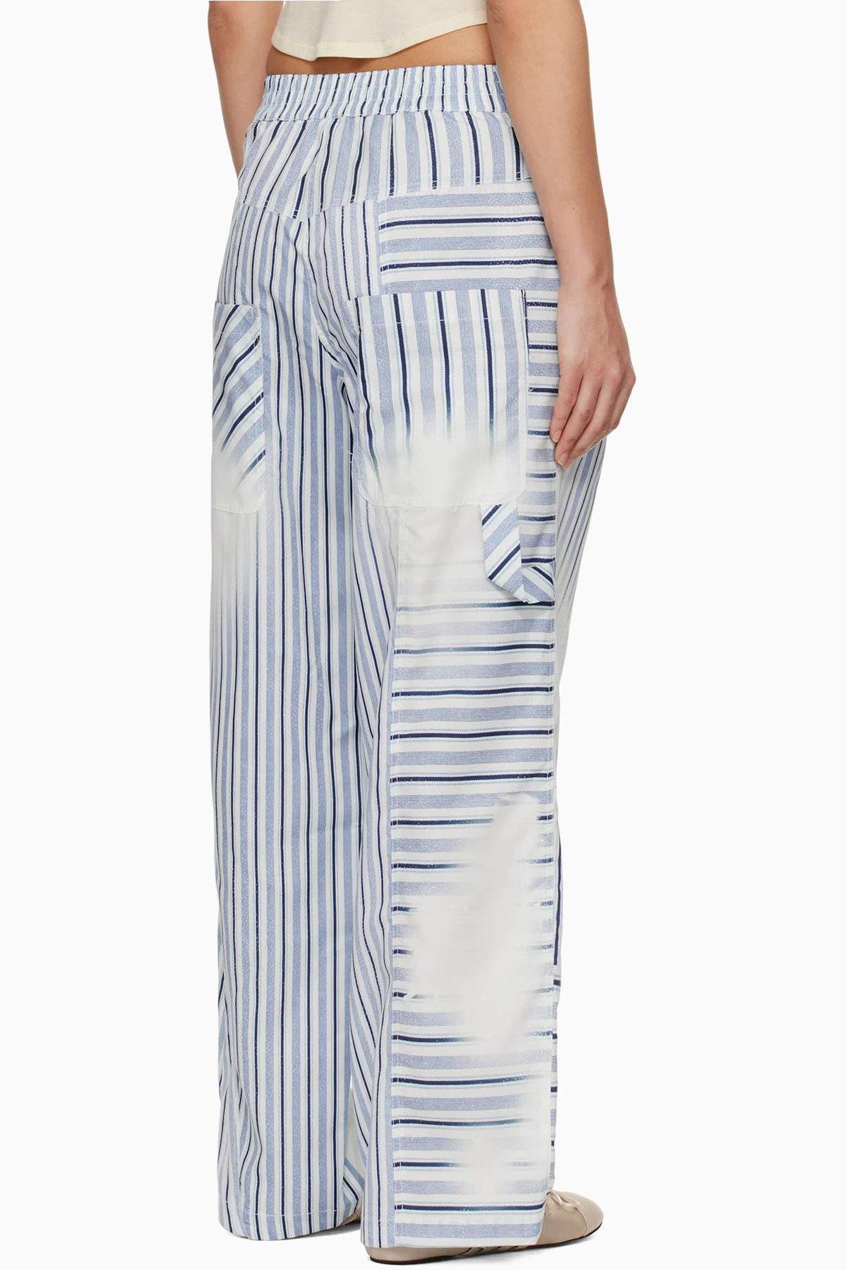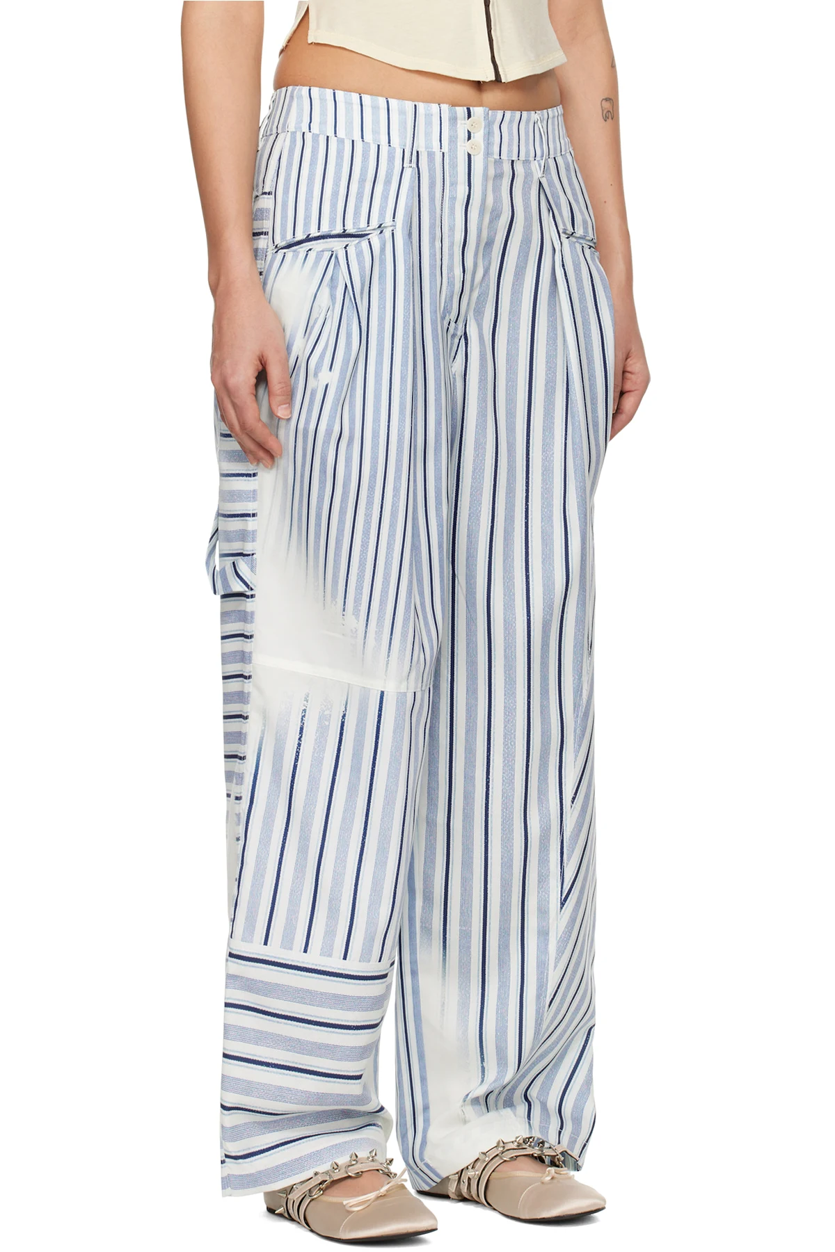 Polyester satin trousers. Stripes and faded detailing printed throughout.