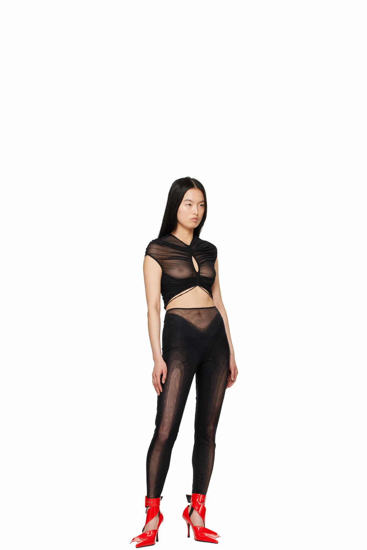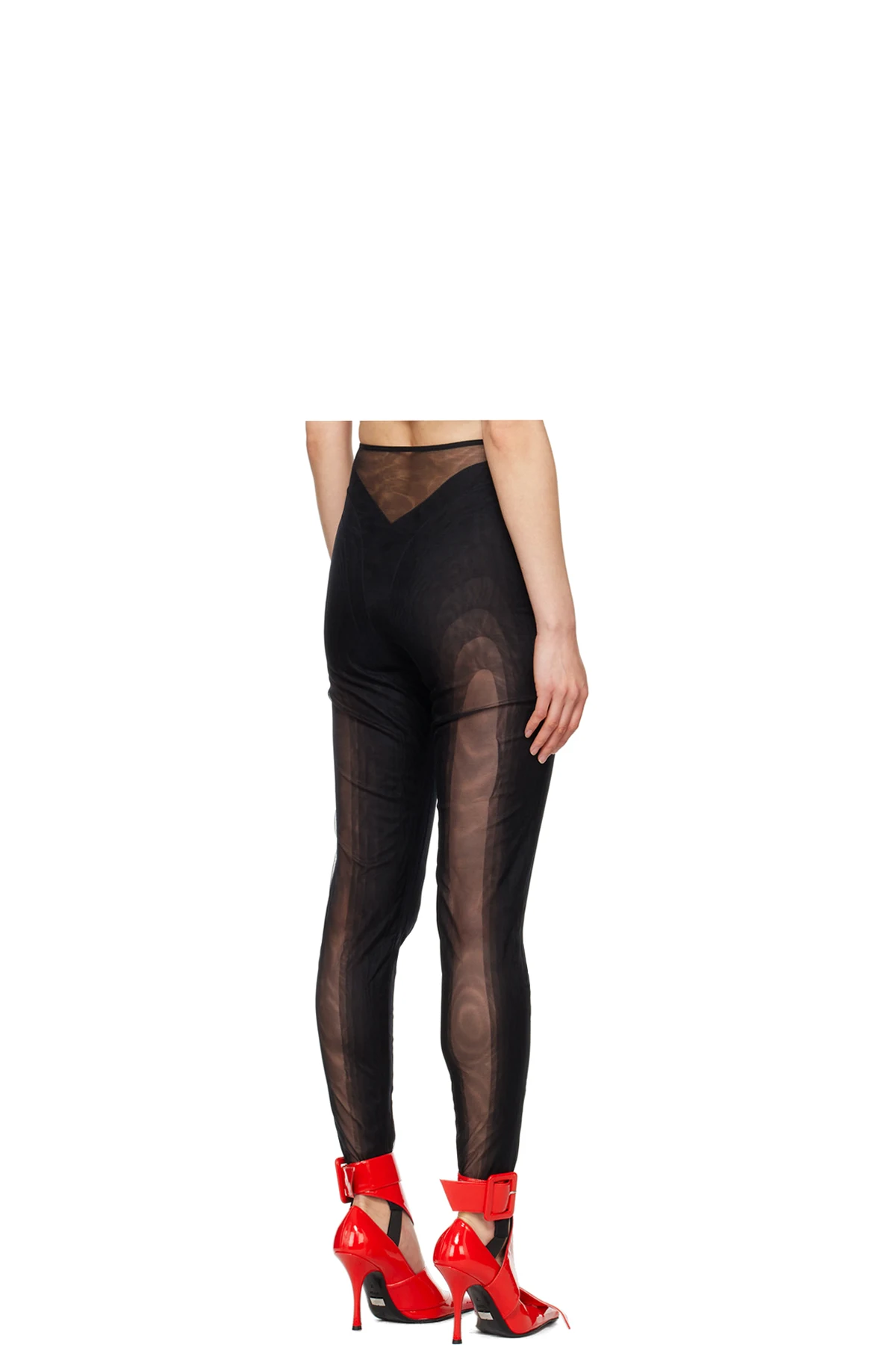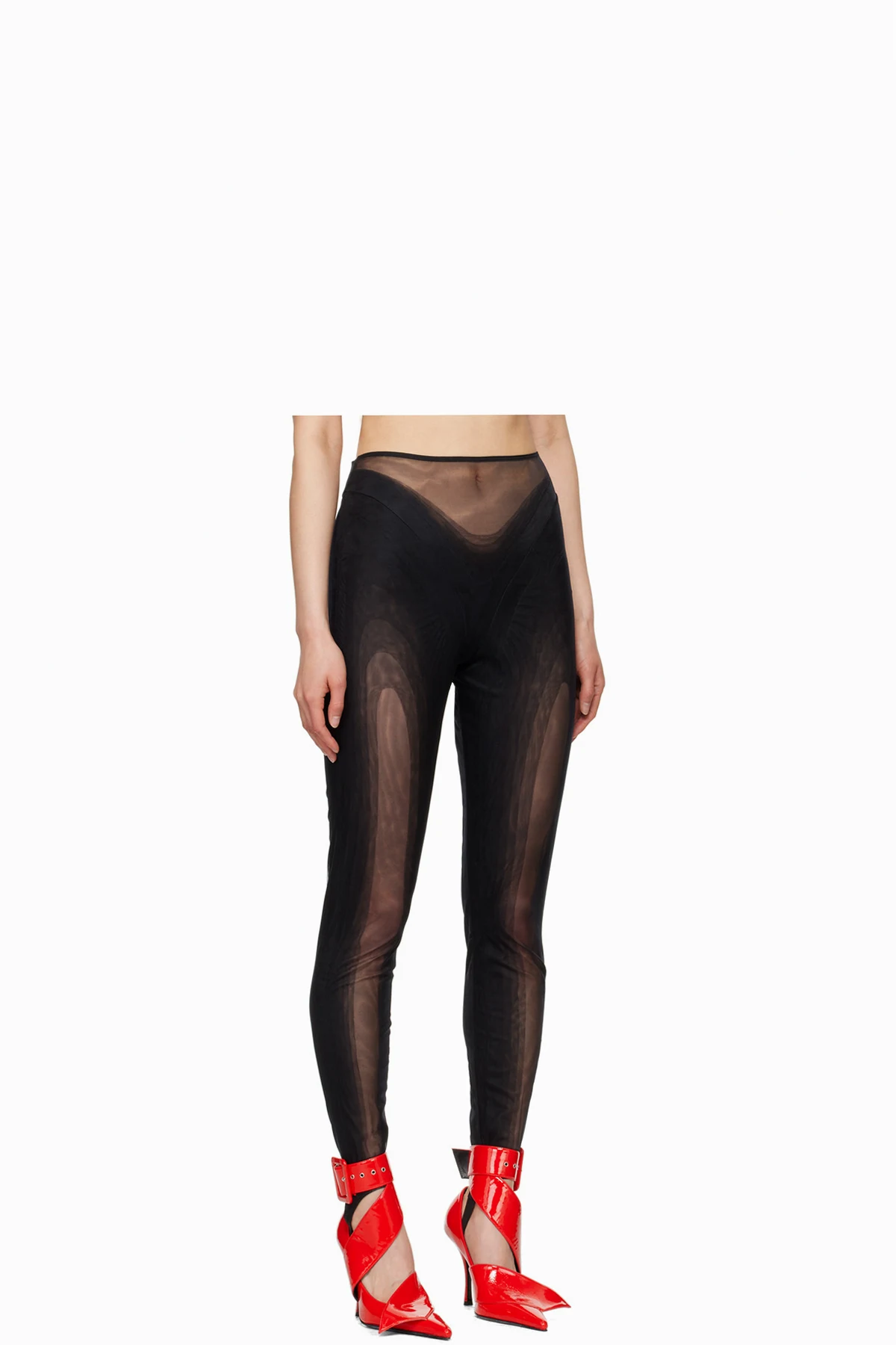 Sheer stretch nylon mesh leggings.