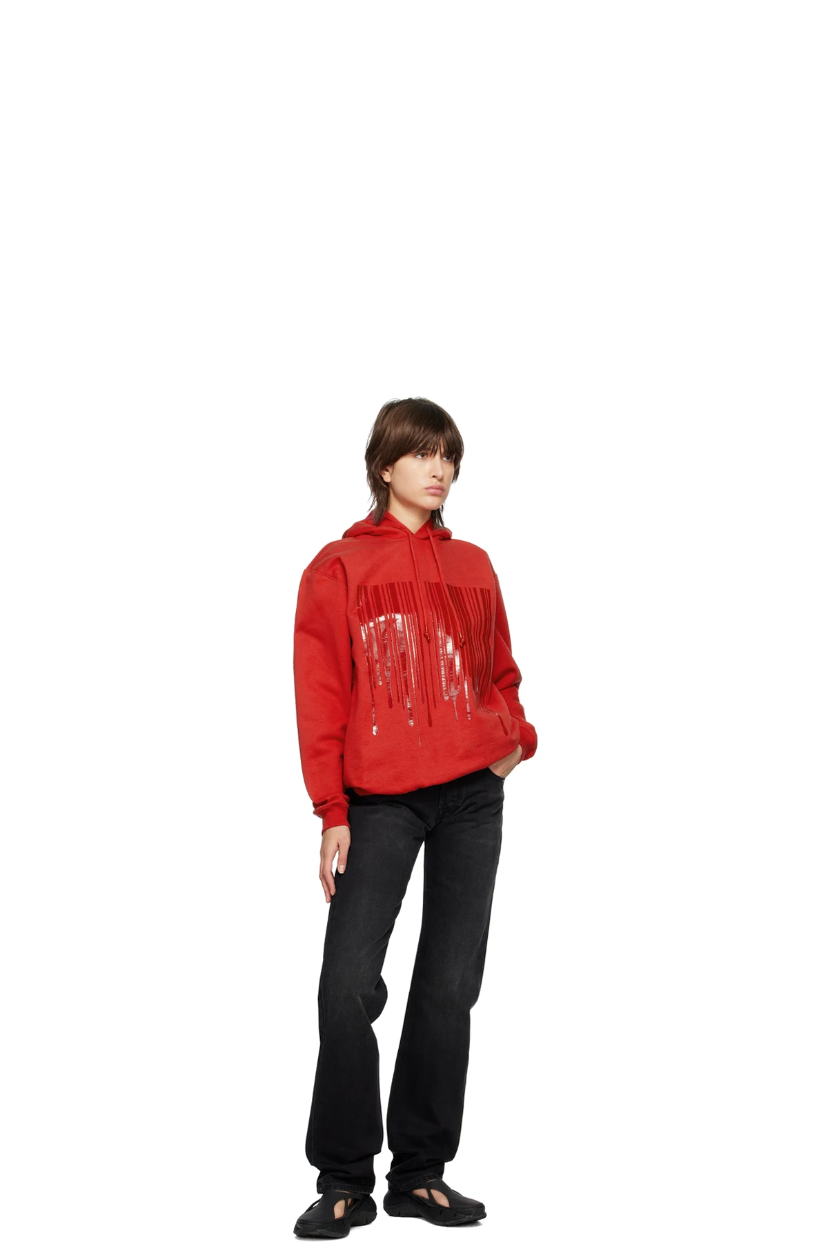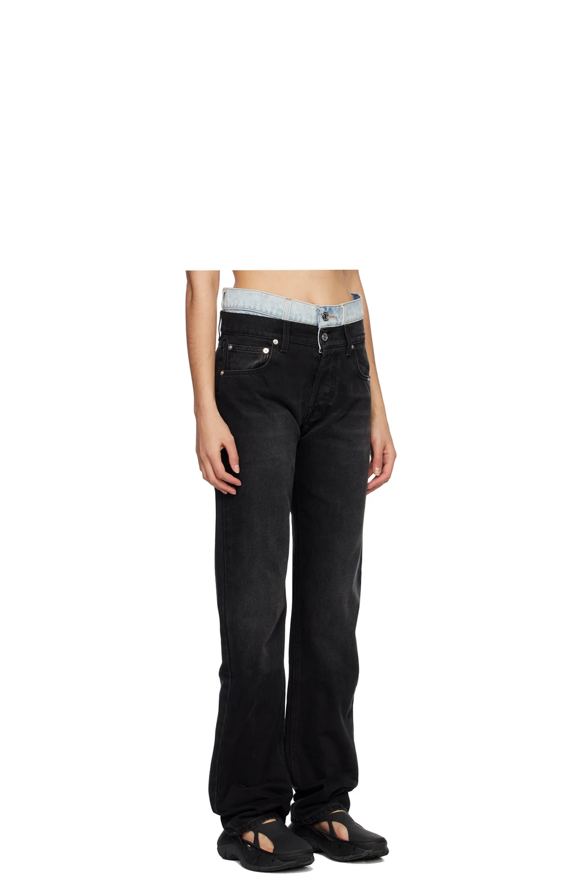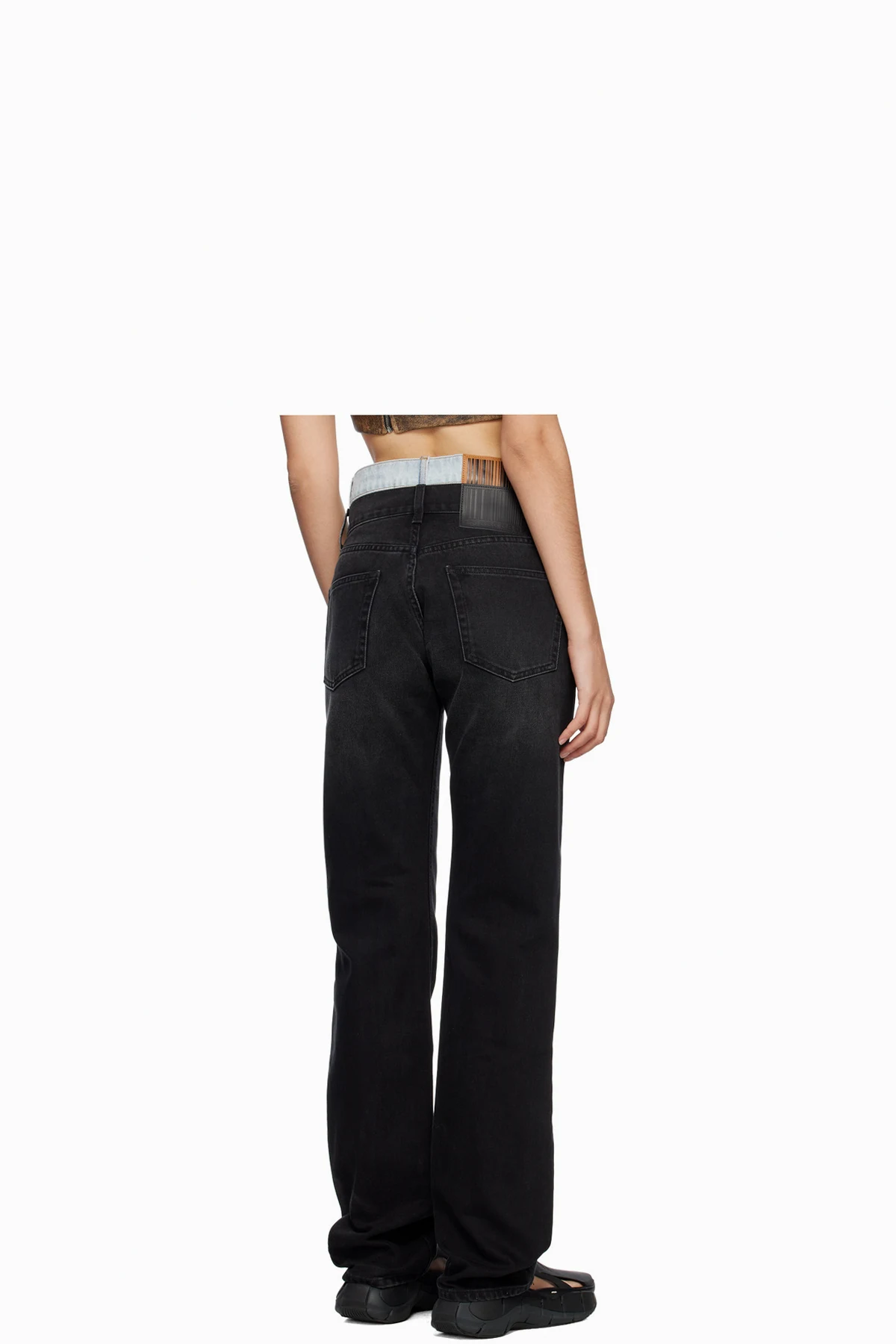 Non-stretch denim jeans. Fading and whiskering throughout.