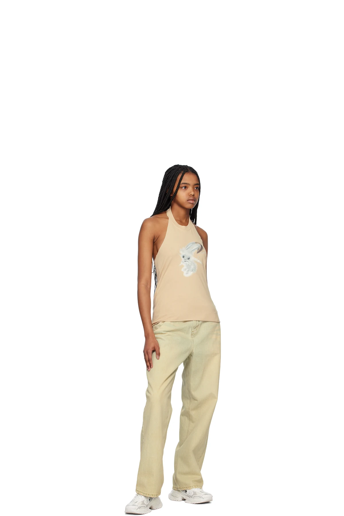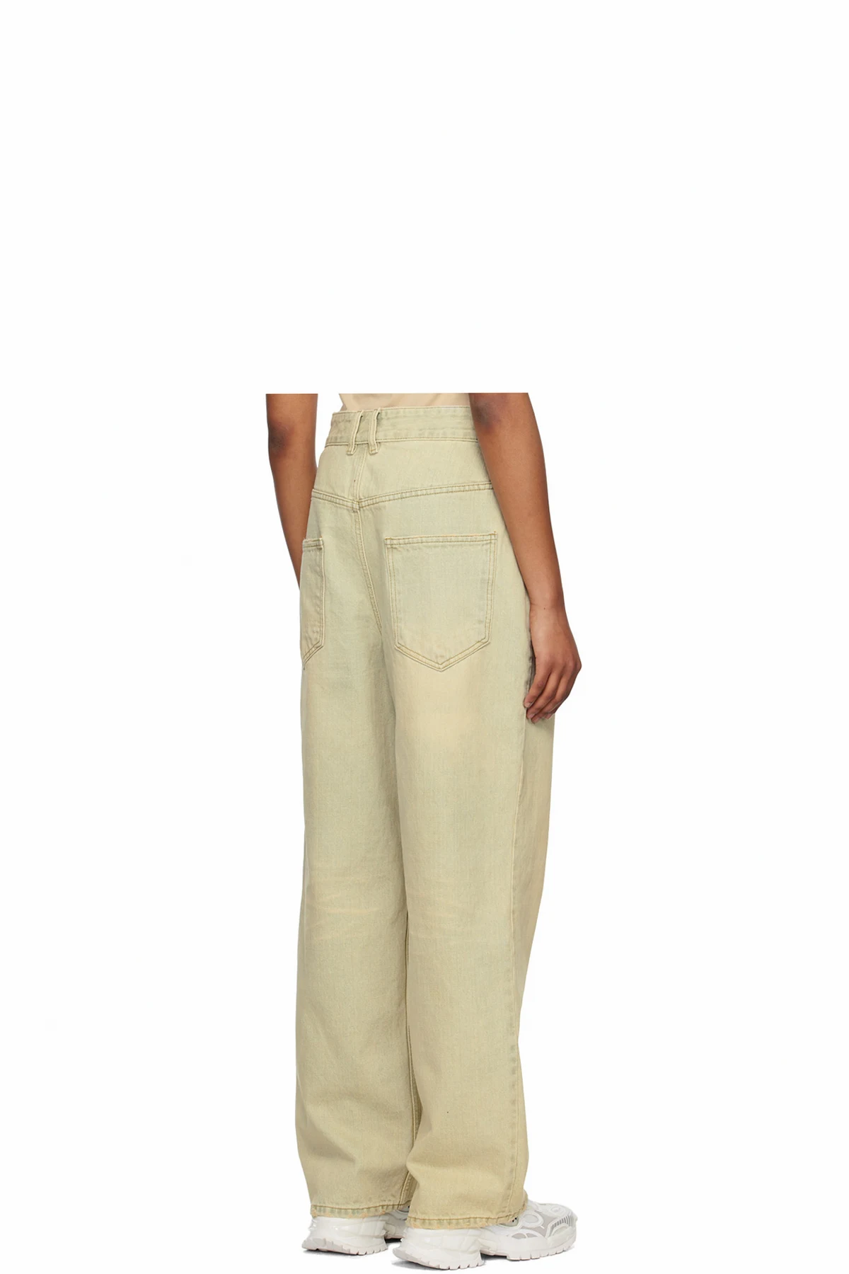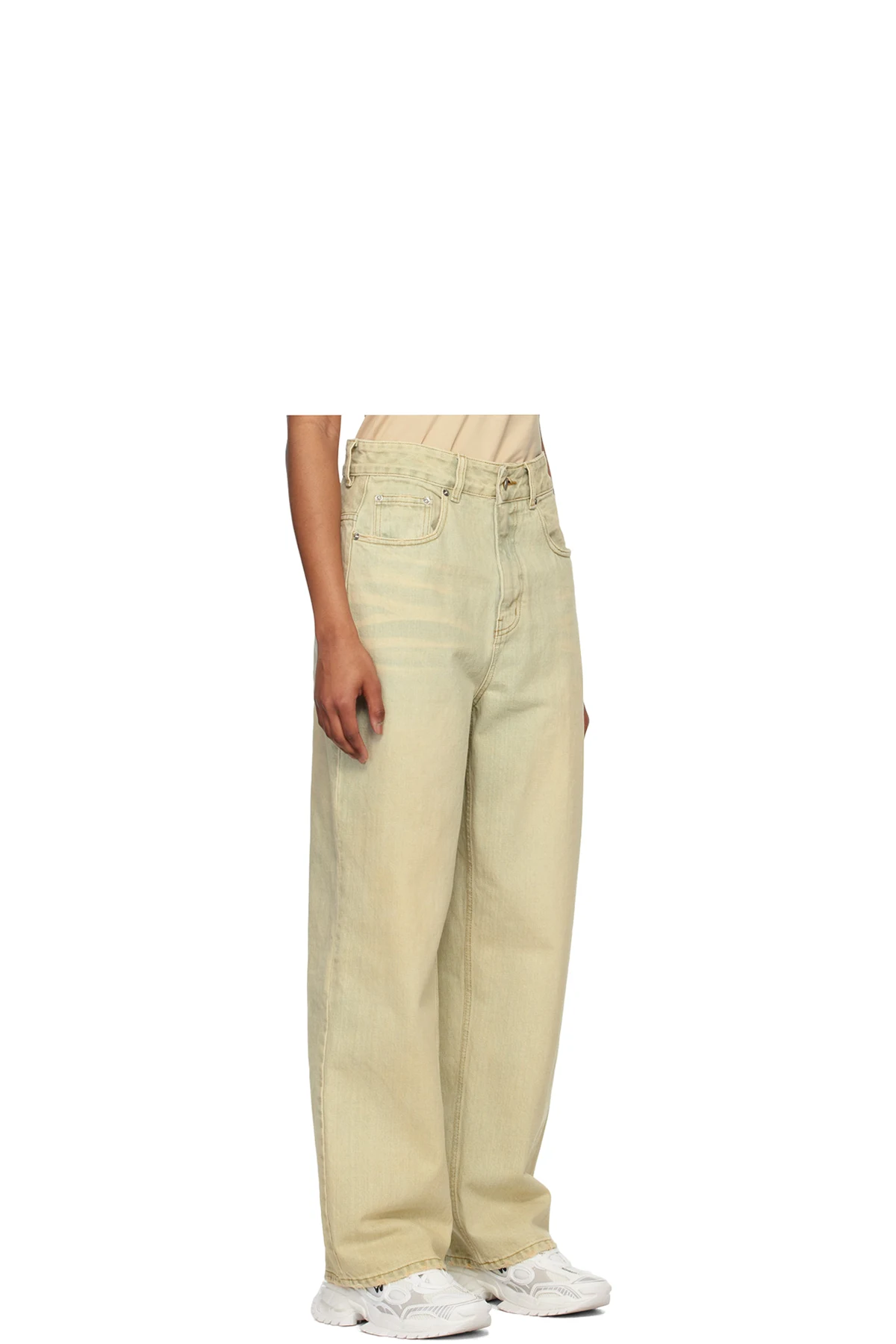 Wide-leg non-stretch denim jeans. Fading, whiskering, and distressing throughout.