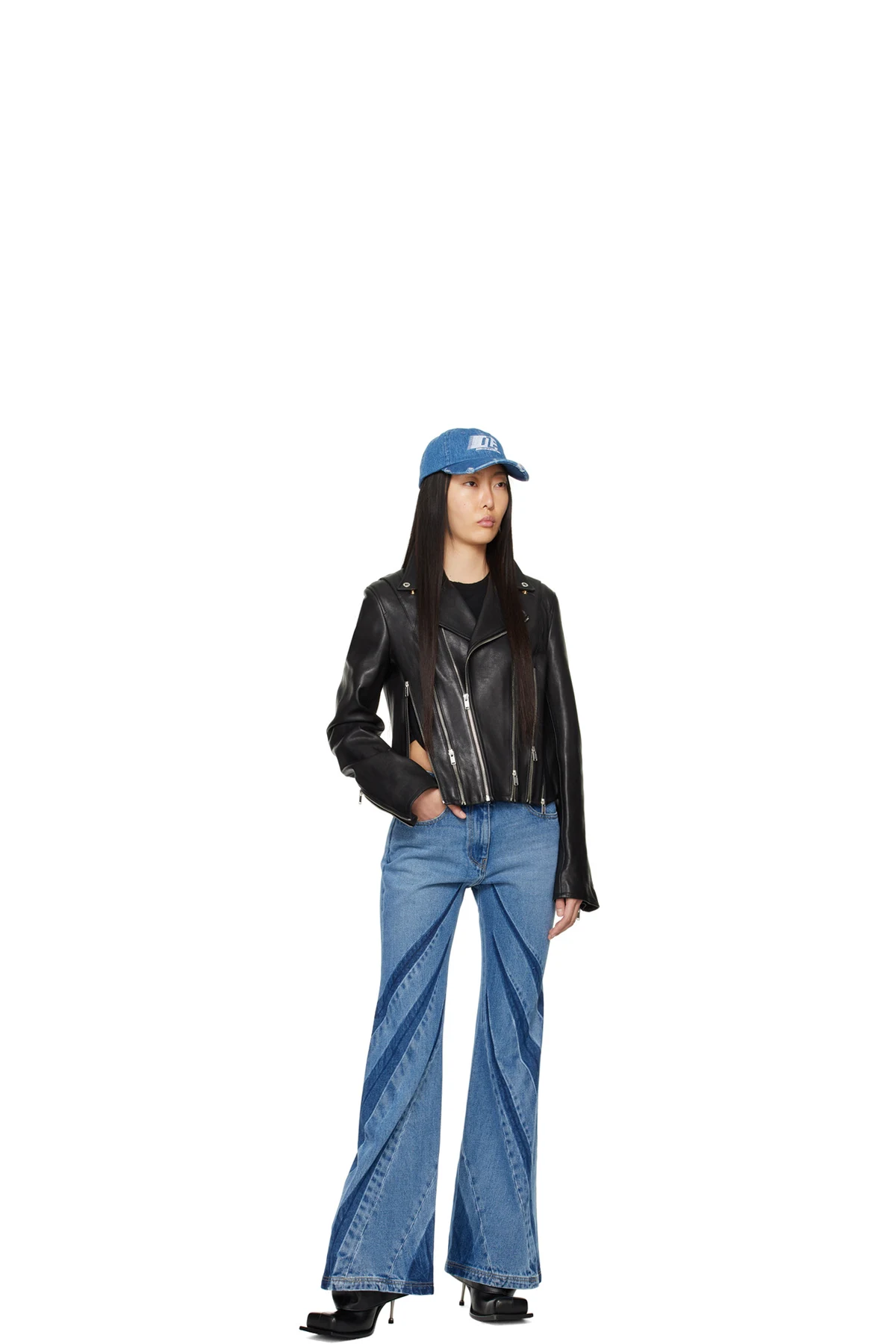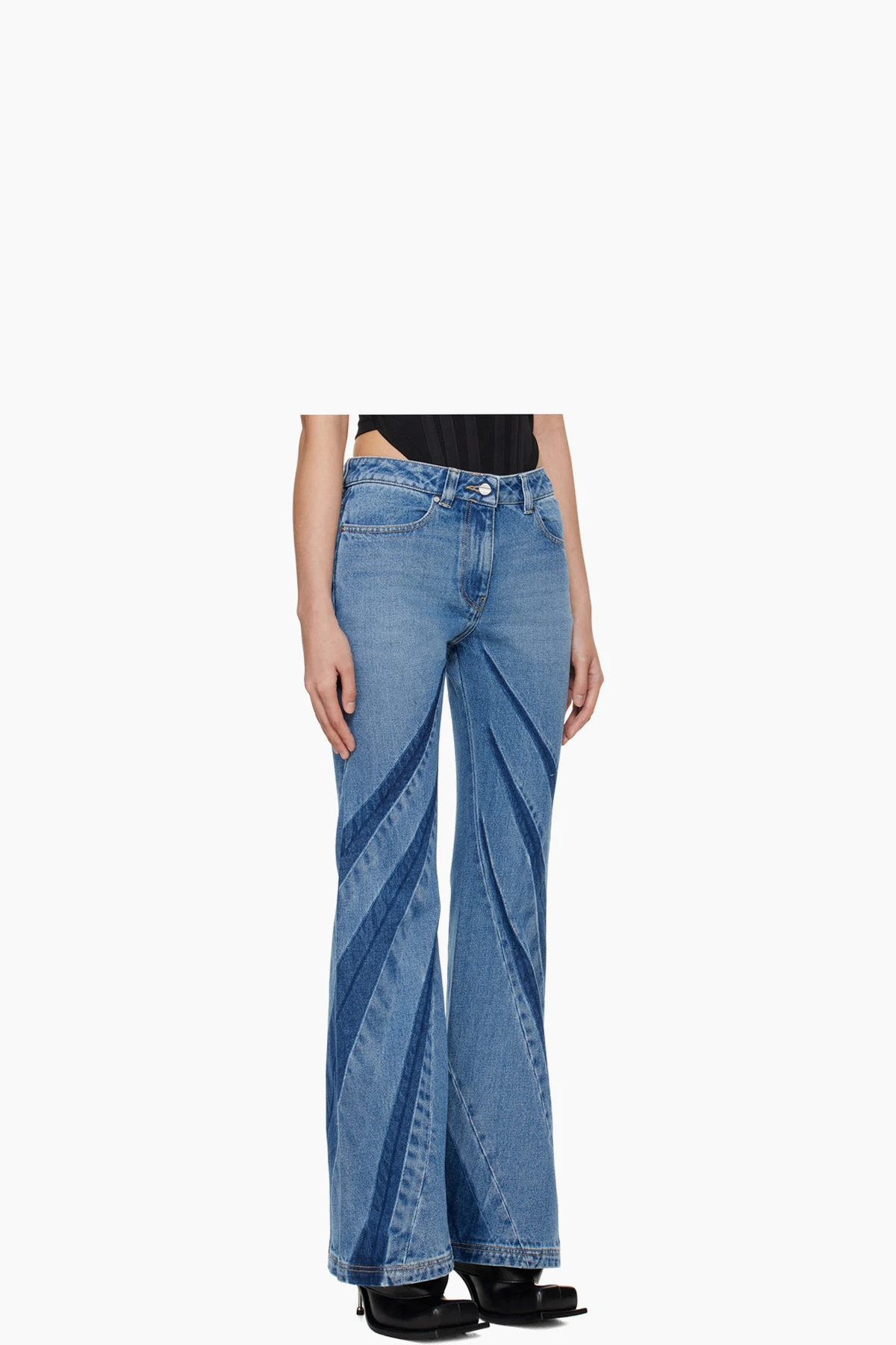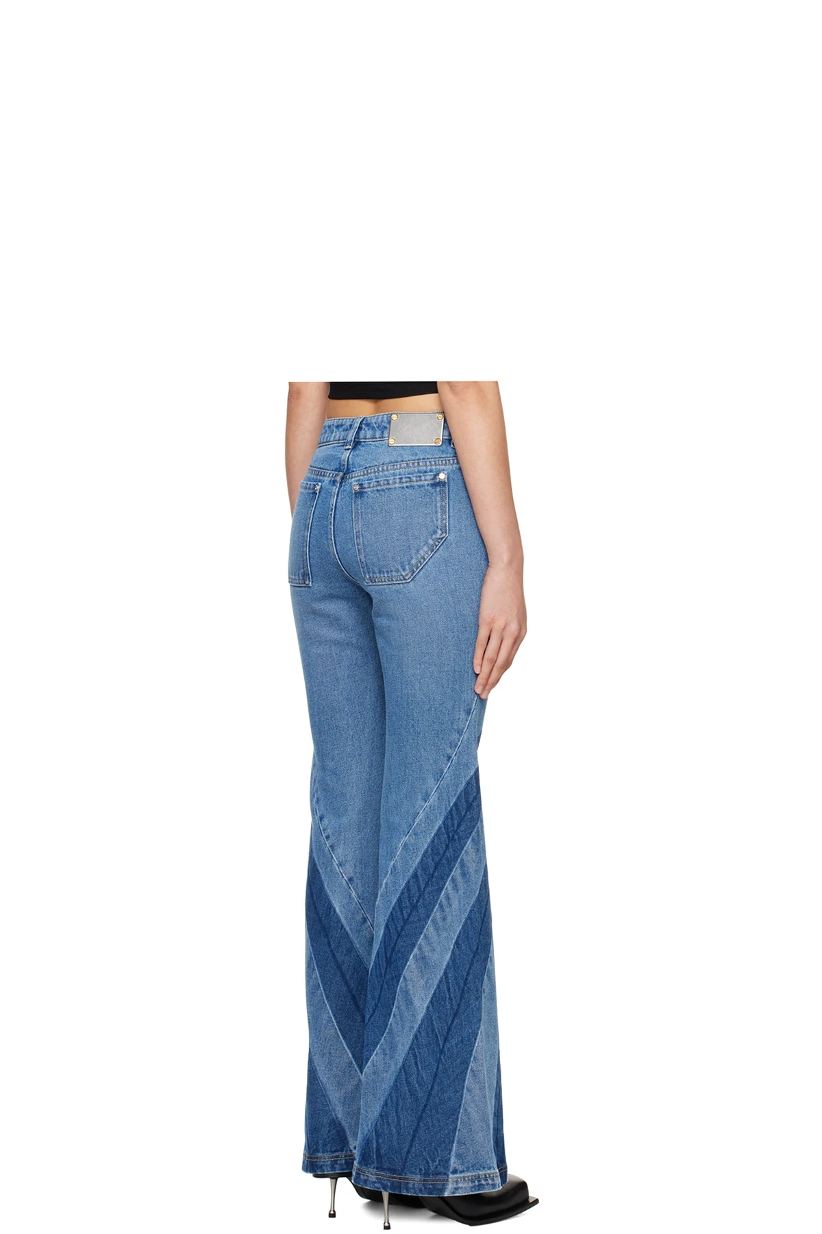 Flared non-stretch denim jeans. Fading and whiskering throughout.