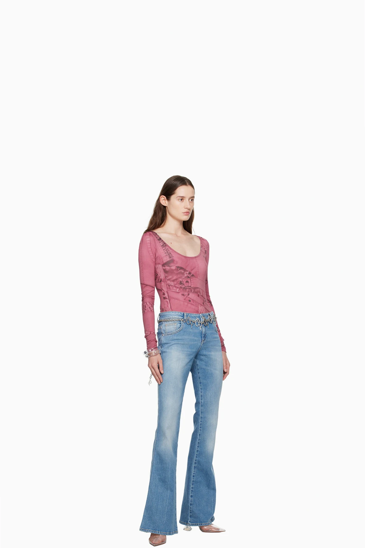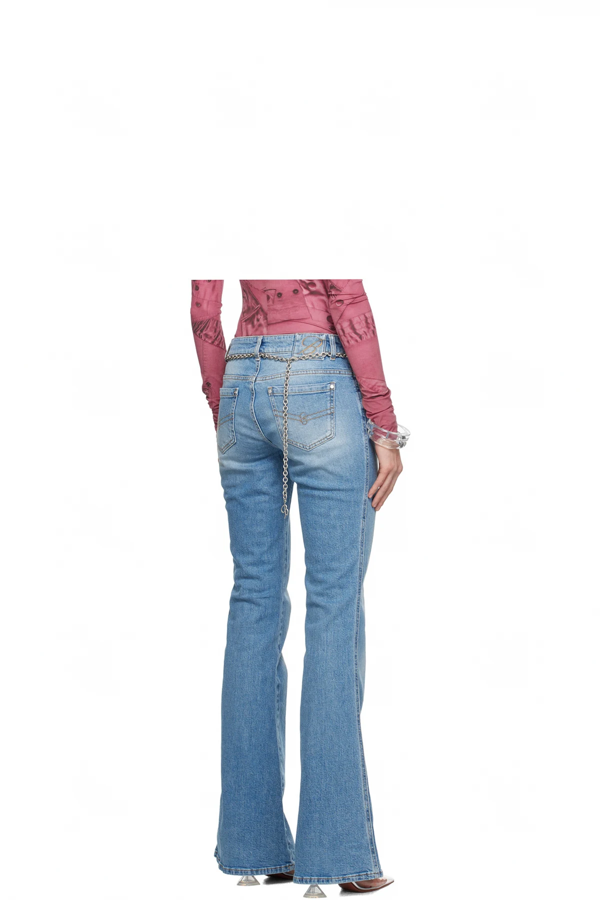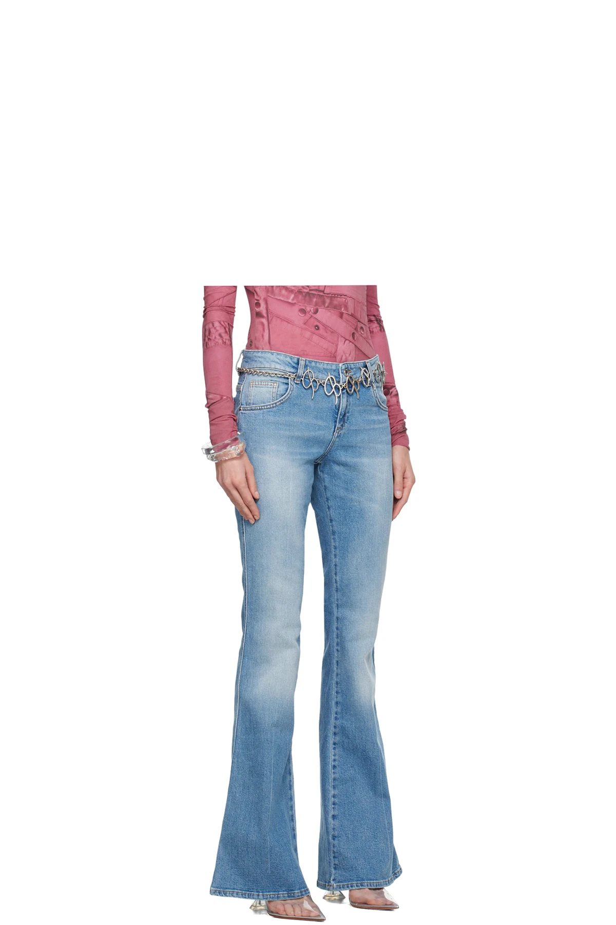 Stretch denim jeans. Fading and whiskering throughout.