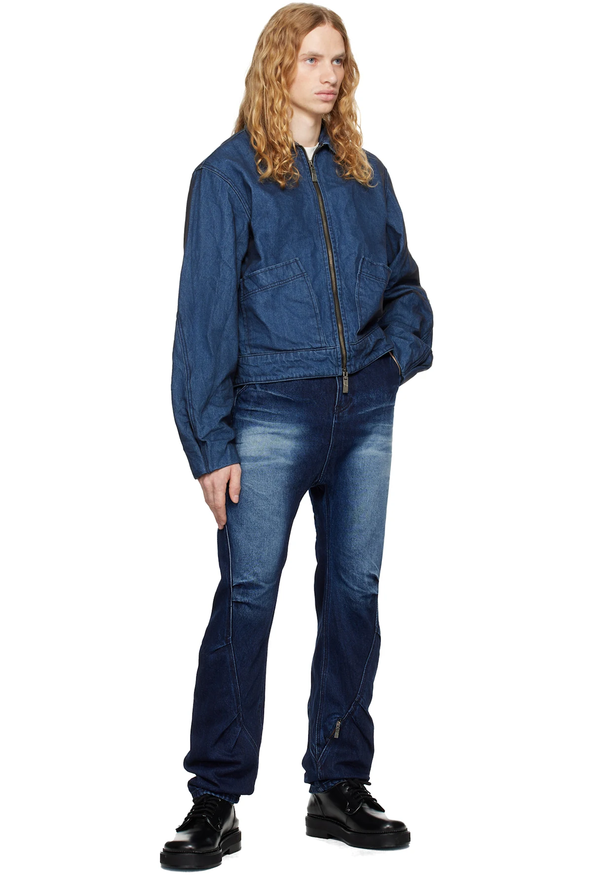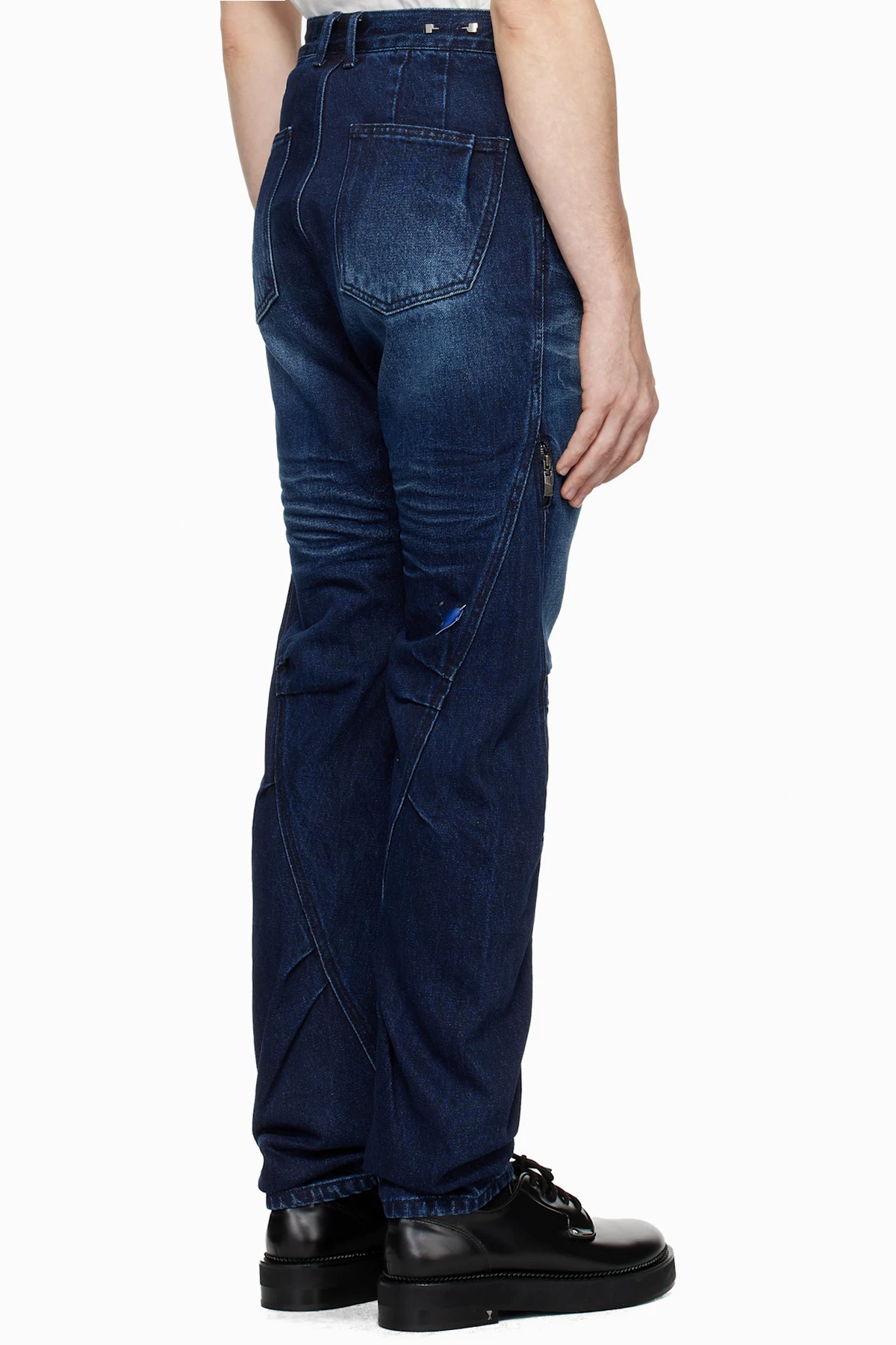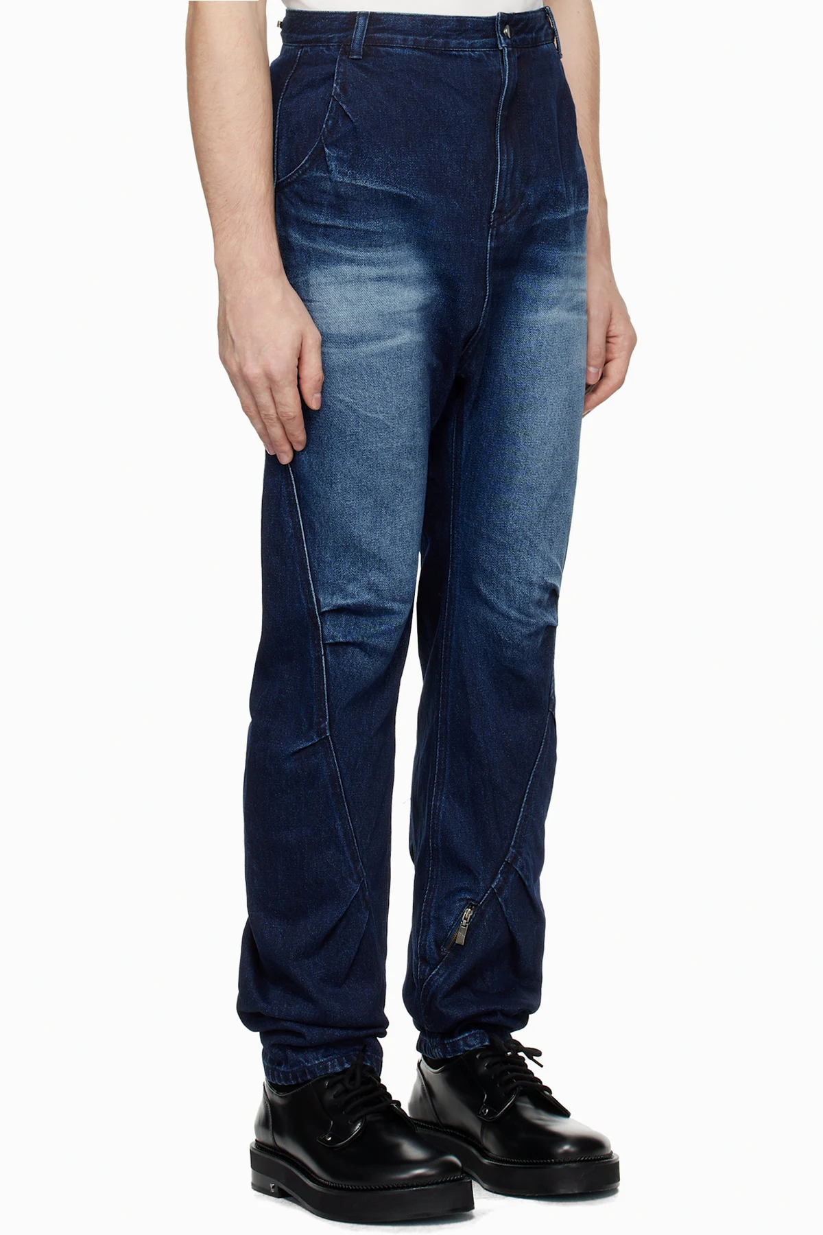 Non-stretch denim jeans. Fading, gathering, and whiskering throughout.