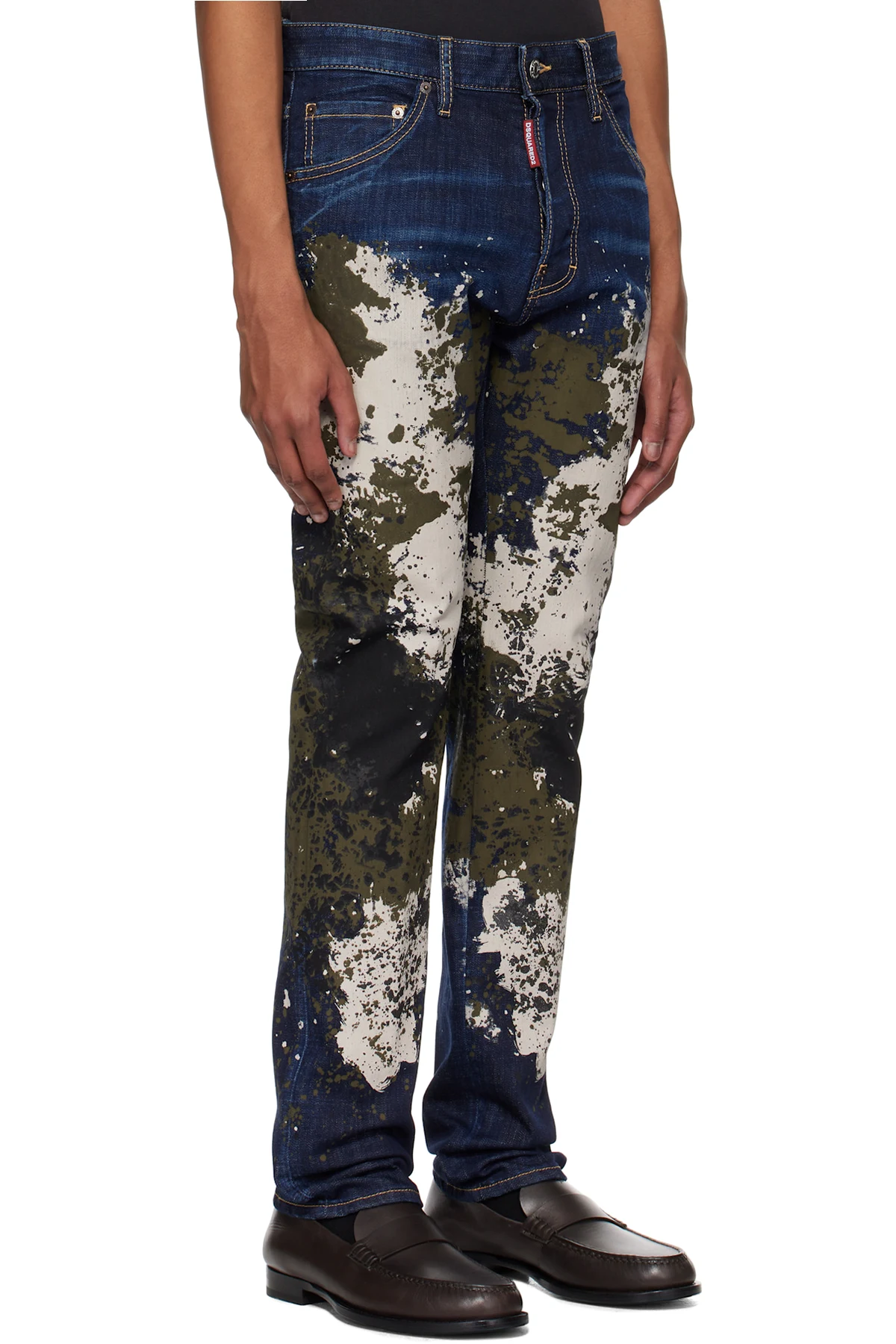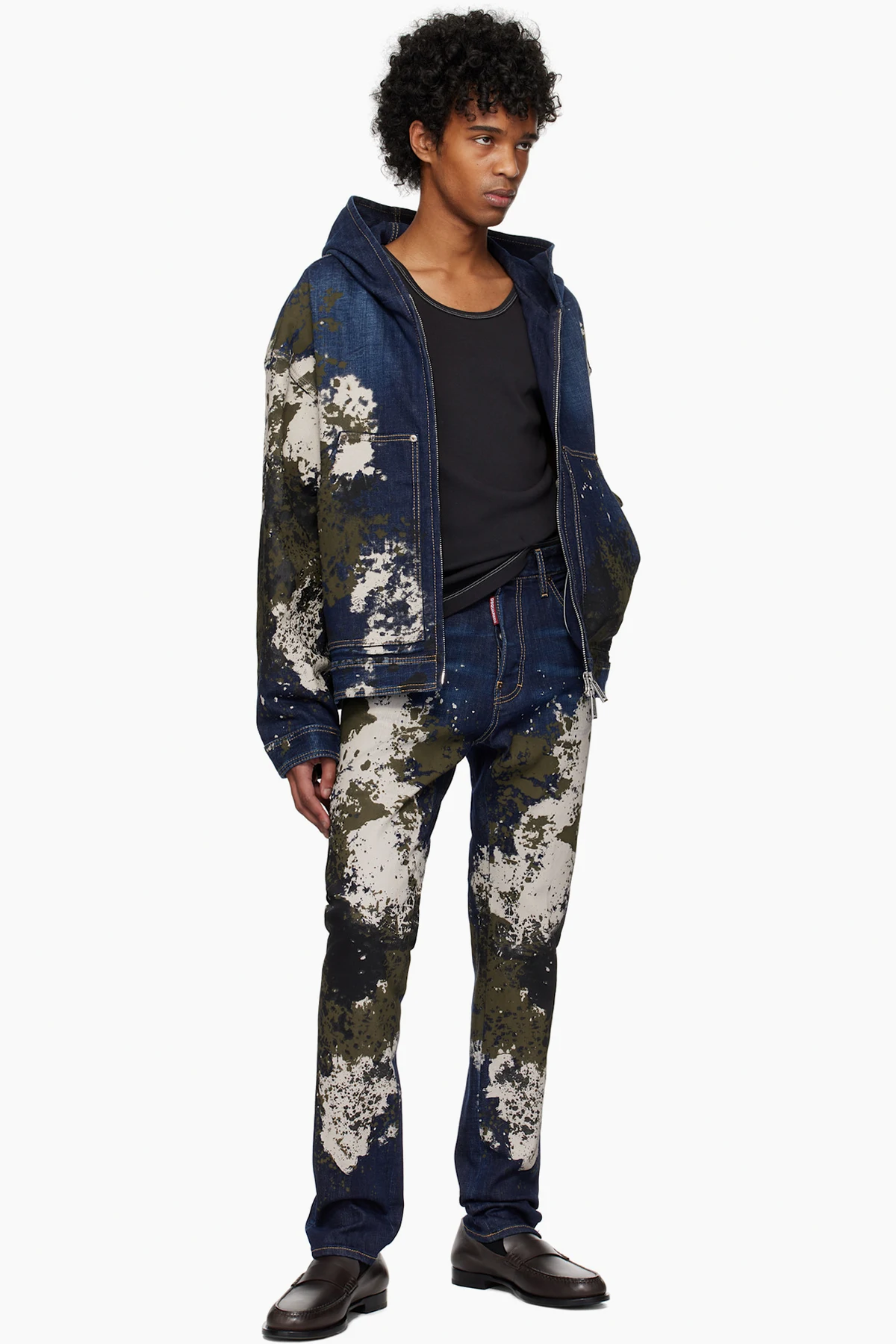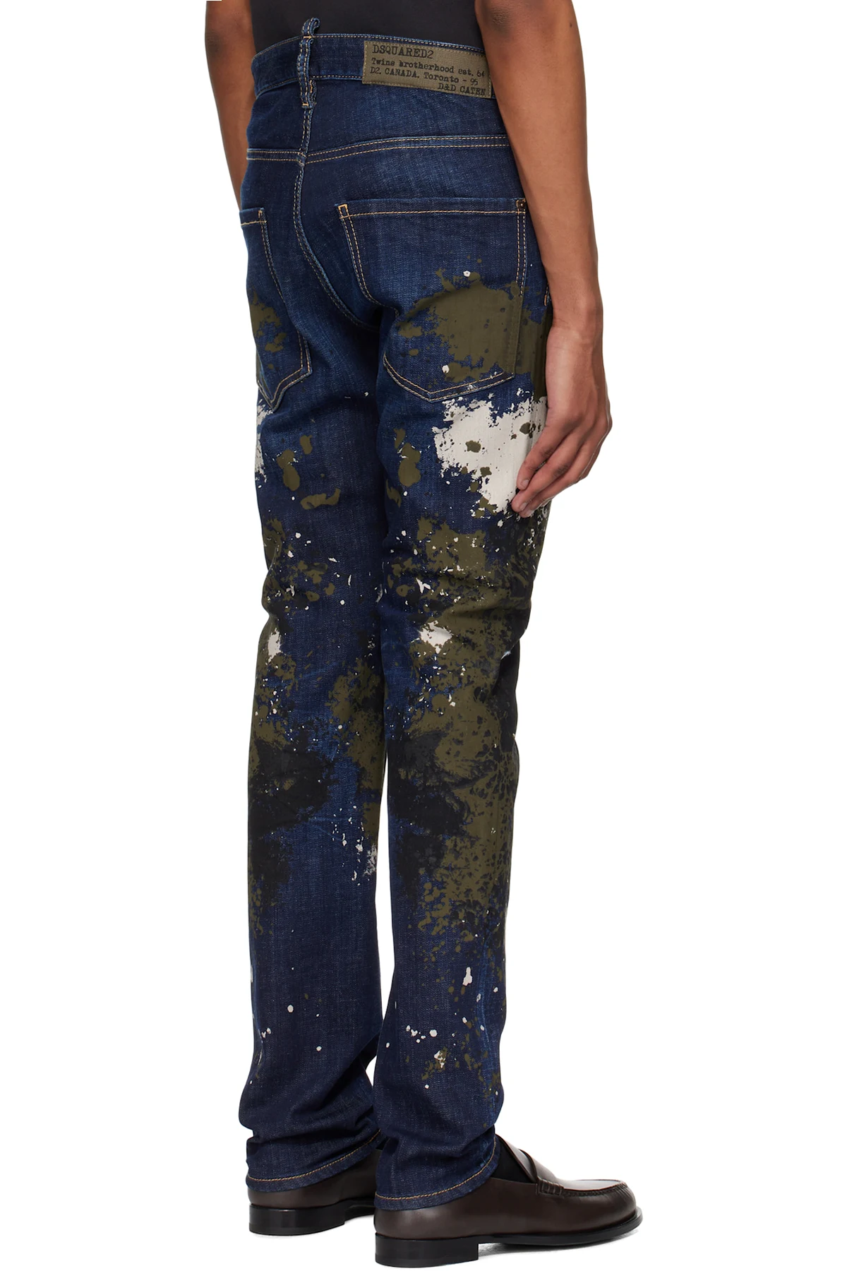 Slim-fit stretch denim jeans. Whiskering and paint splatter throughout.
