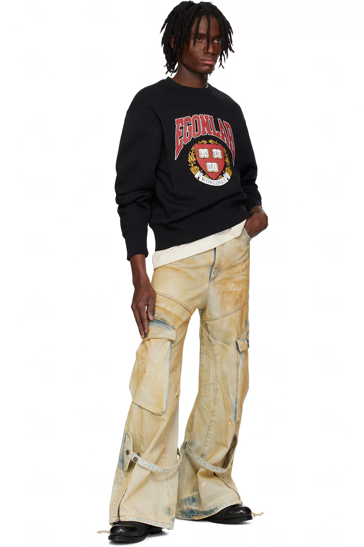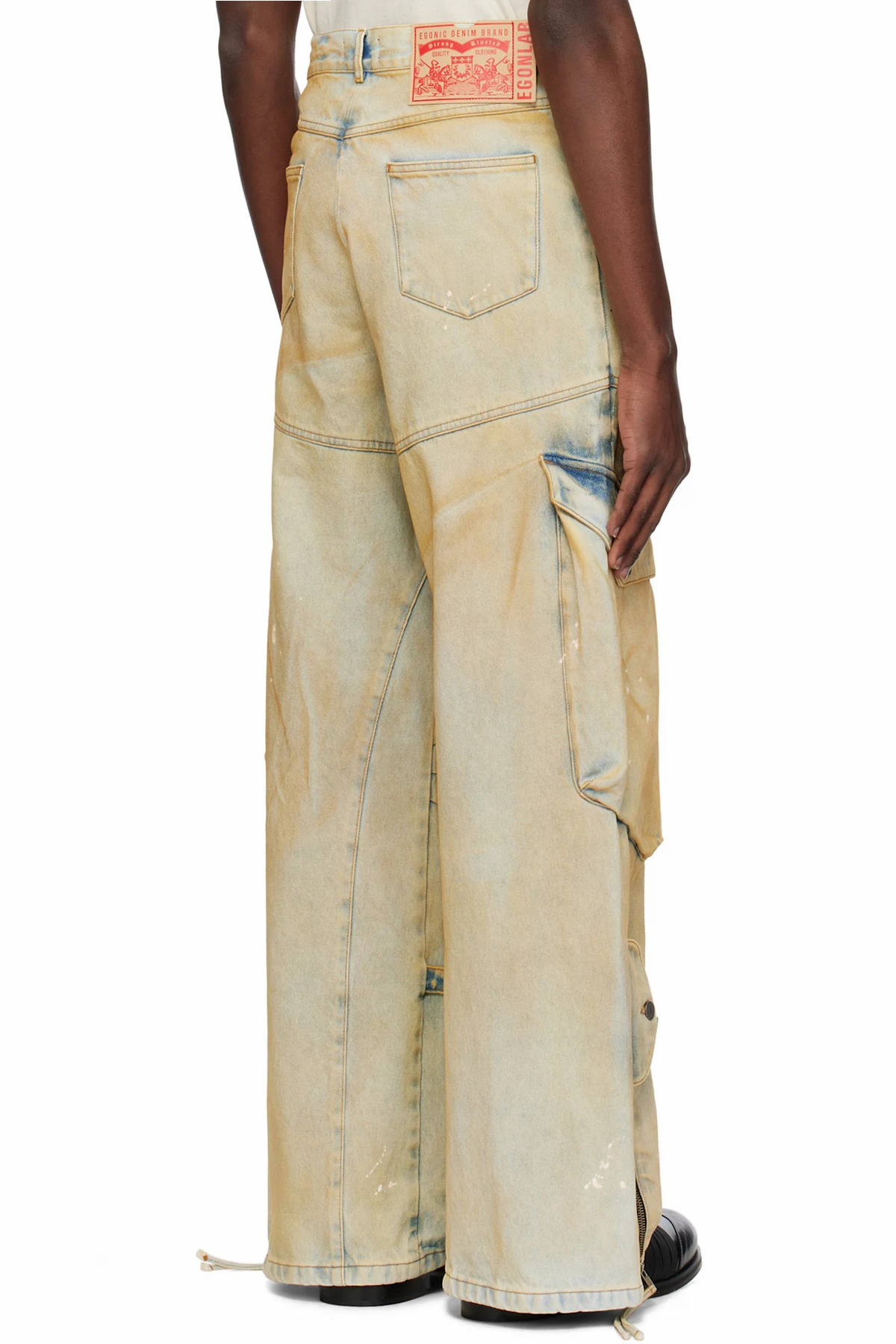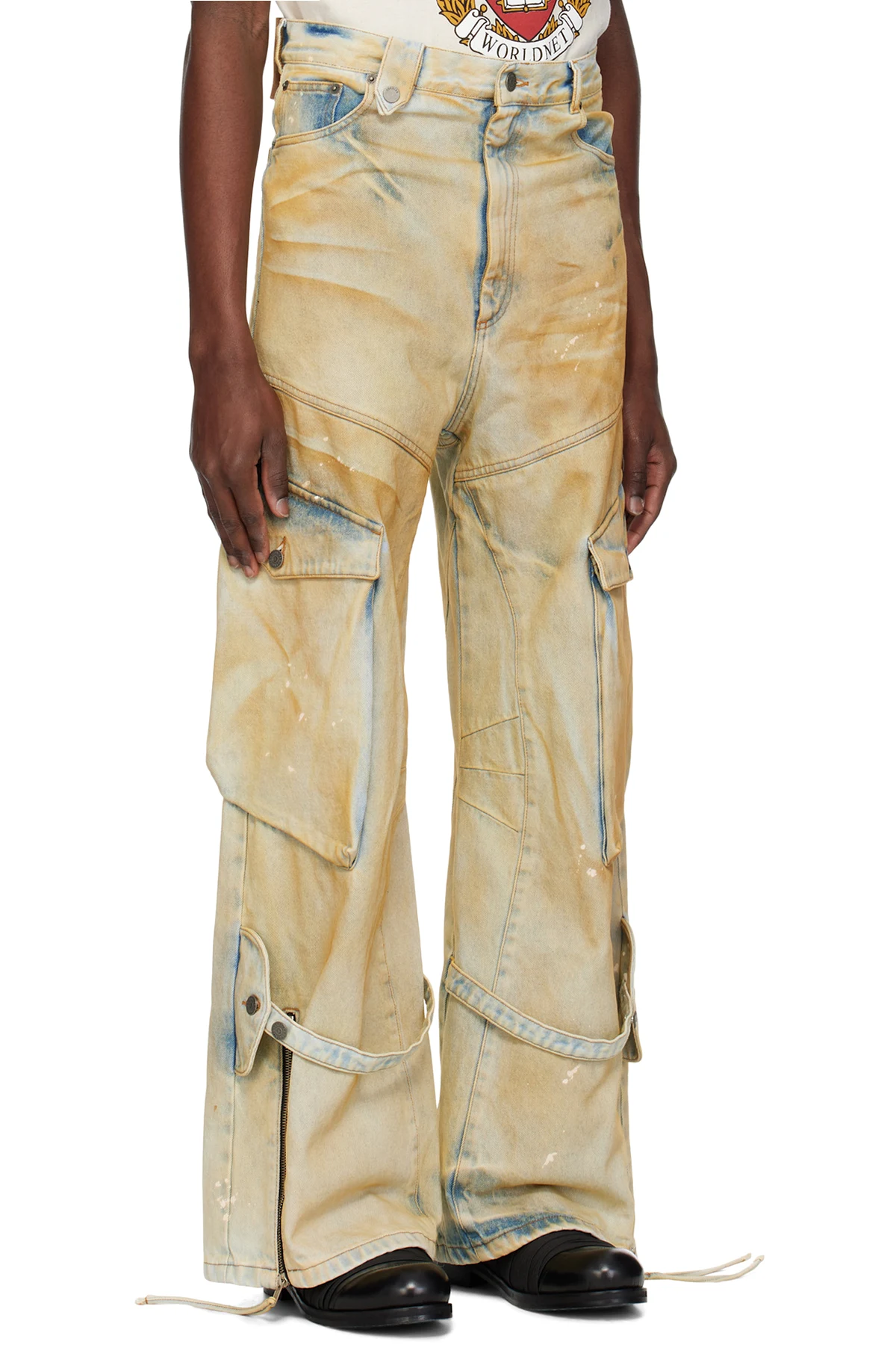 Non-stretch denim jeans. Fading, whiskering, smudging, and paint splatter throughout.