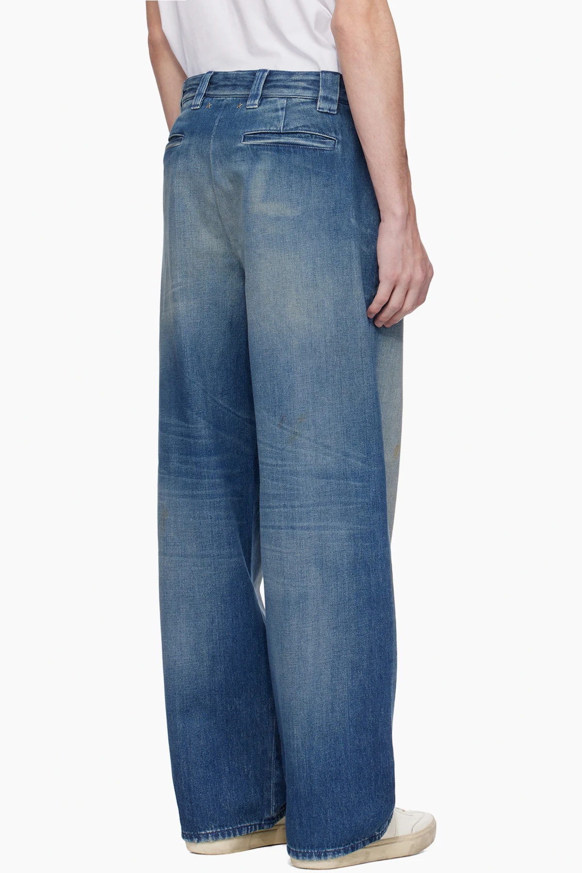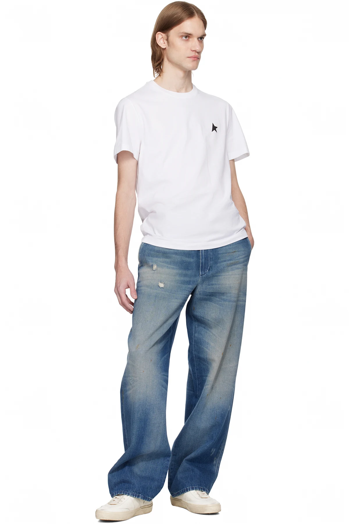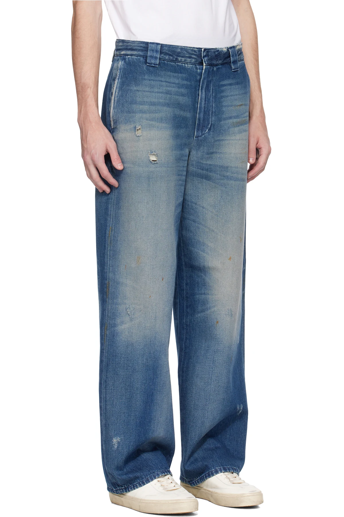Wide-leg non-stretch denim jeans. Fading, whiskering, and hand-distressing throughout.