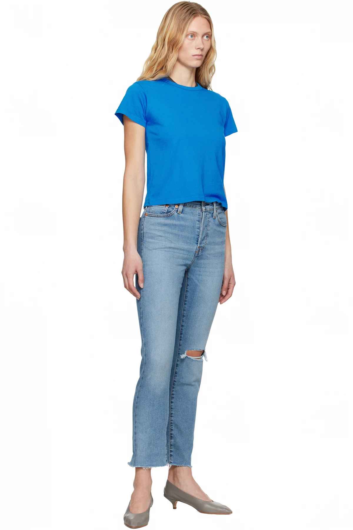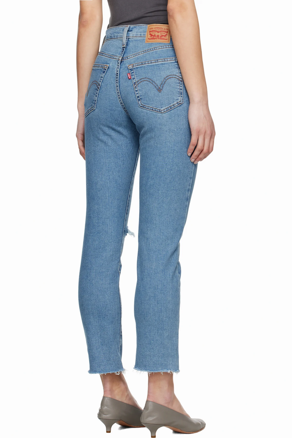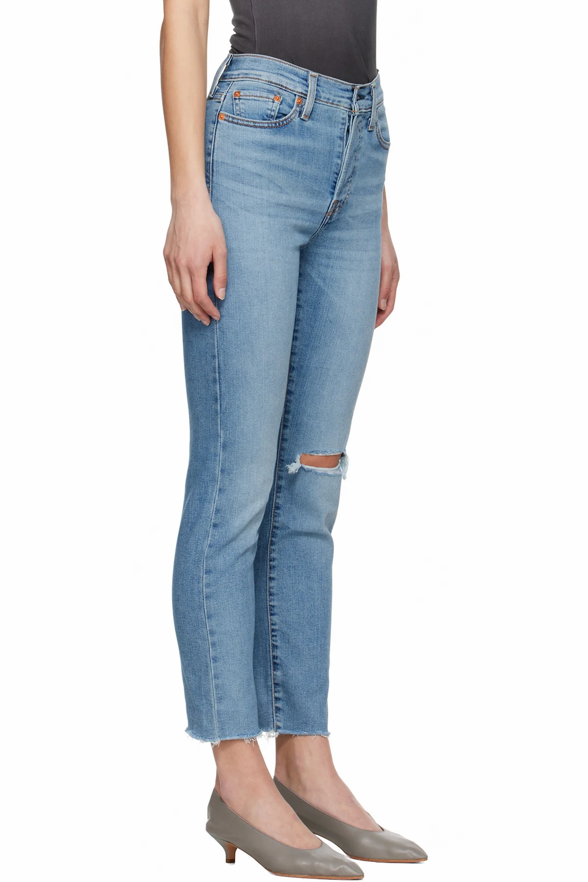 Straight-leg stretch denim jeans. Fading, whiskering, and distressing throughout.