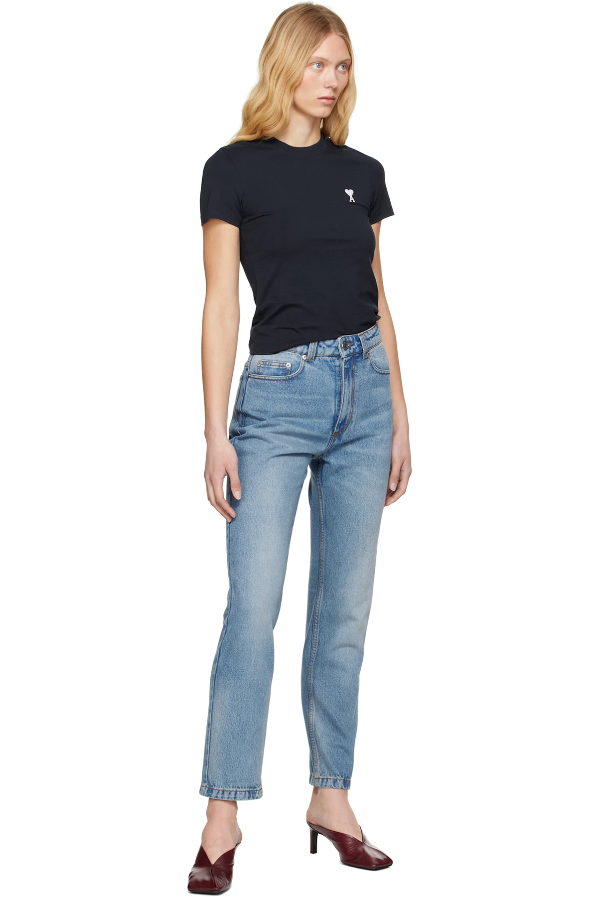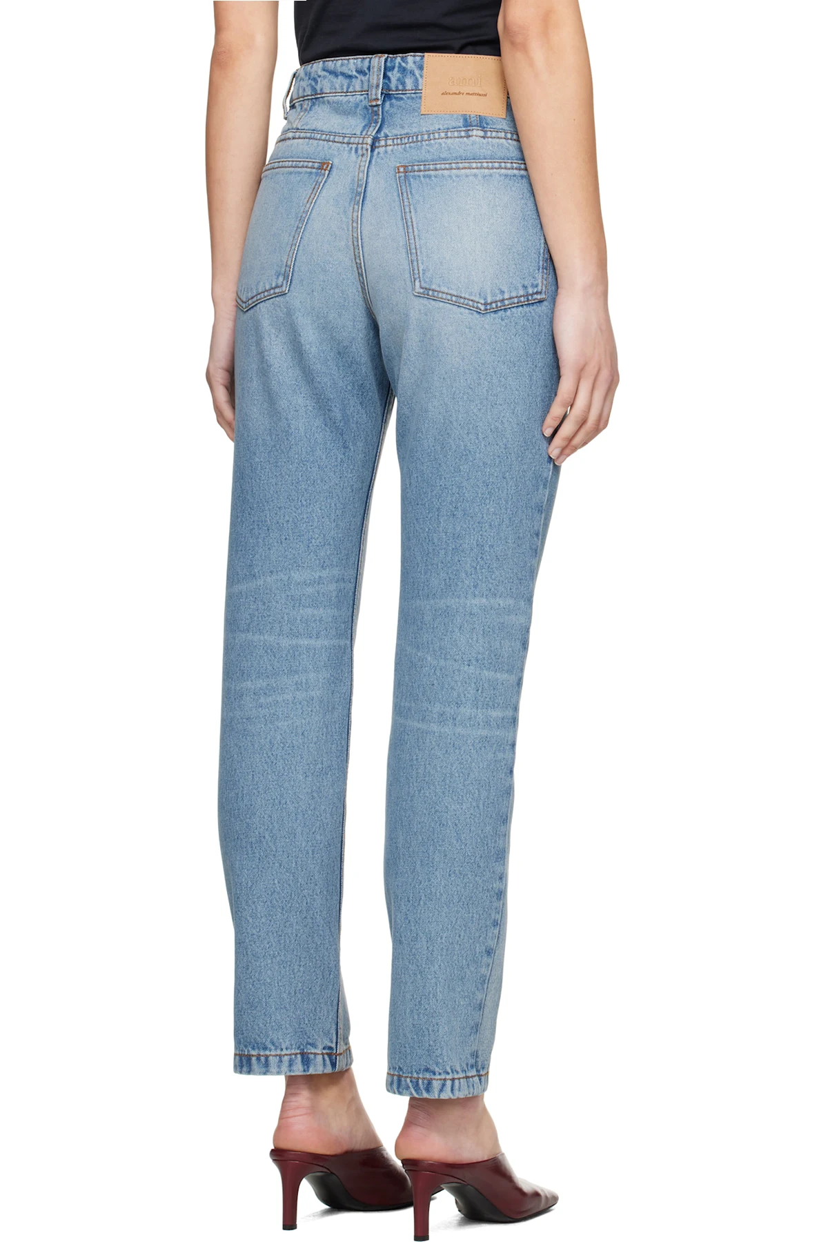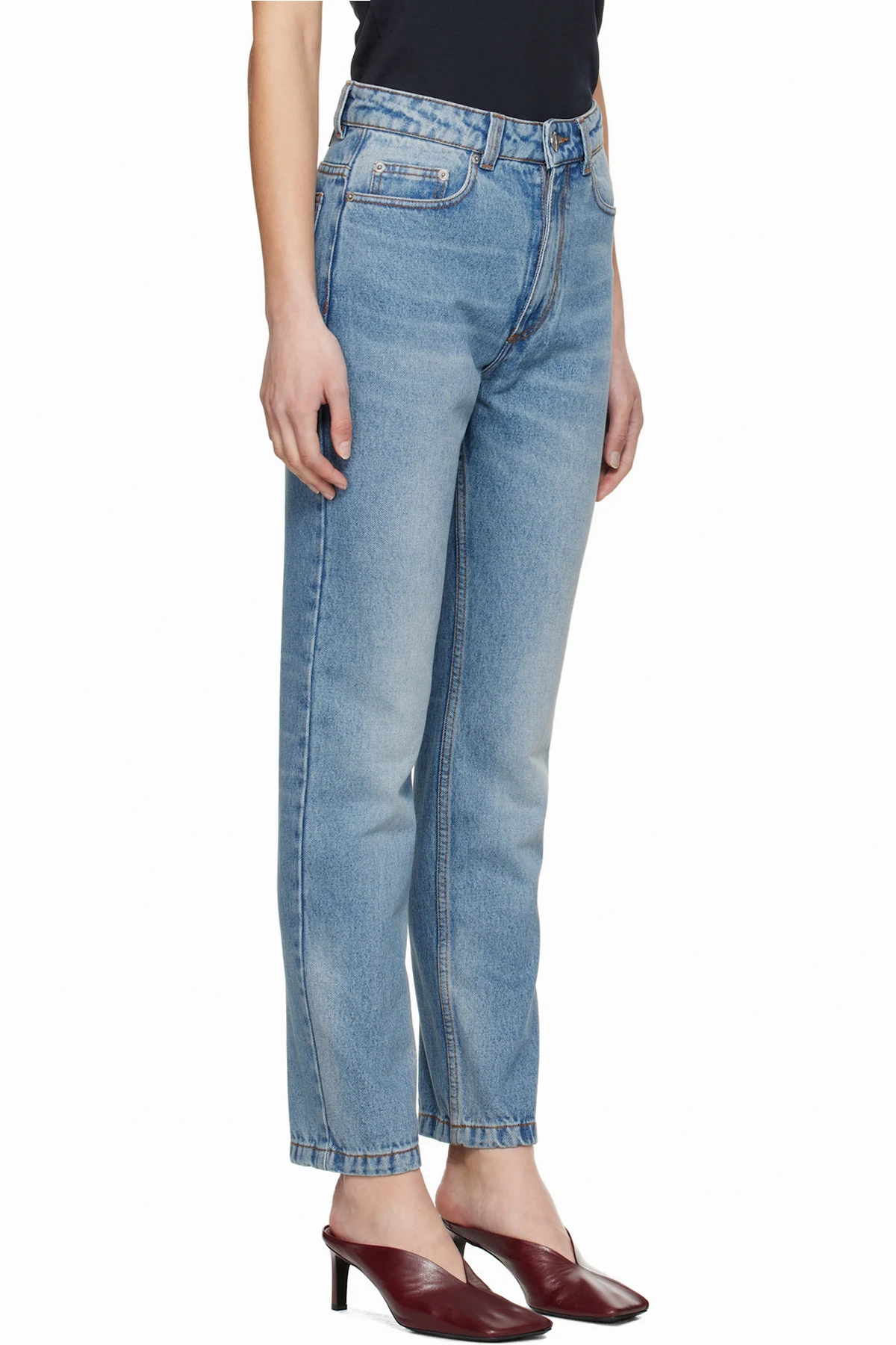 Non-stretch denim jeans. Fading and whiskering throughout.