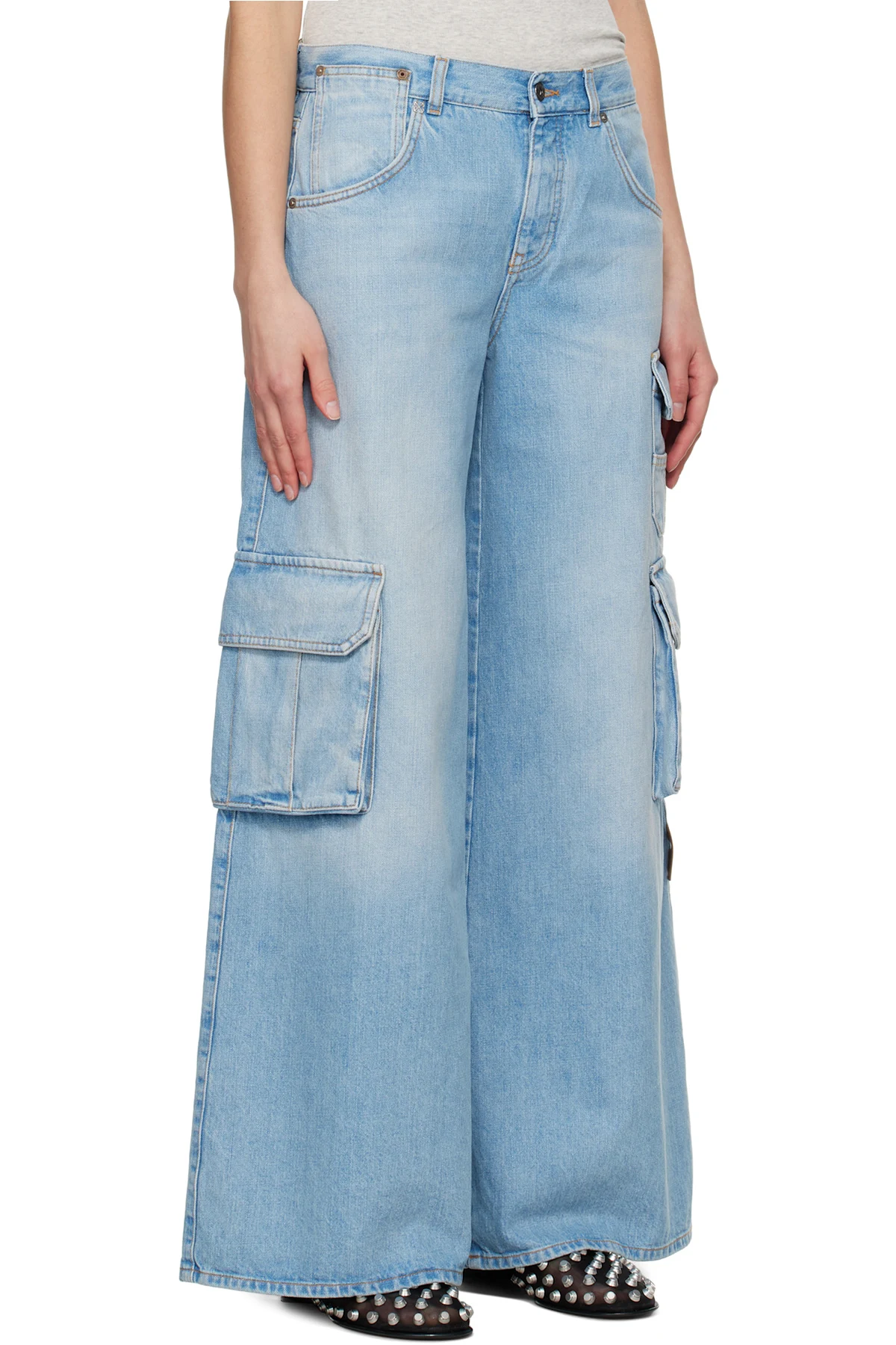 Wide-leg non-stretch denim jeans. Fading and whiskering throughout.