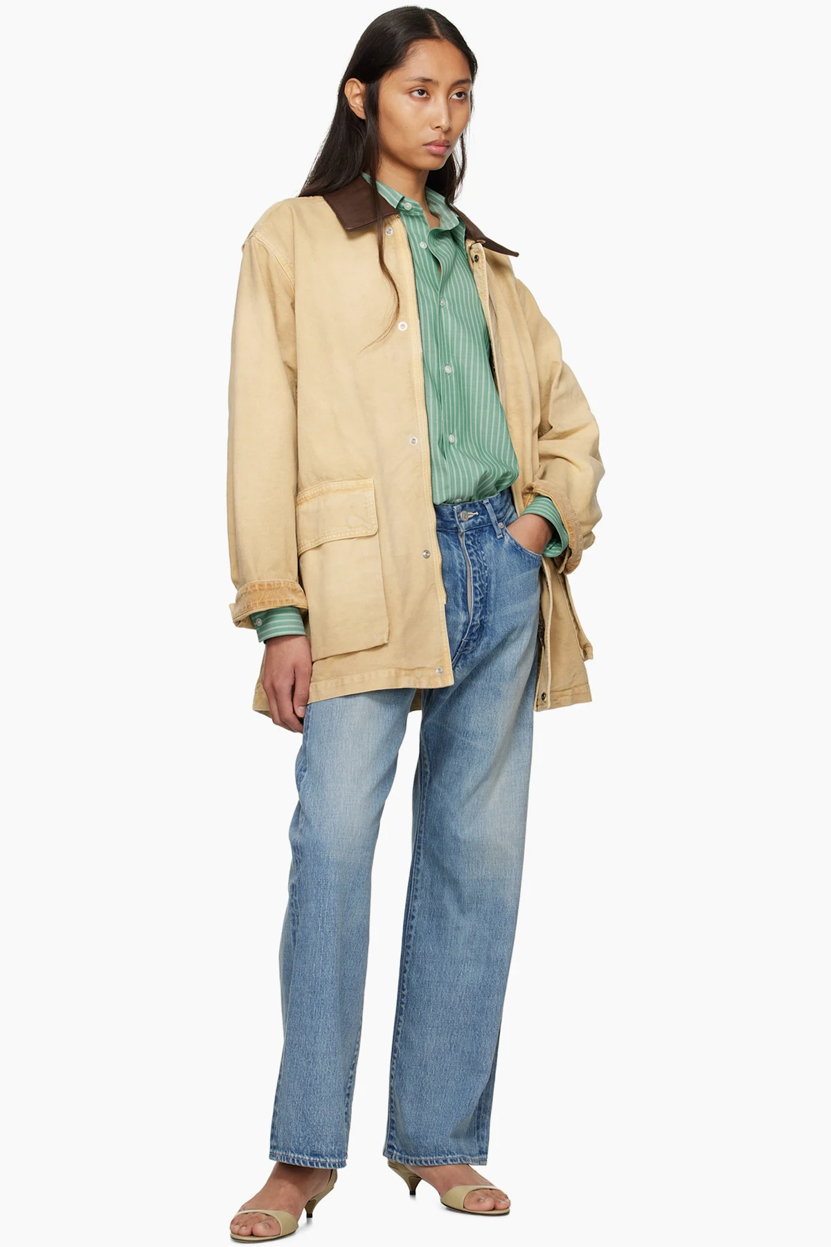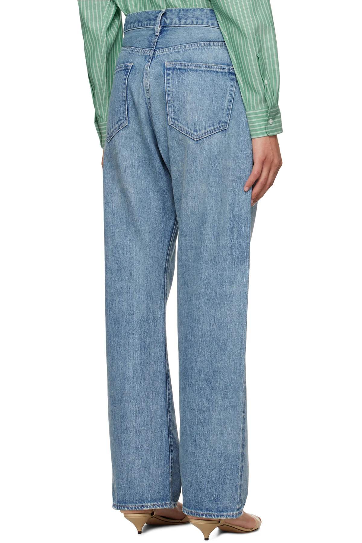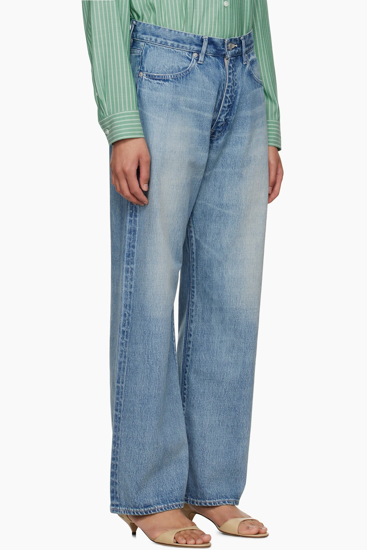 Wide-leg non-stretch selvedge denim jeans. Fading and whiskering throughout.