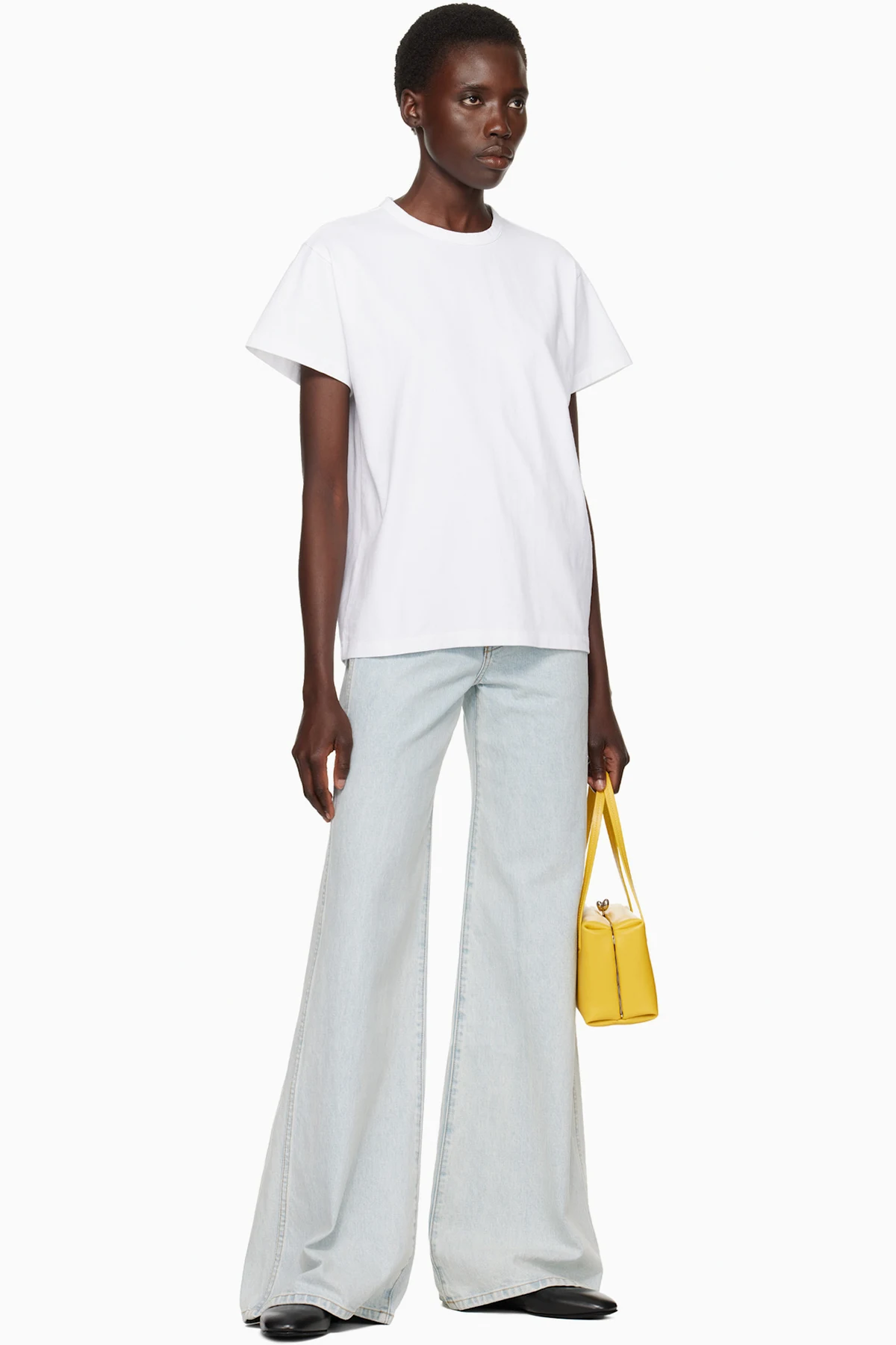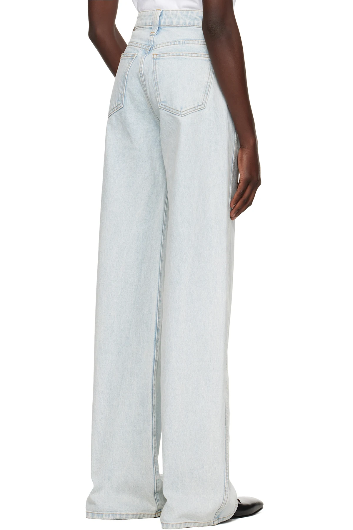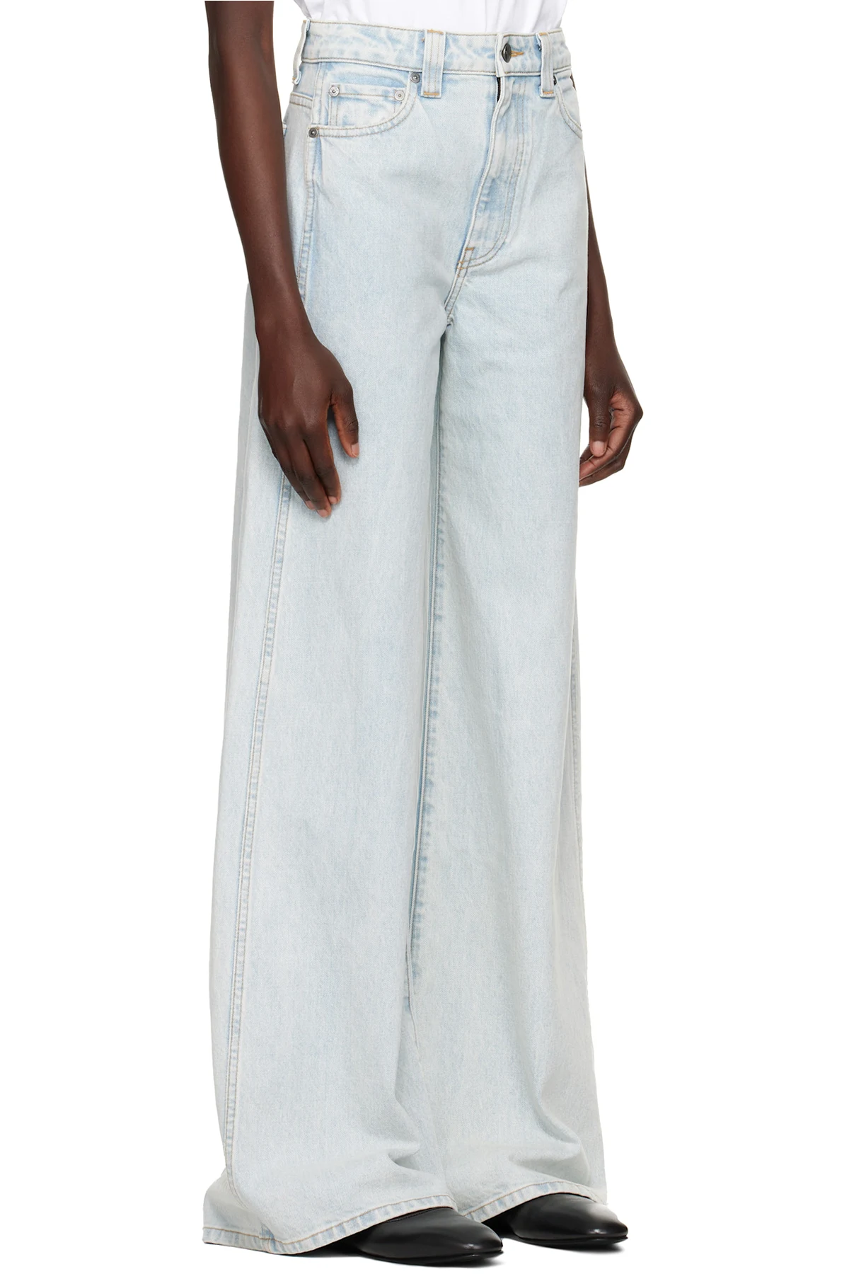 Flared wide-leg stretch denim jeans. Fading, whiskering, and subtle distressing throughout.