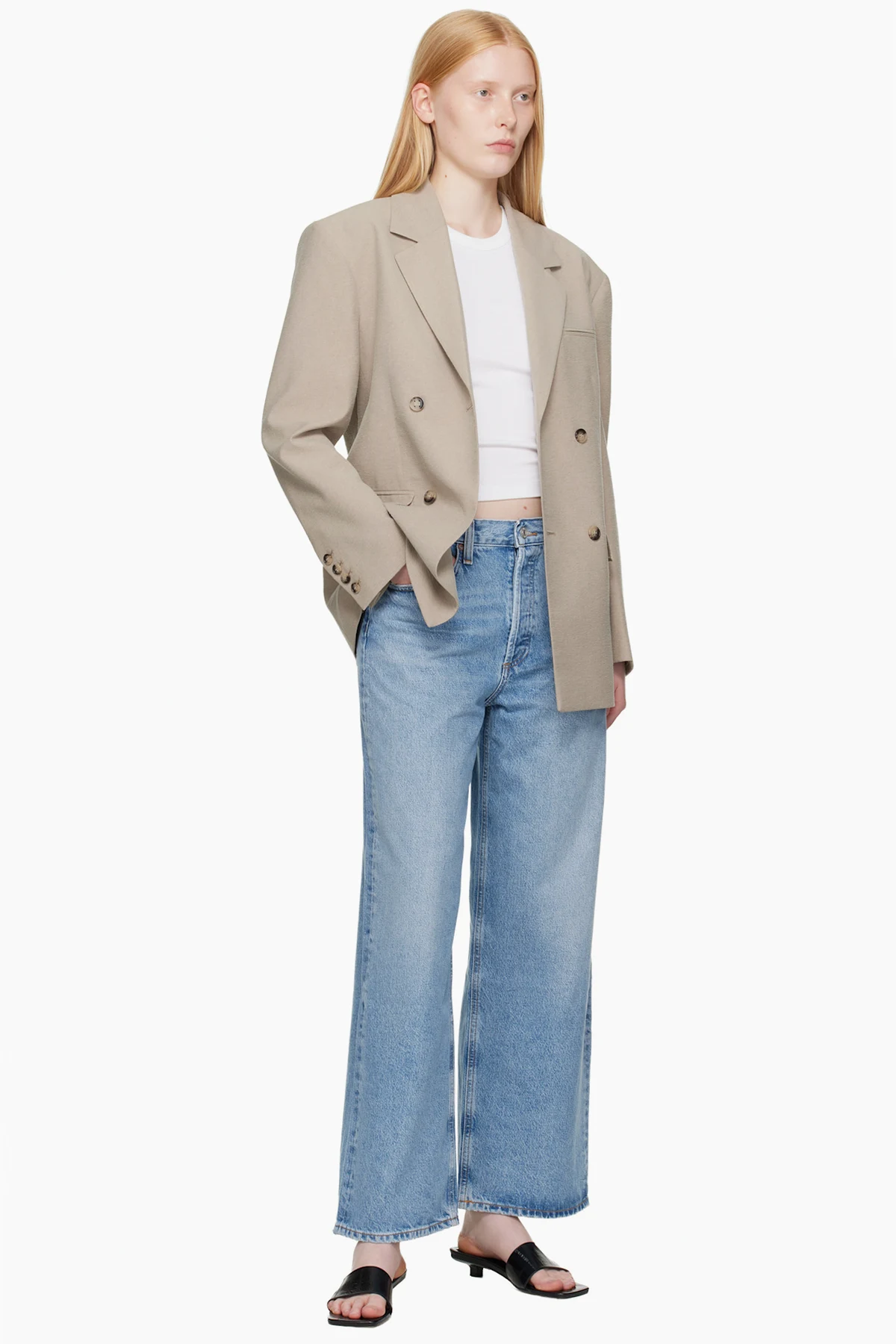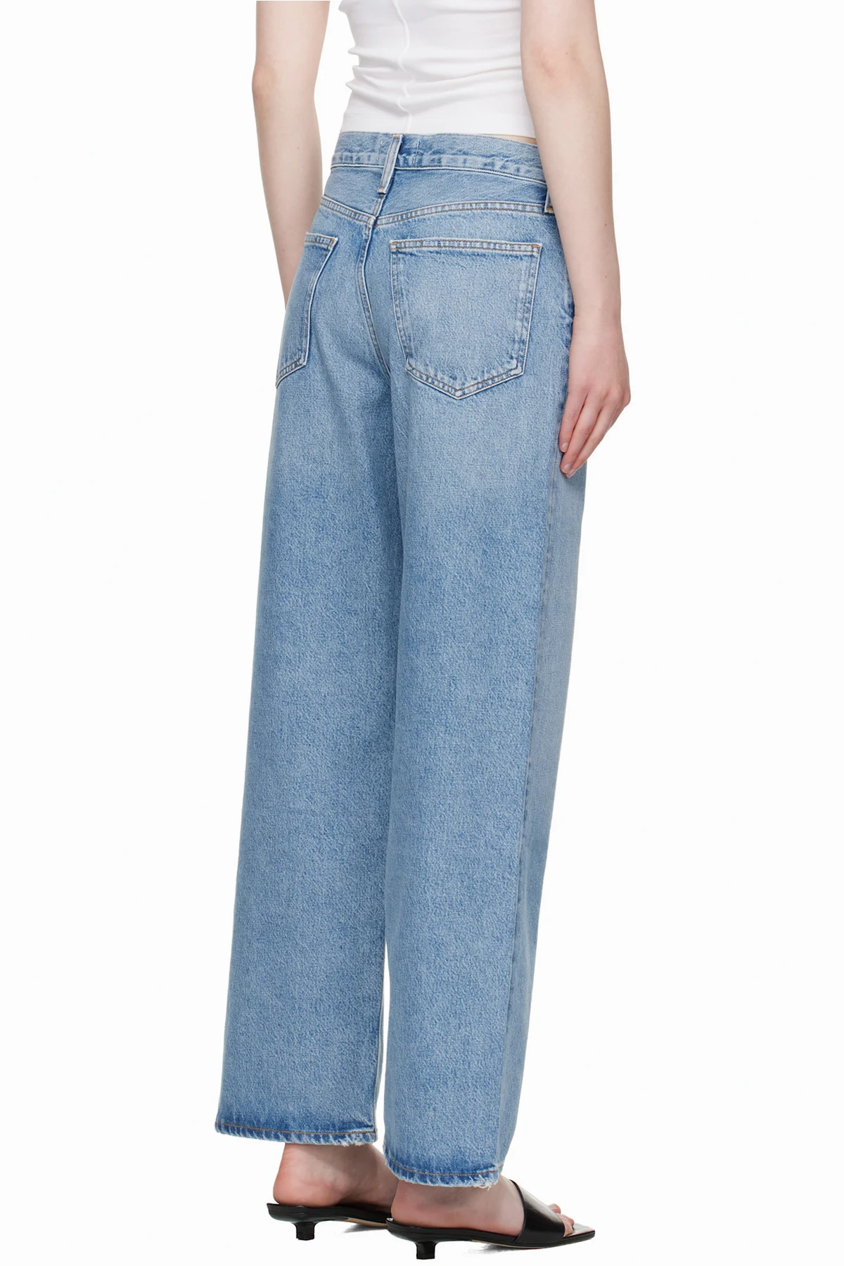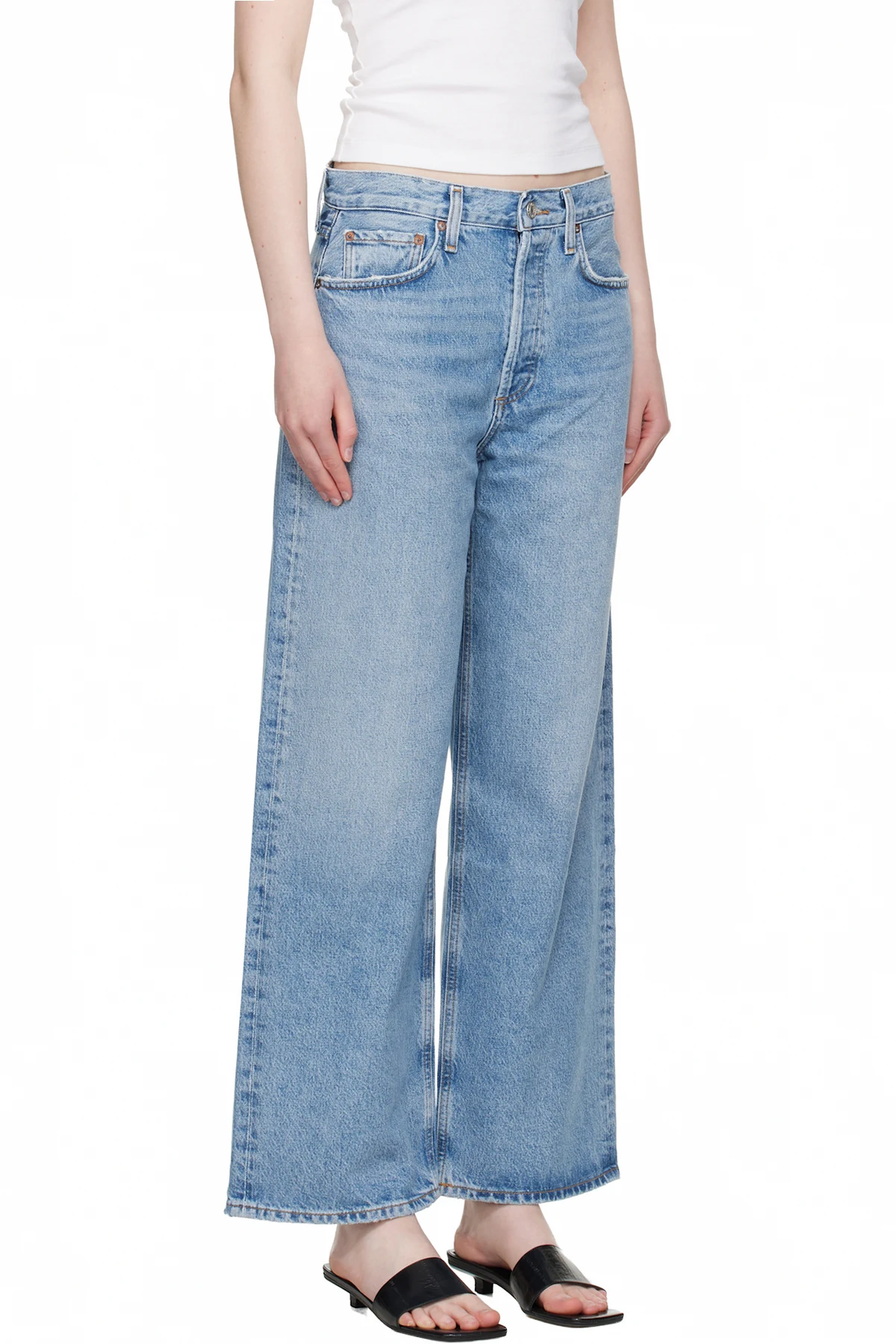 Non-stretch regenerative cotton- and recycled lyocell-blend denim jeans. Fading, whiskering, and subtle distressing throughout.