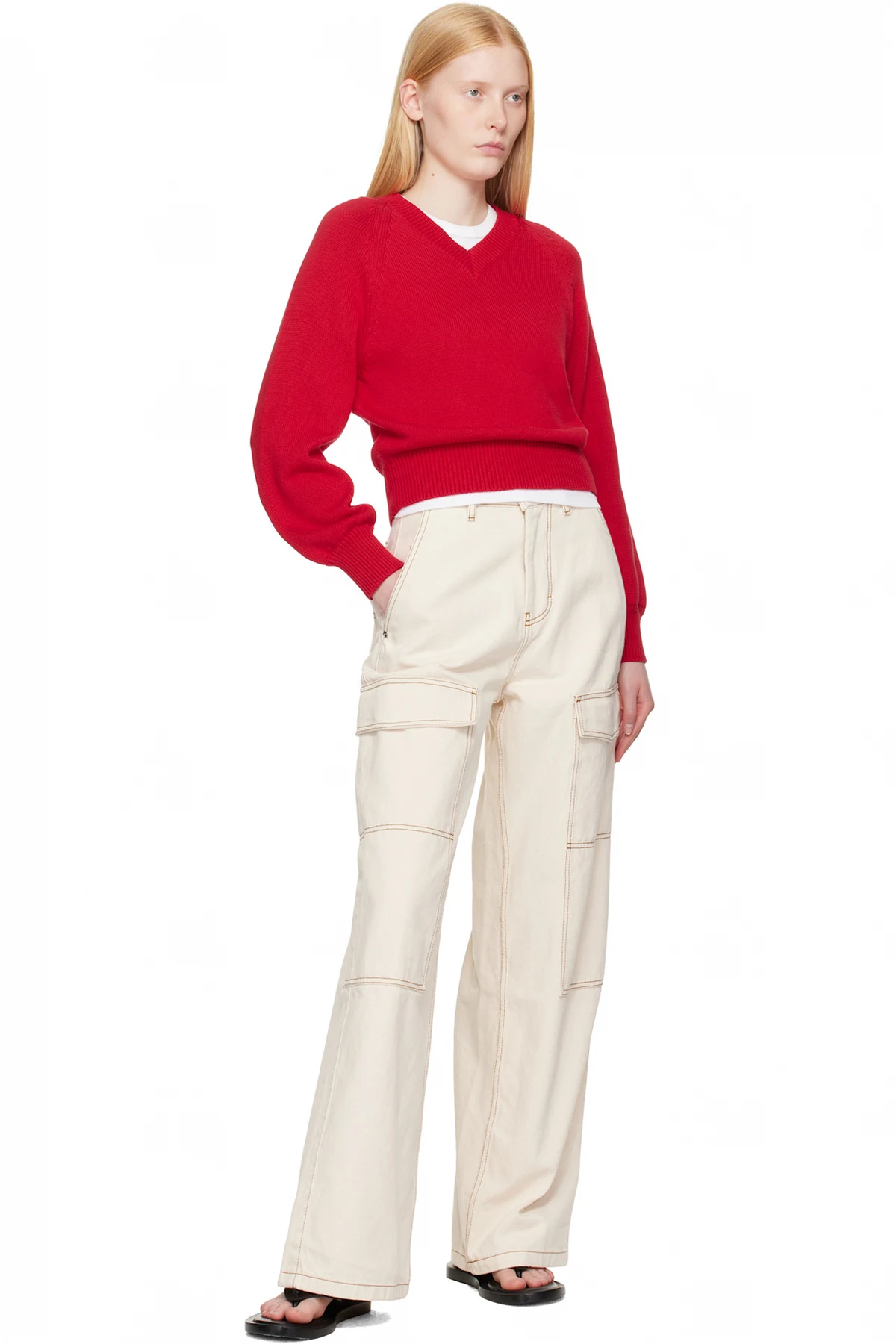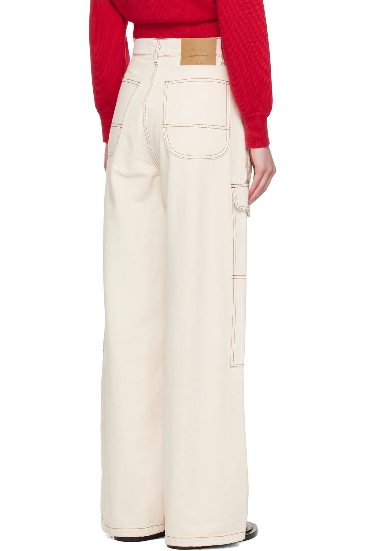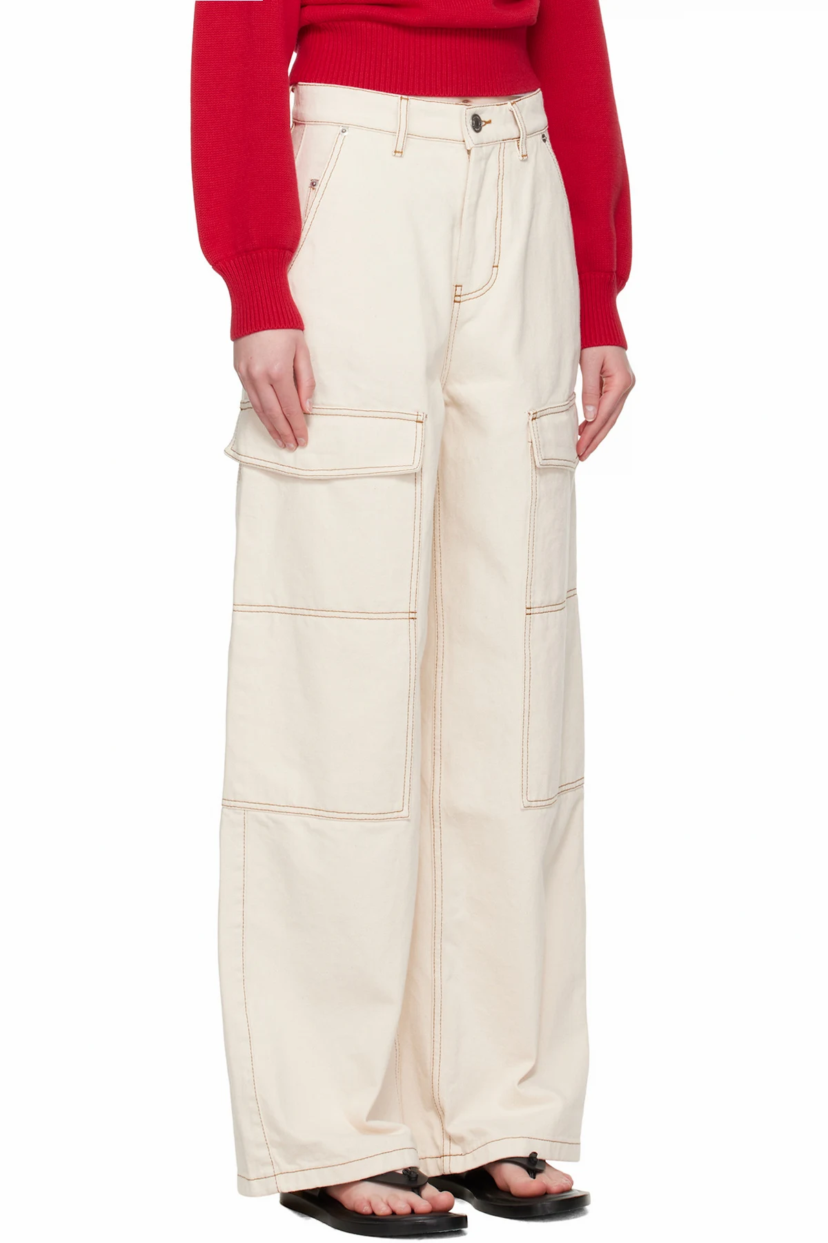Wide-leg non-stretch denim cargo pants.