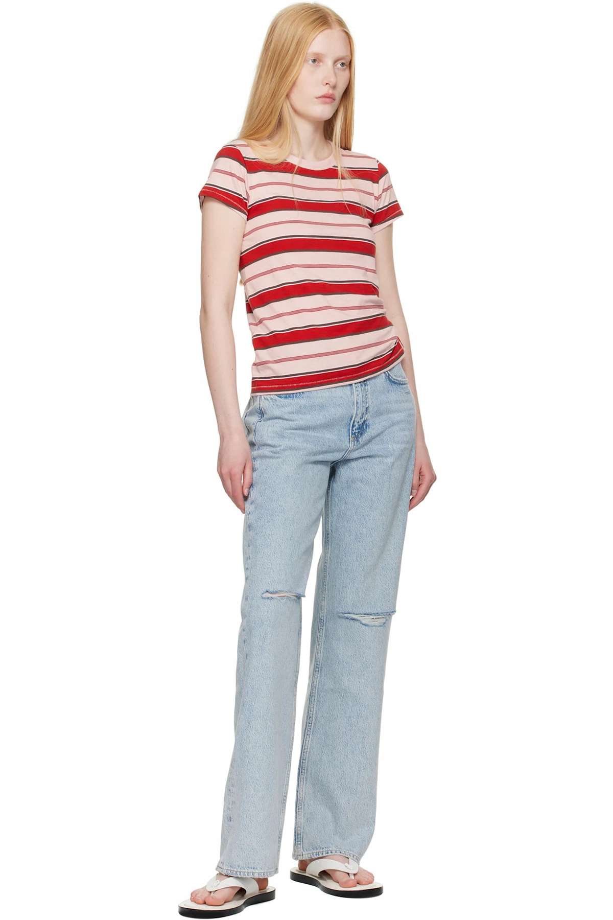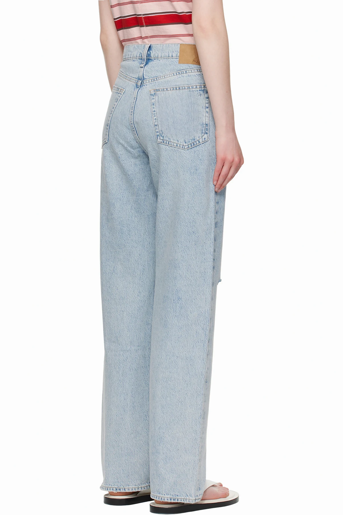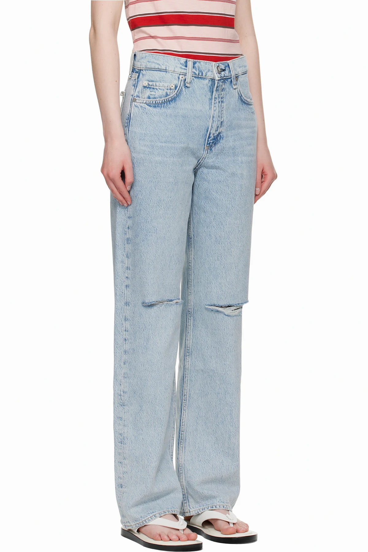 Non-stretch denim jeans. Fading, whiskering, and distressing throughout.