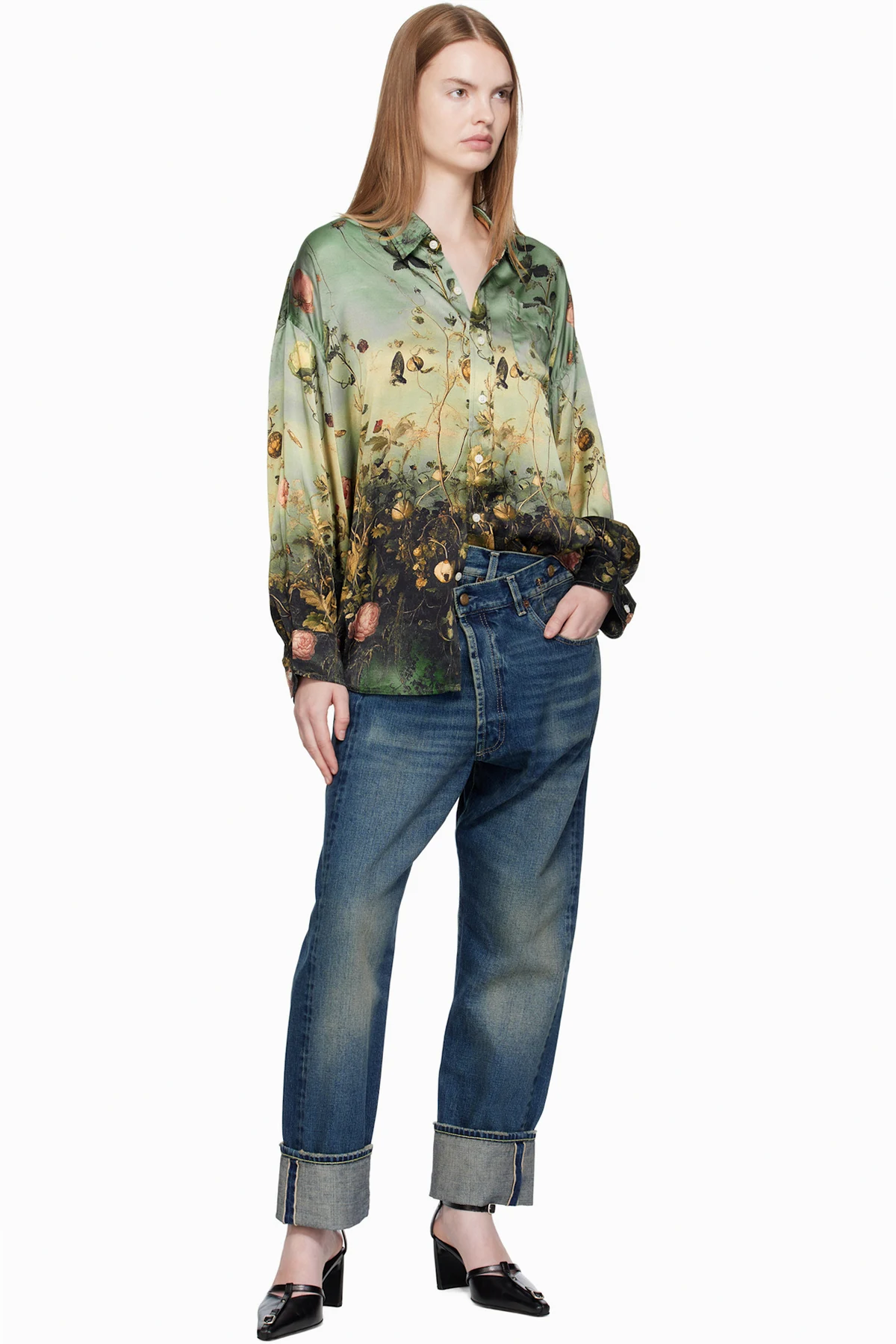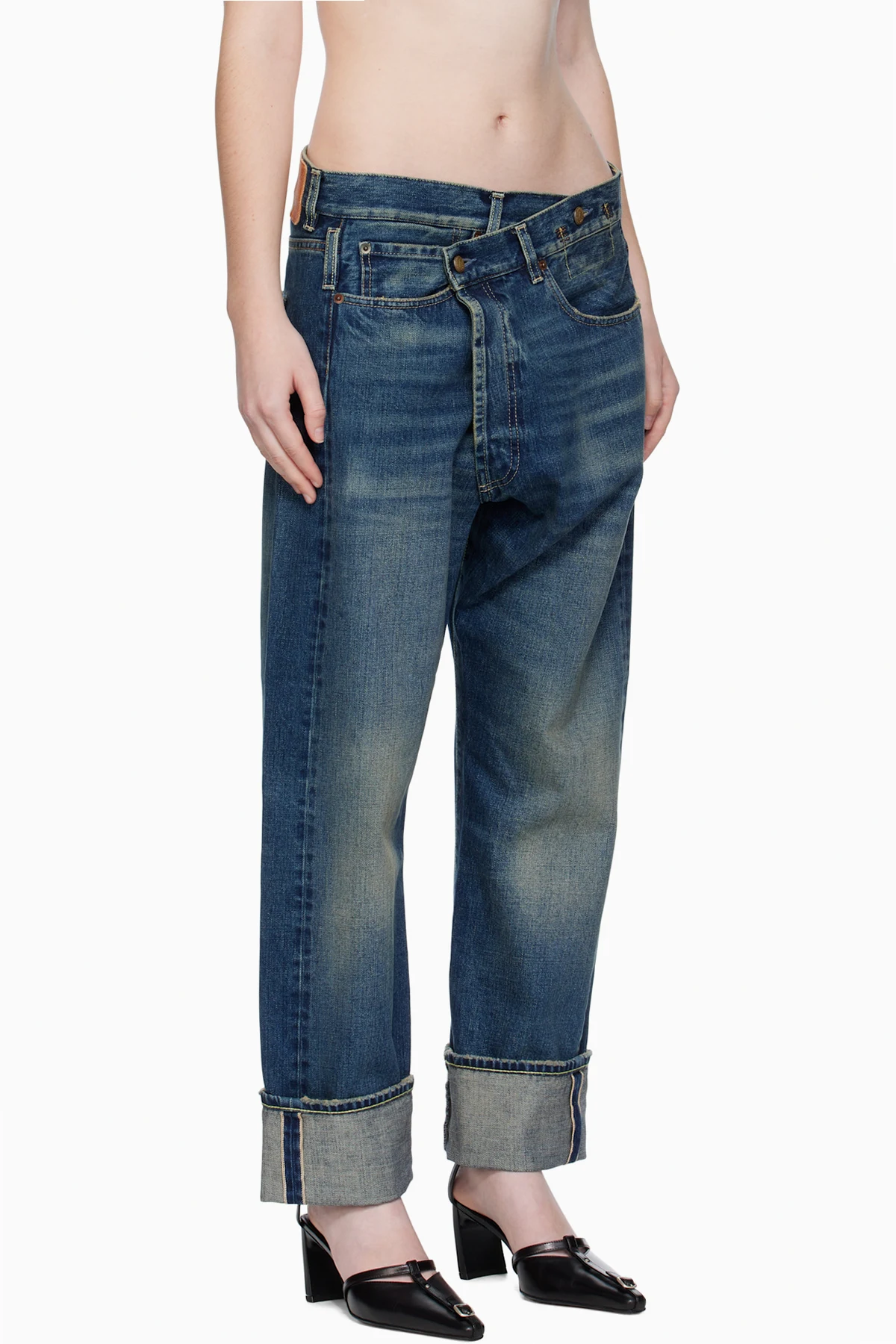 · Adjustable button fastening at asymmetrical waistband