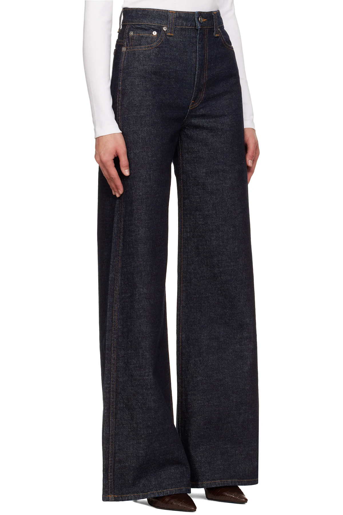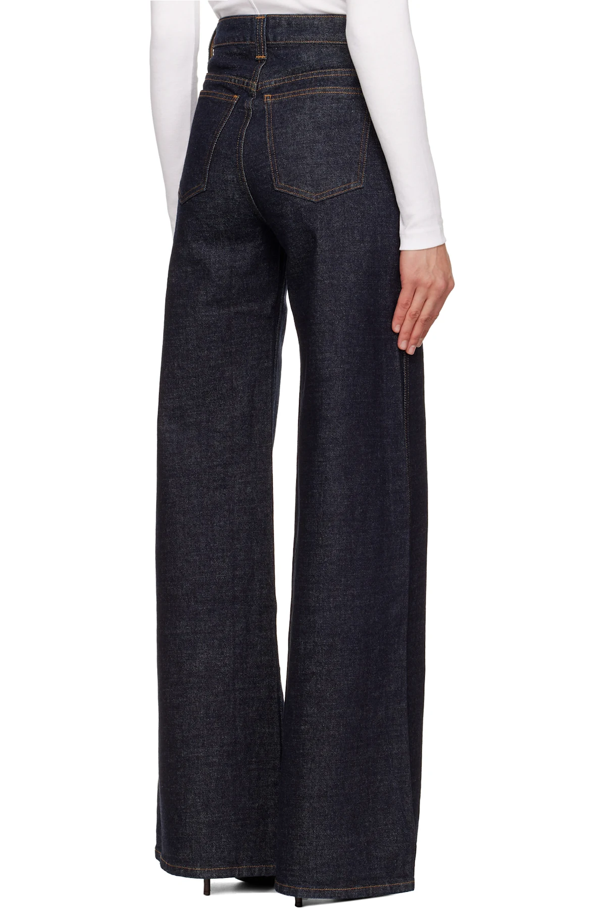 Hand-finished flared stretch denim jeans.