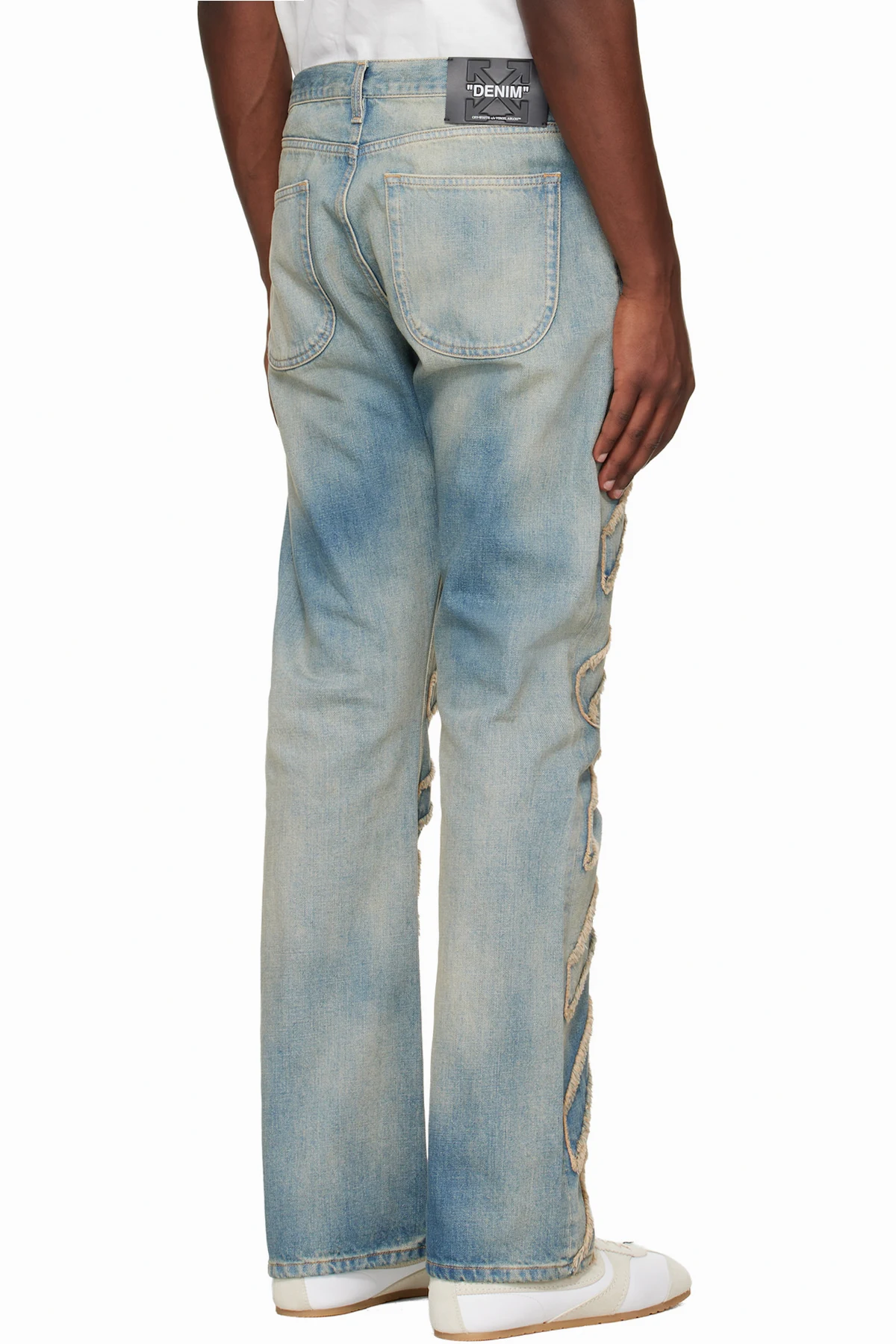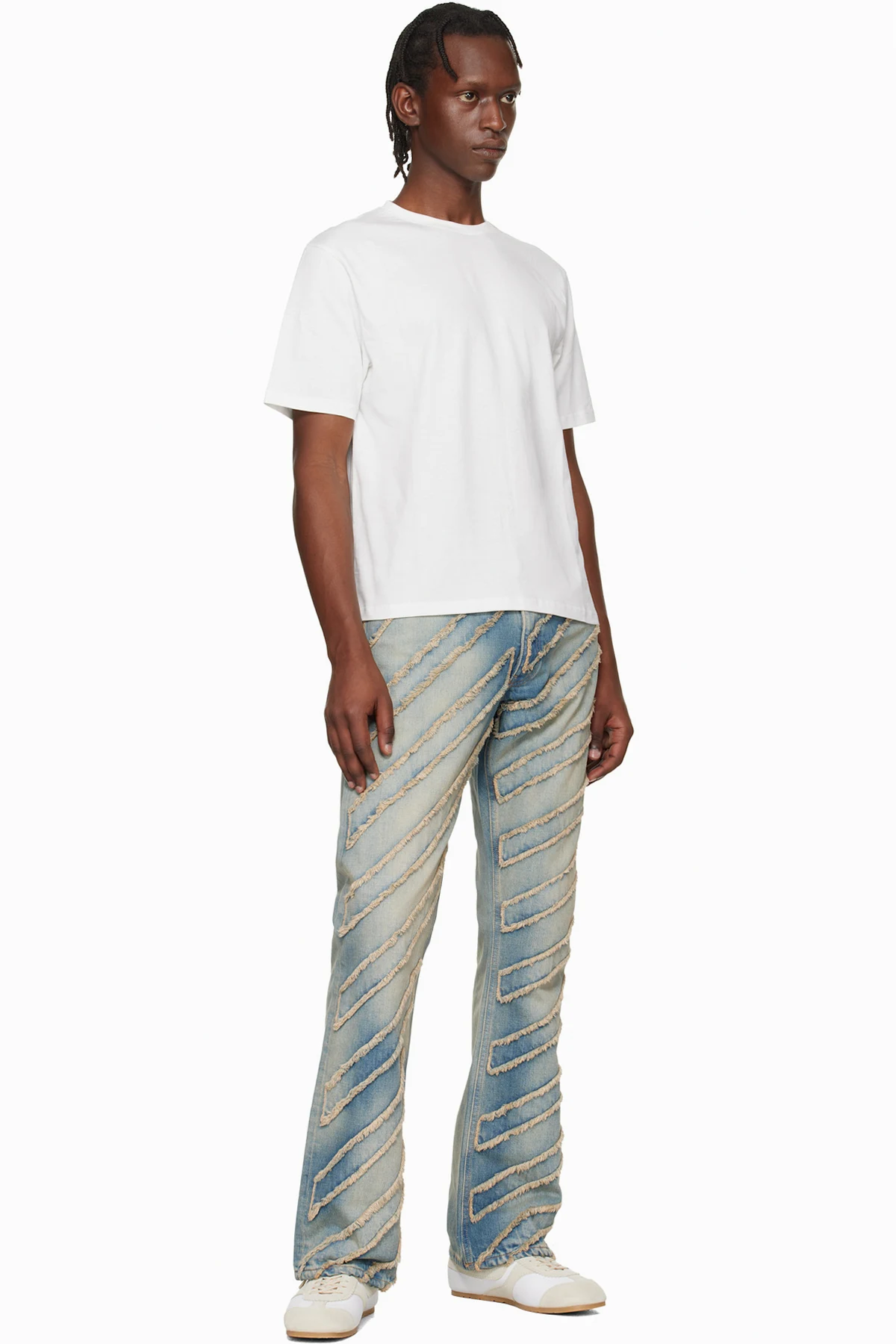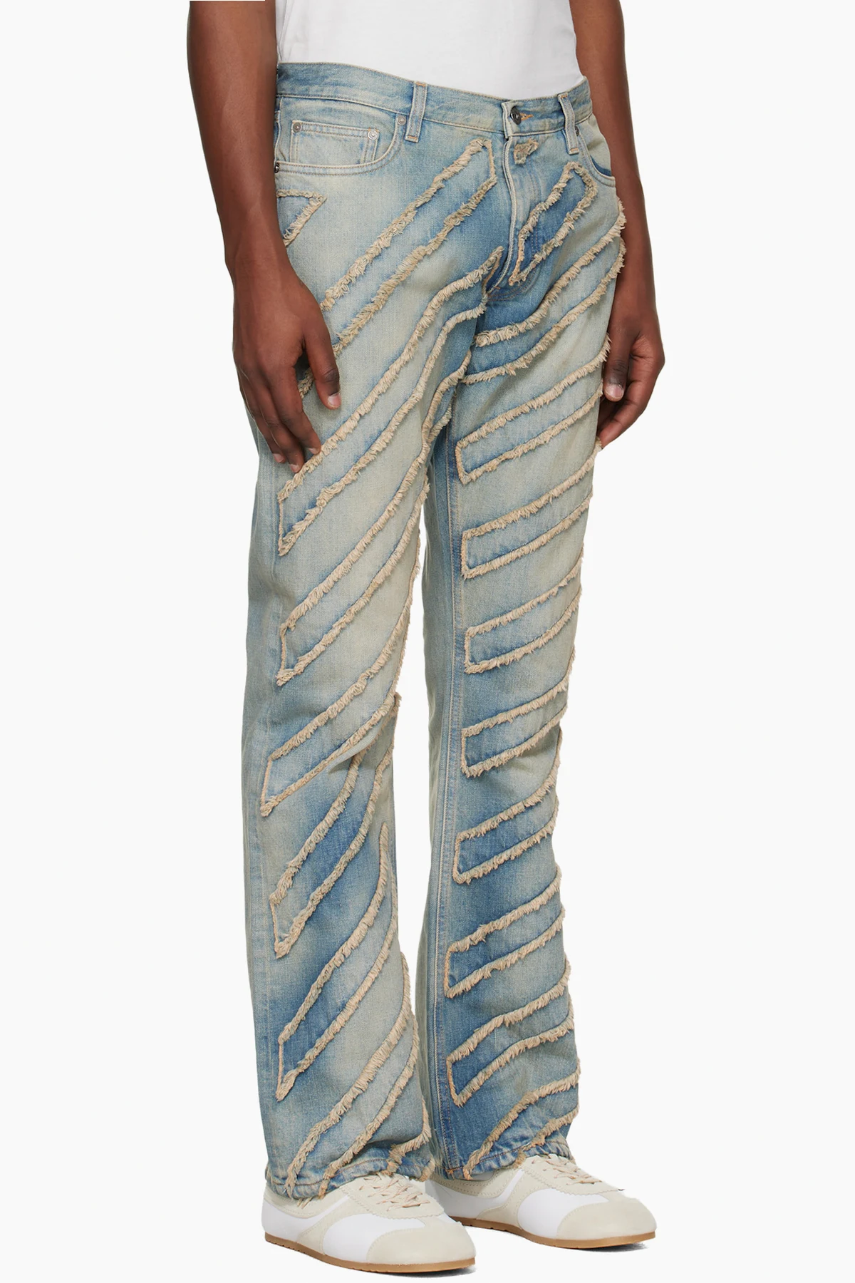 · Stripe appliqués with frayed edges at front