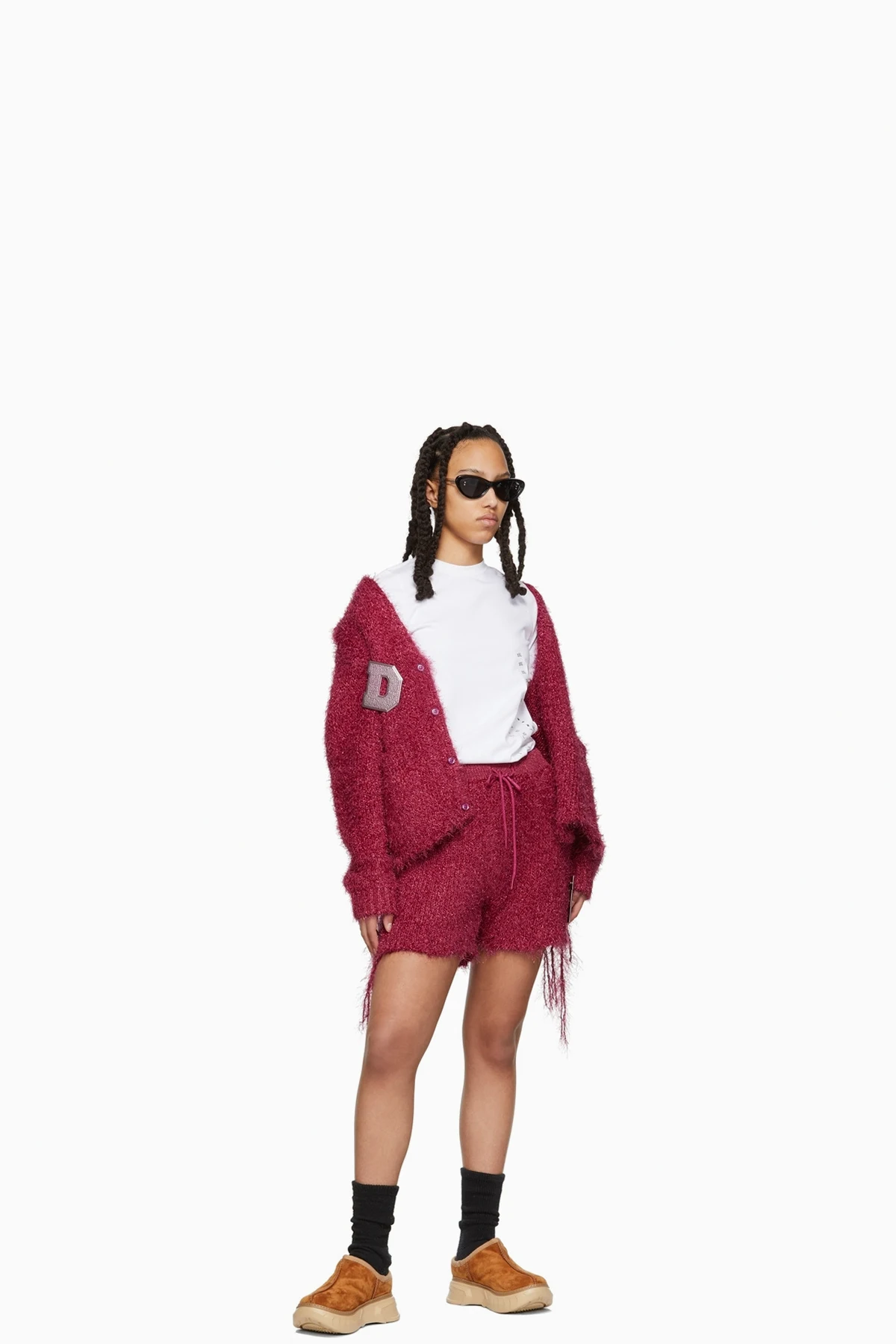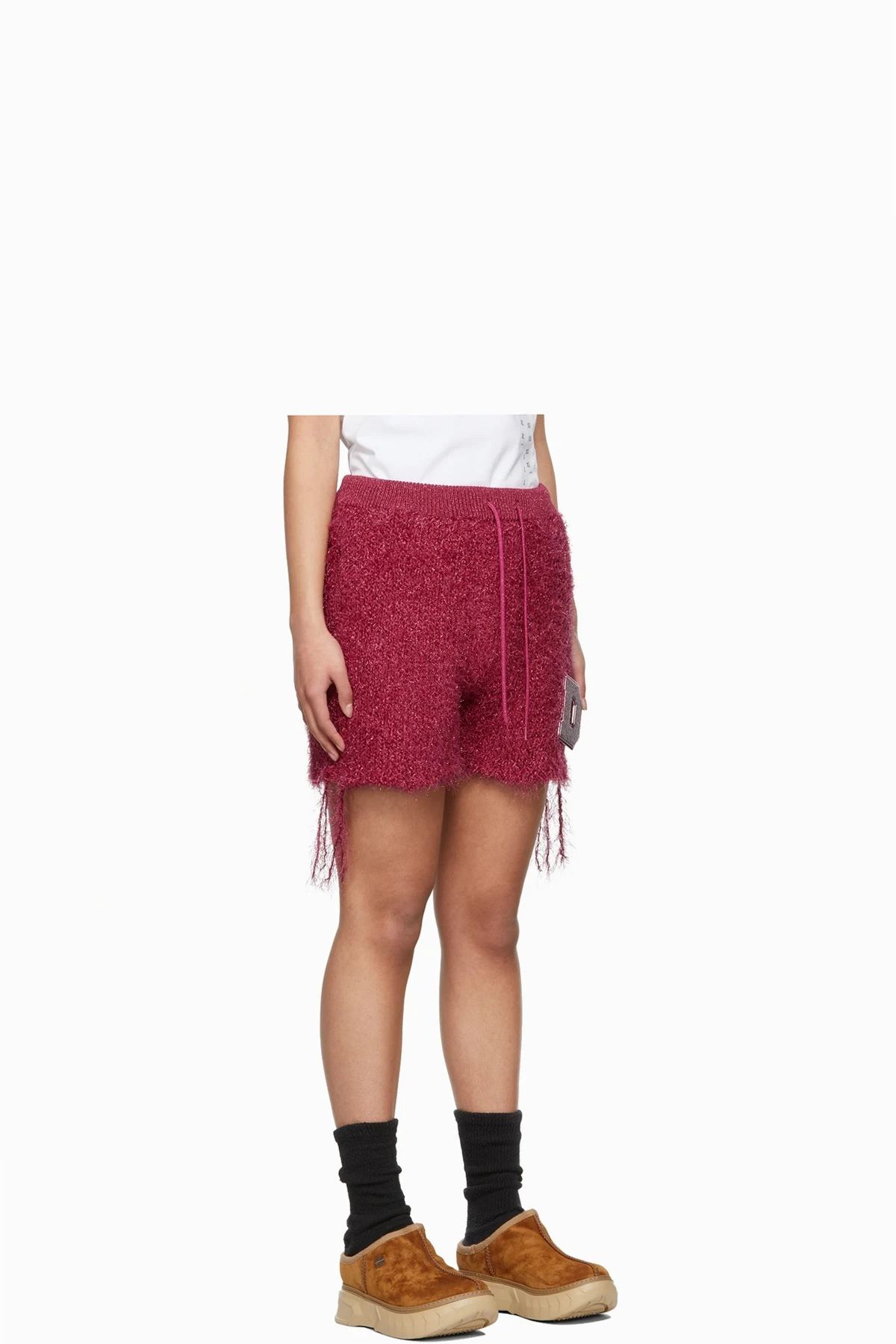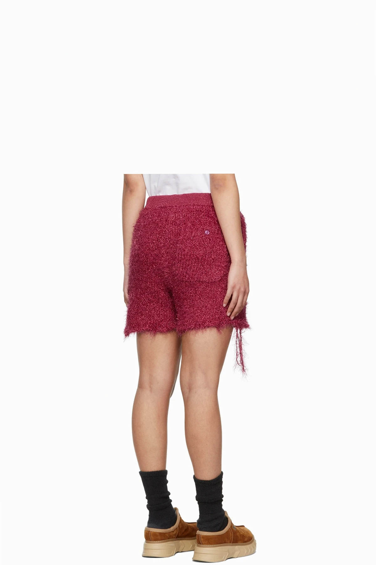 Knit technical nylon shorts in pink featuring metallic thread detailing throughout.