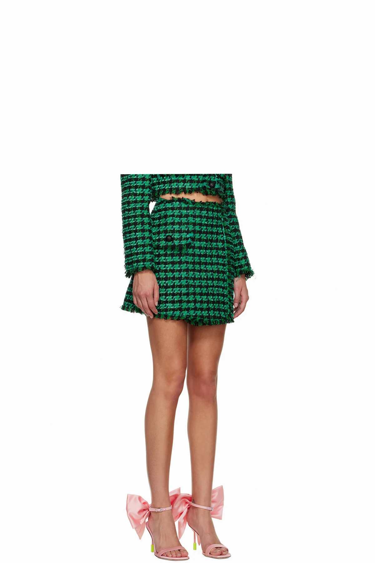 Cotton-blend tweed skort. Frayed edges, check pattern, and metallic thread detailing throughout.
