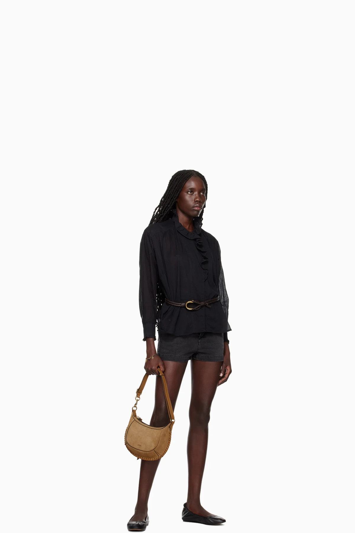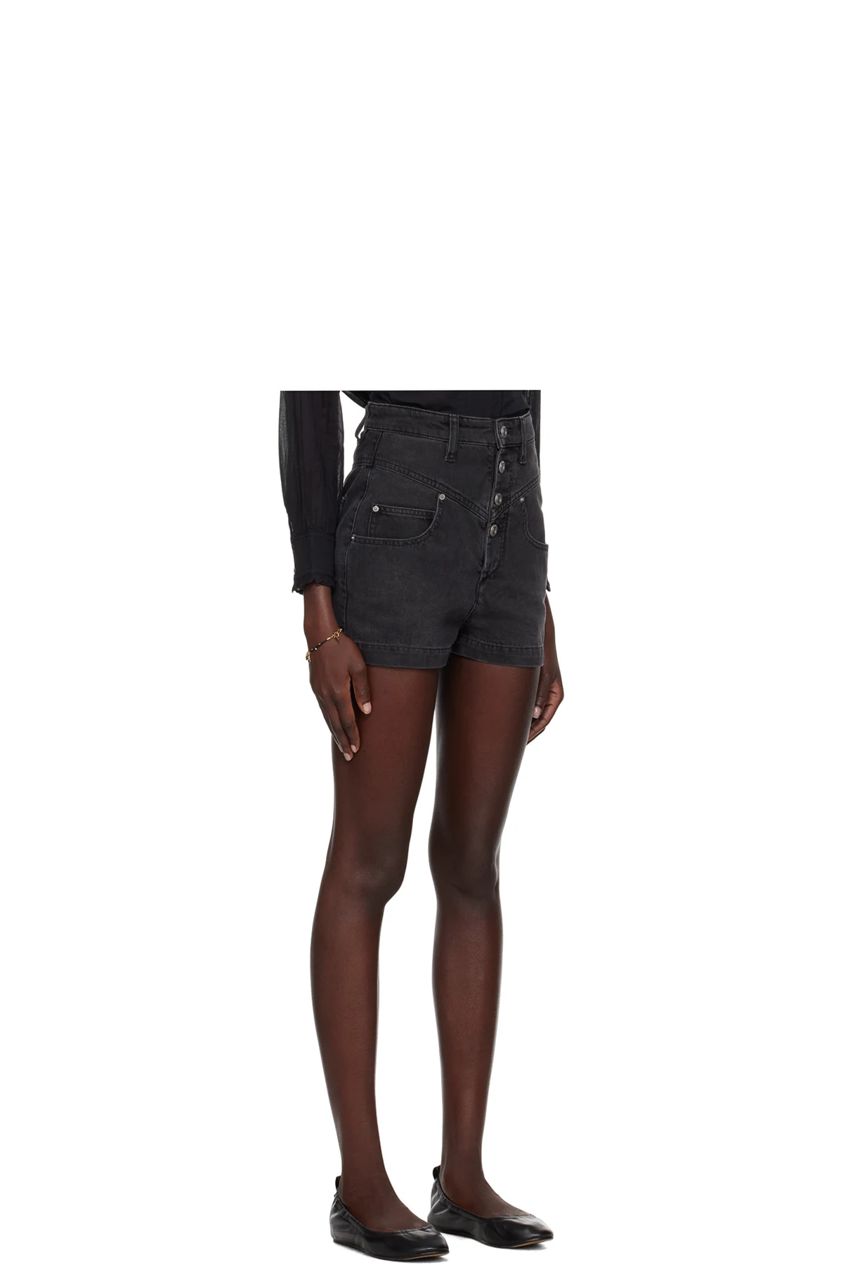 Garment-washed non-stretch denim shorts. Fading and whiskering throughout.