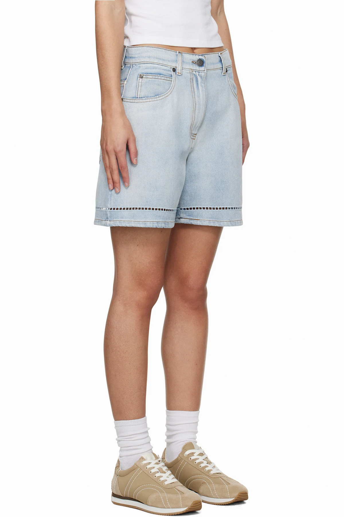 Garment-washed non-stretch denim shorts. Fading and subtle distressing throughout.