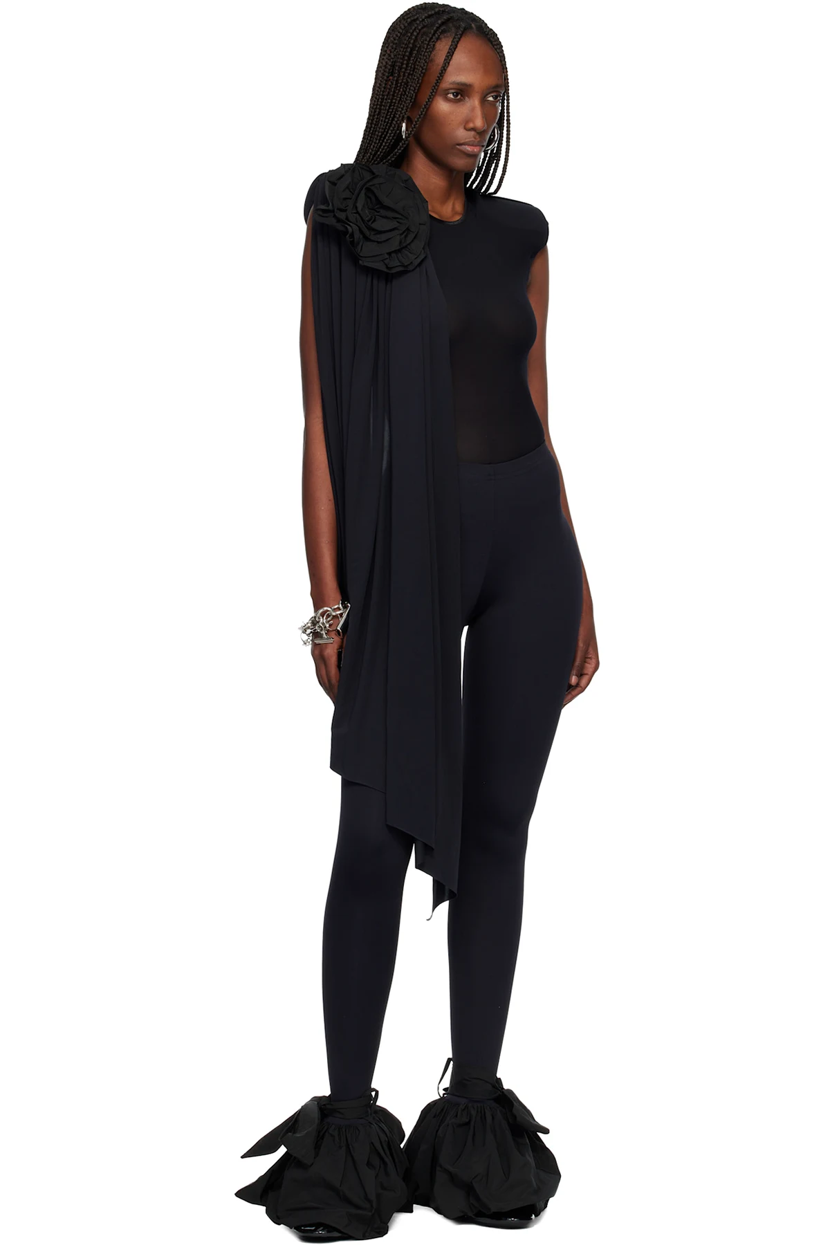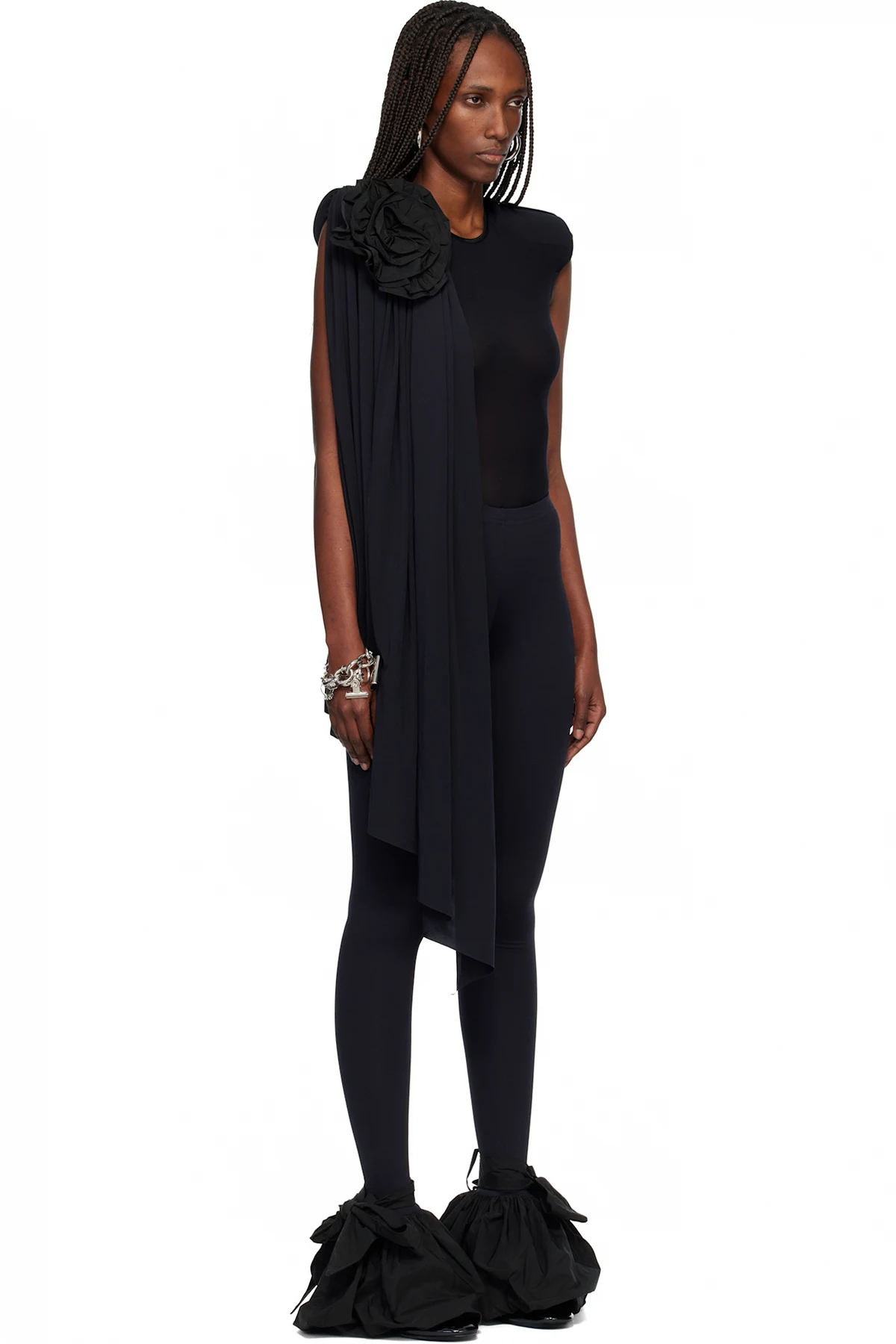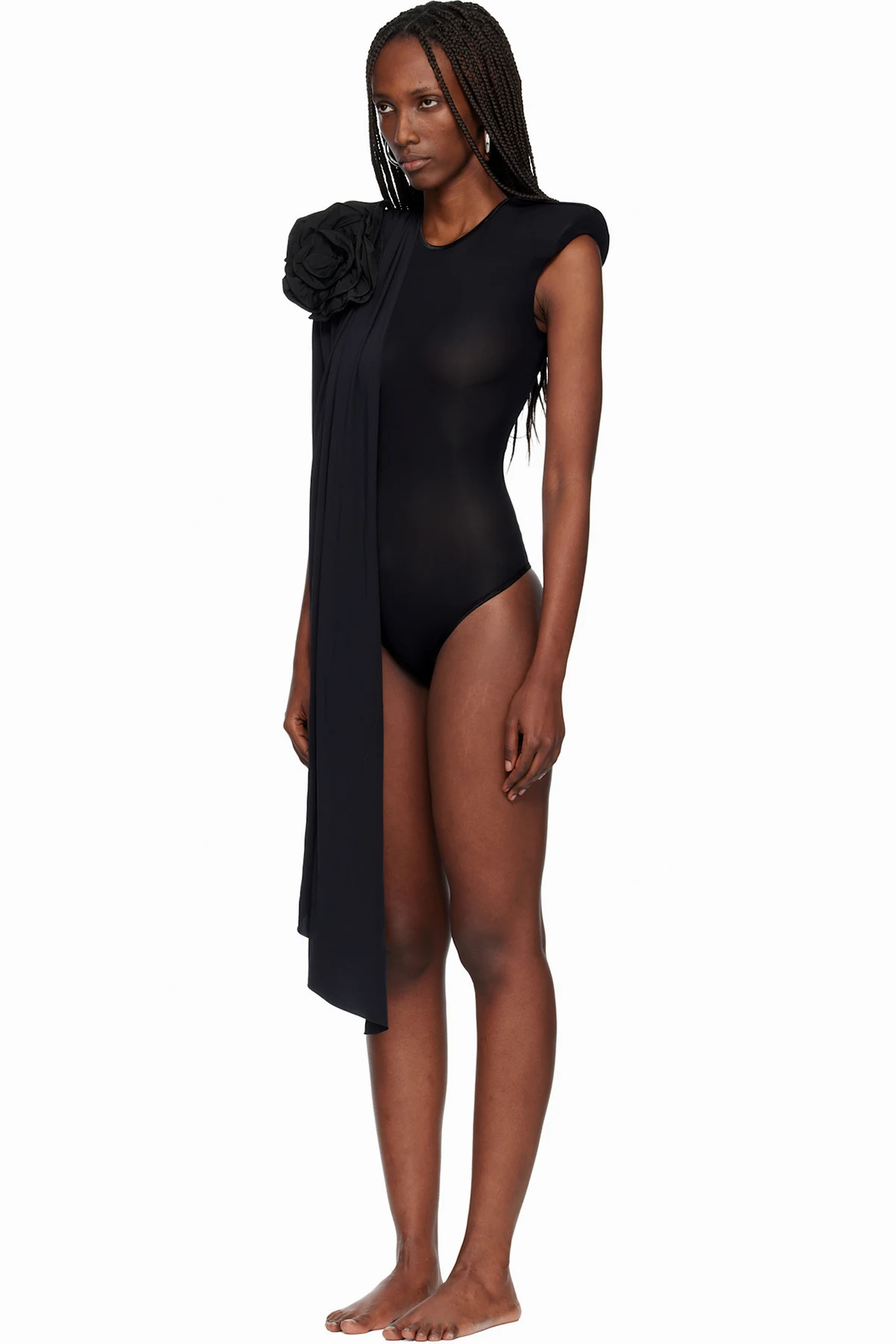 Stretch nylon jersey bodysuit. Draped panel with floral appliqué at shoulder.
