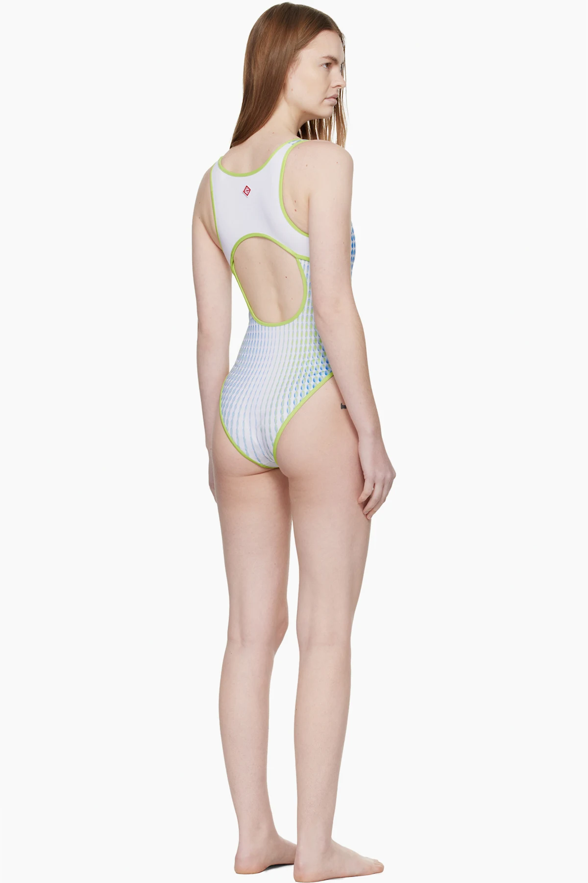 Body: 78% polyester, 22% elastane. Trim: 100% viscose. Lining: 86% polyester, 14% elastane.