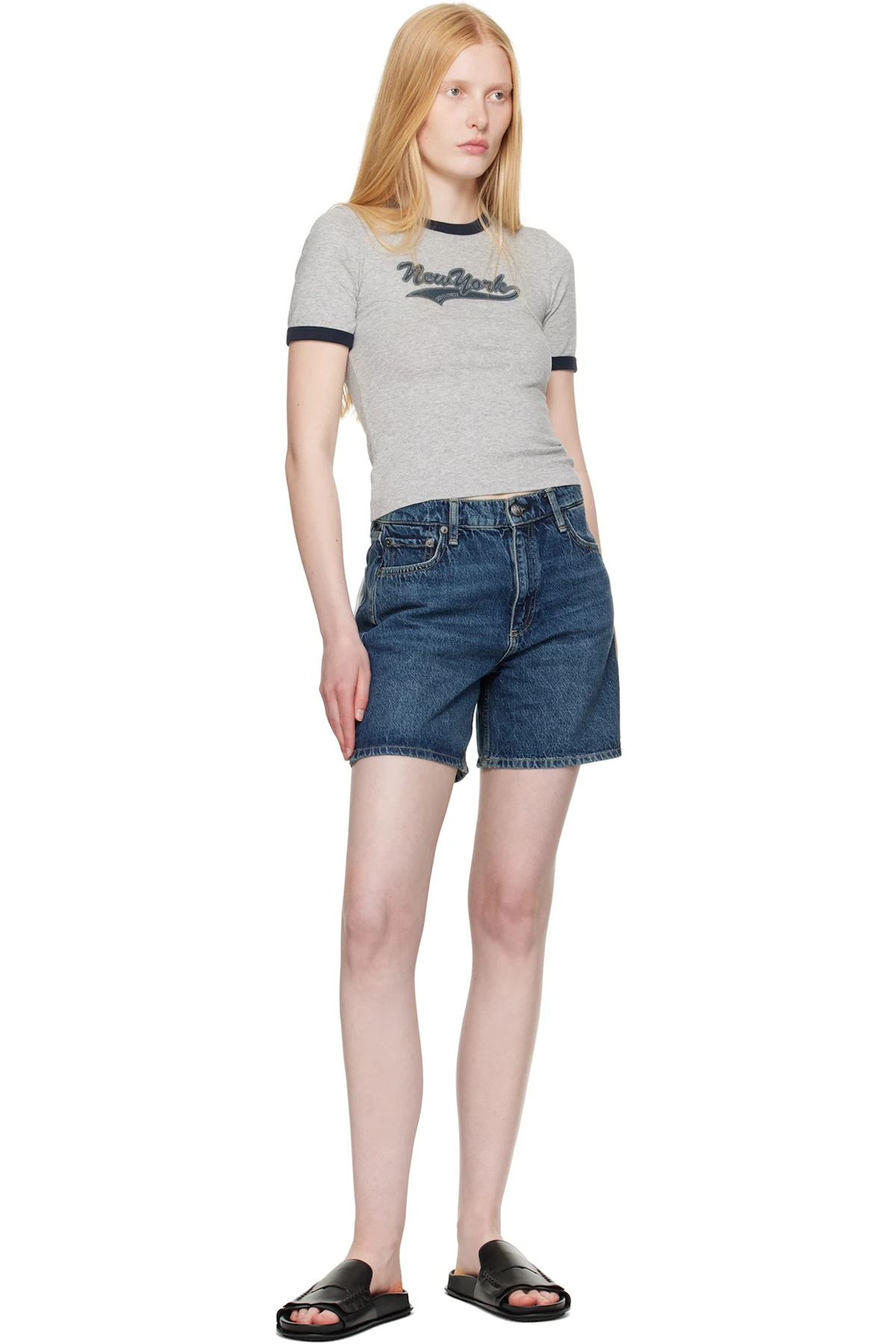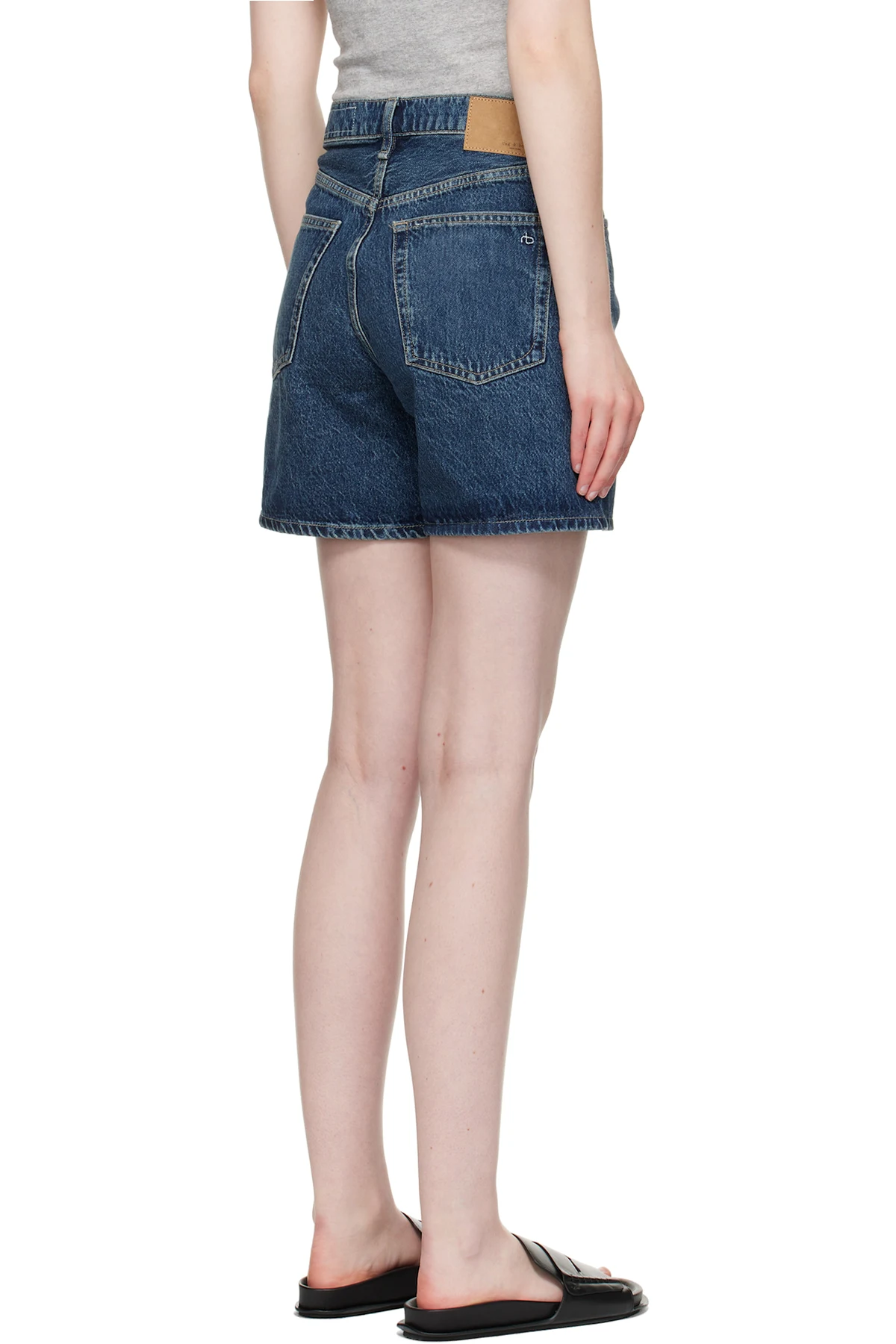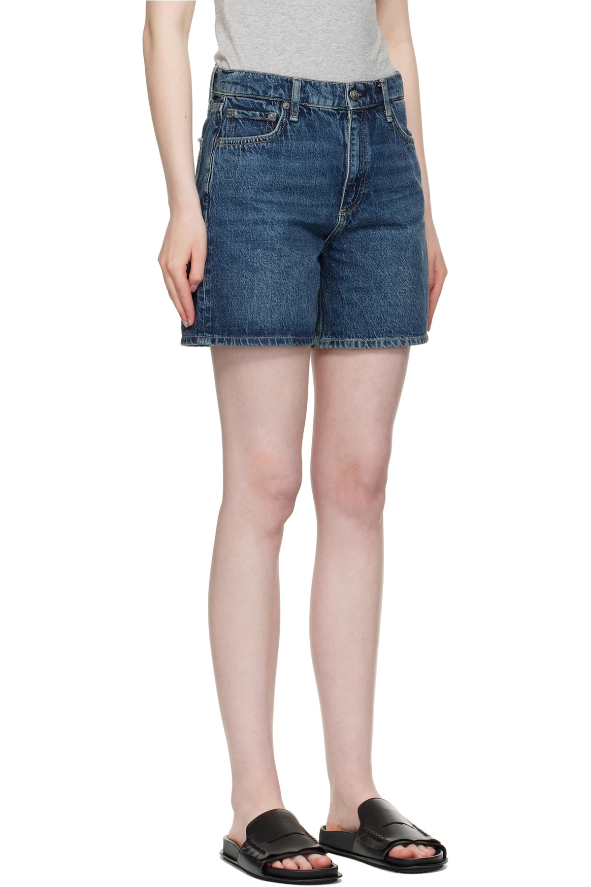 Non-stretch denim shorts. Fading and whiskering throughout.