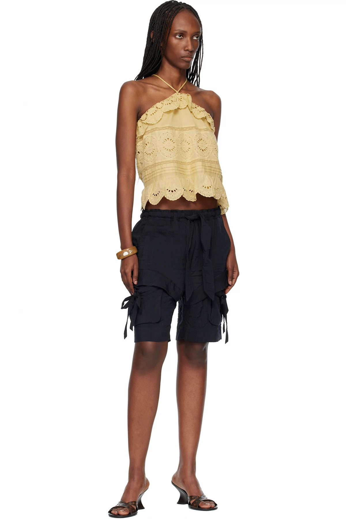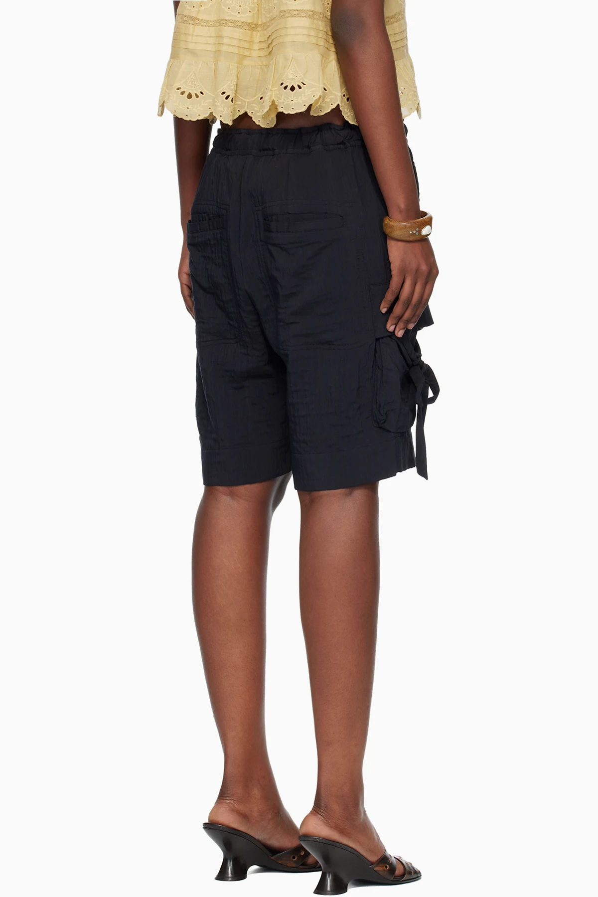 · Patch pocket at outseams with self-tie drawstring