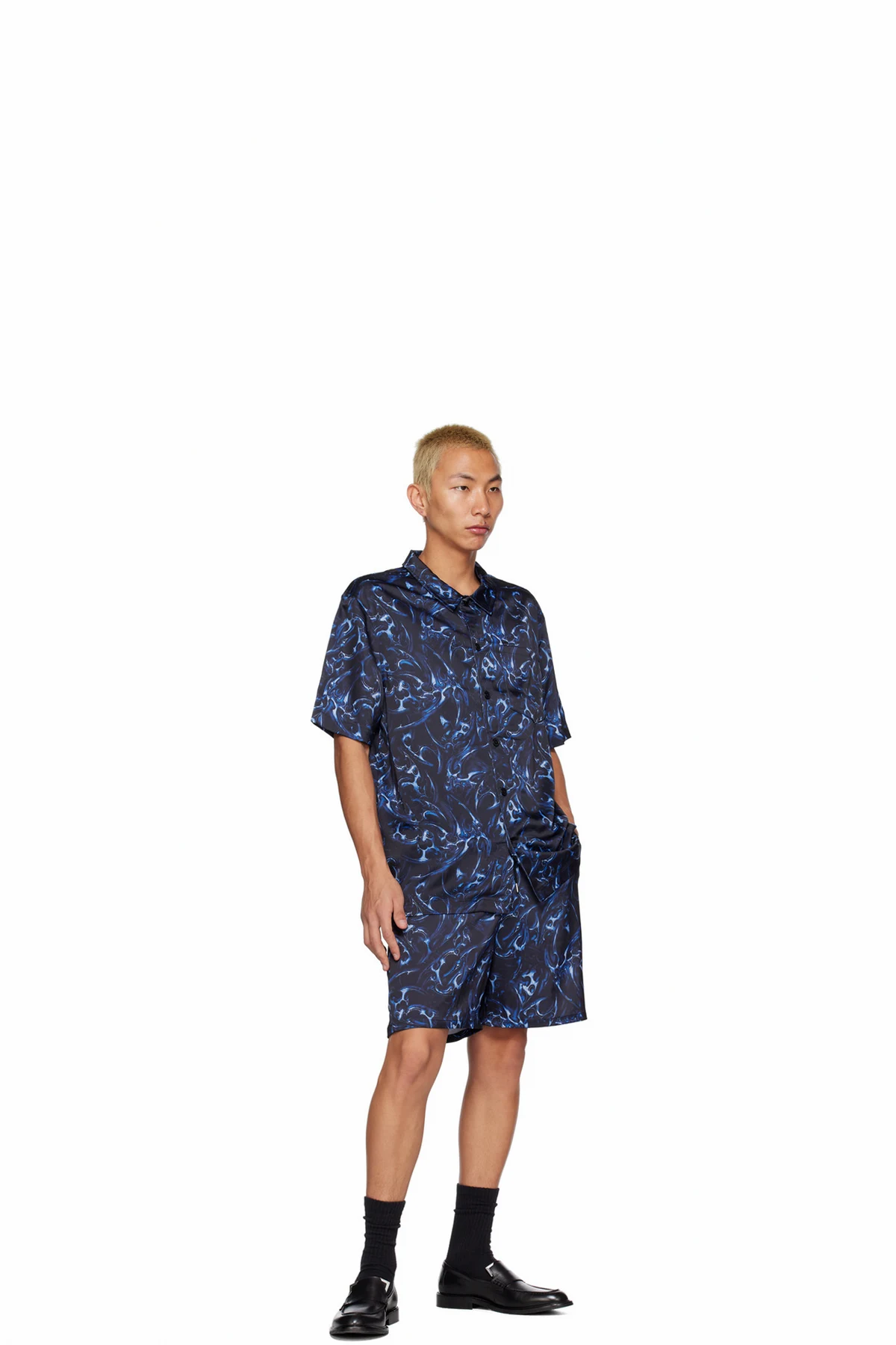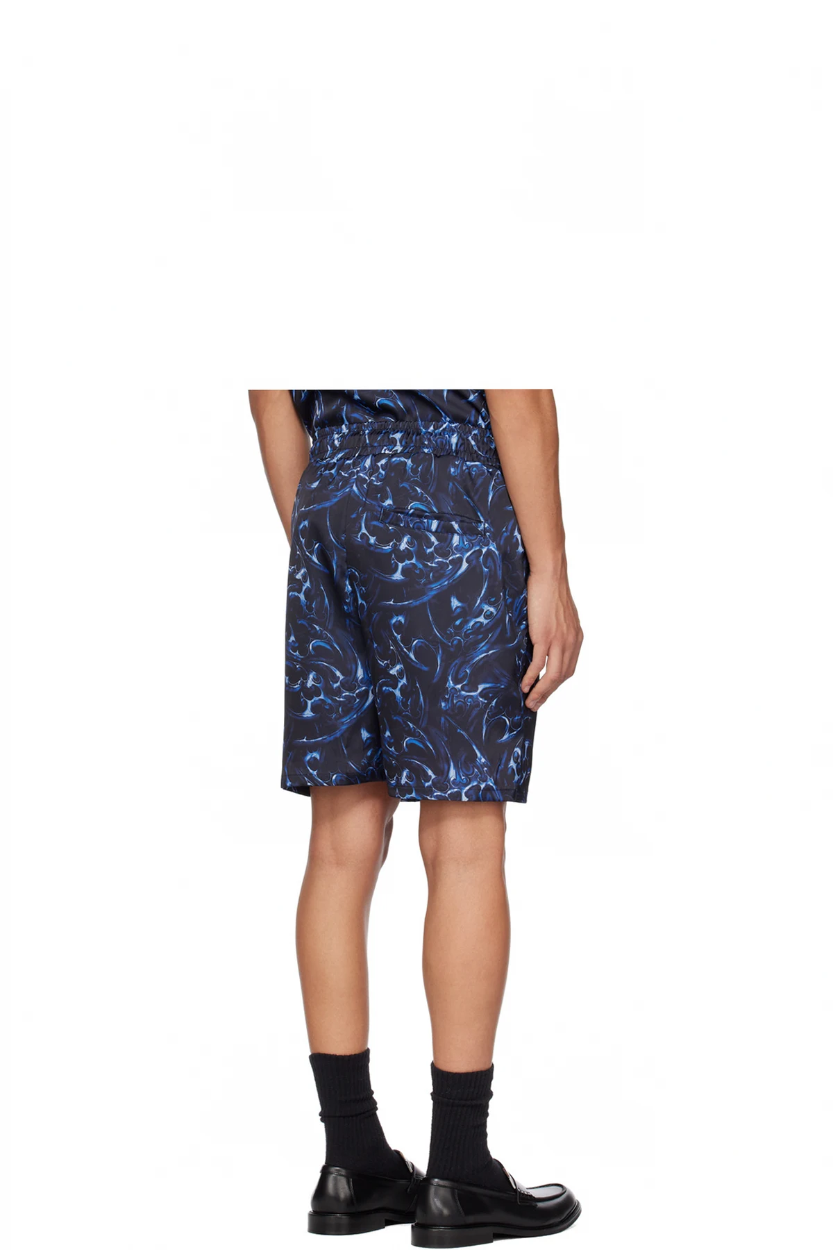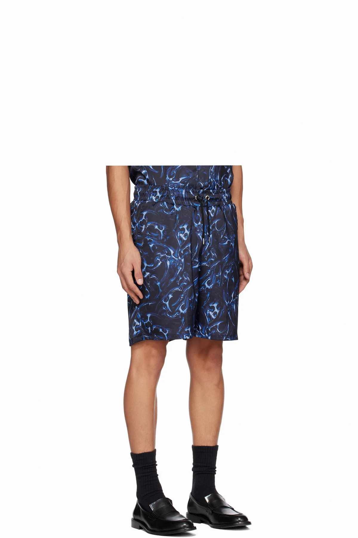 Polyester satin shorts. Graphic pattern printed throughout.