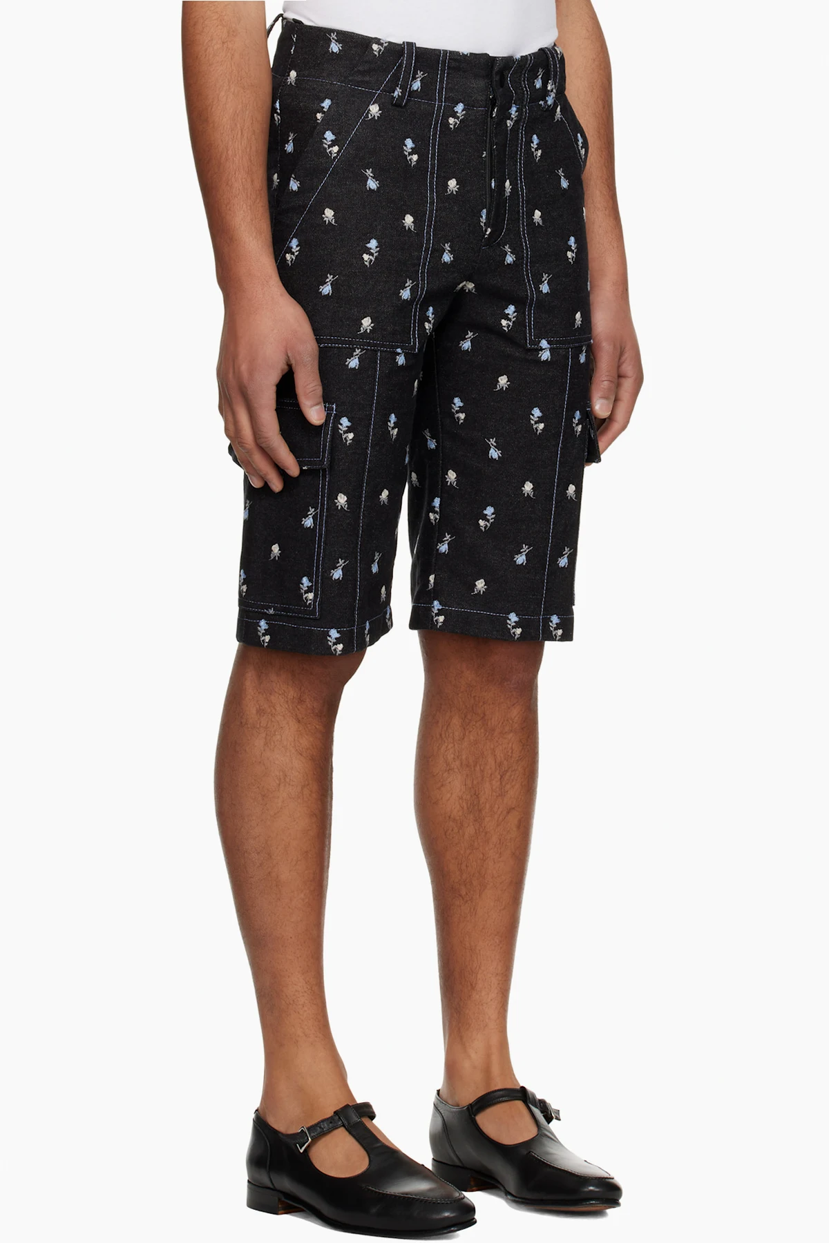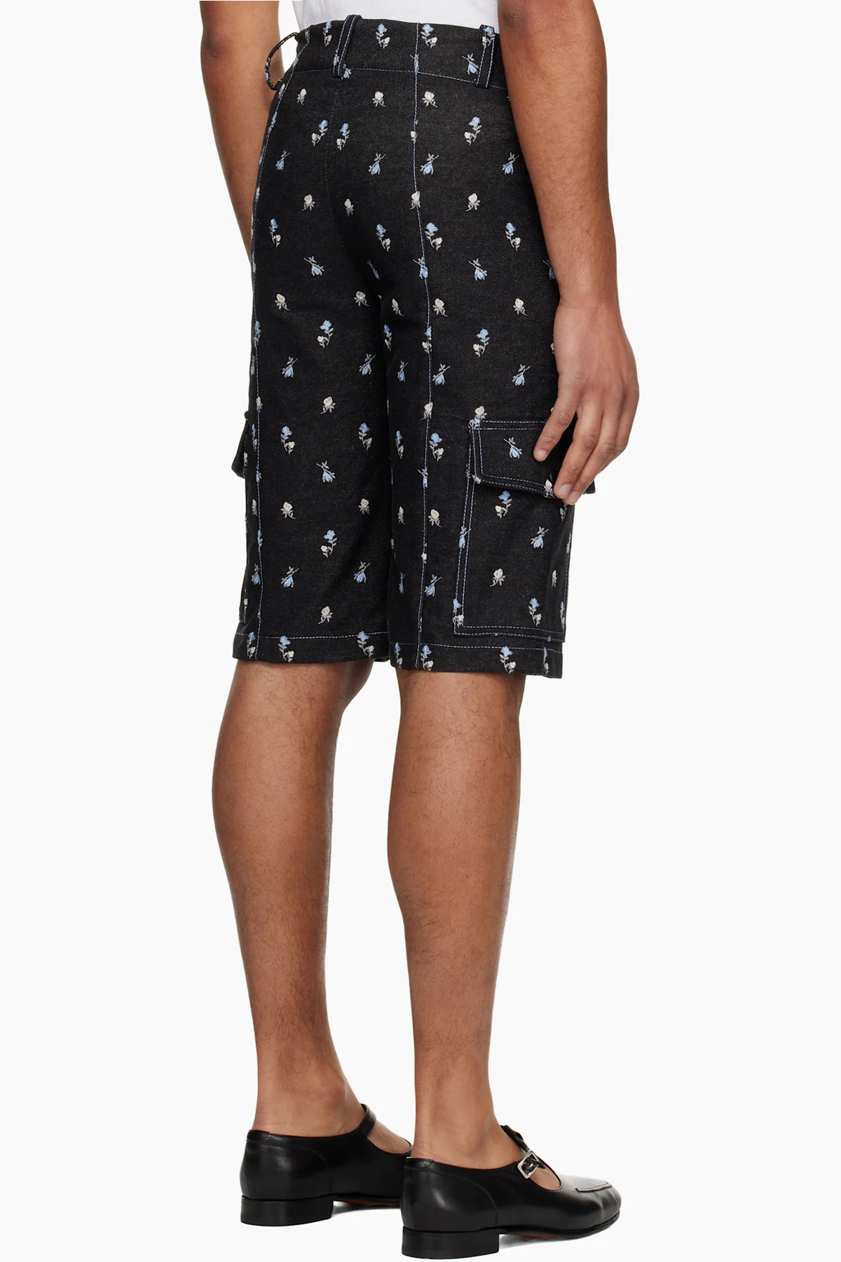 Black Embroidered Roses Denim Cargo Shorts