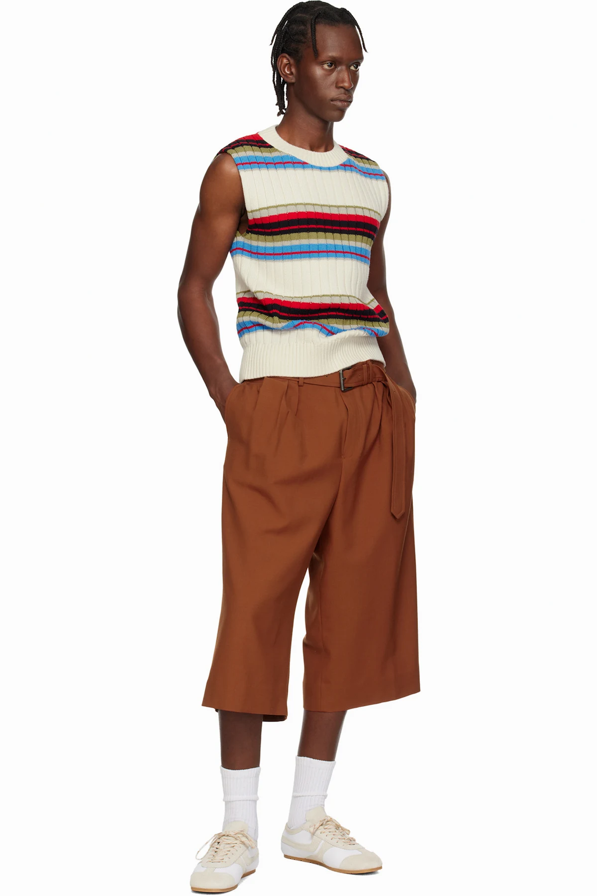 · Belt loops and integrated pin-buckle belt at waistband
