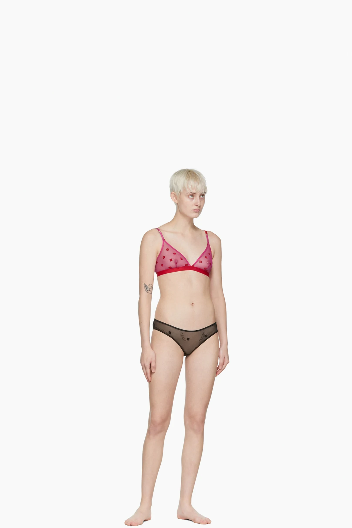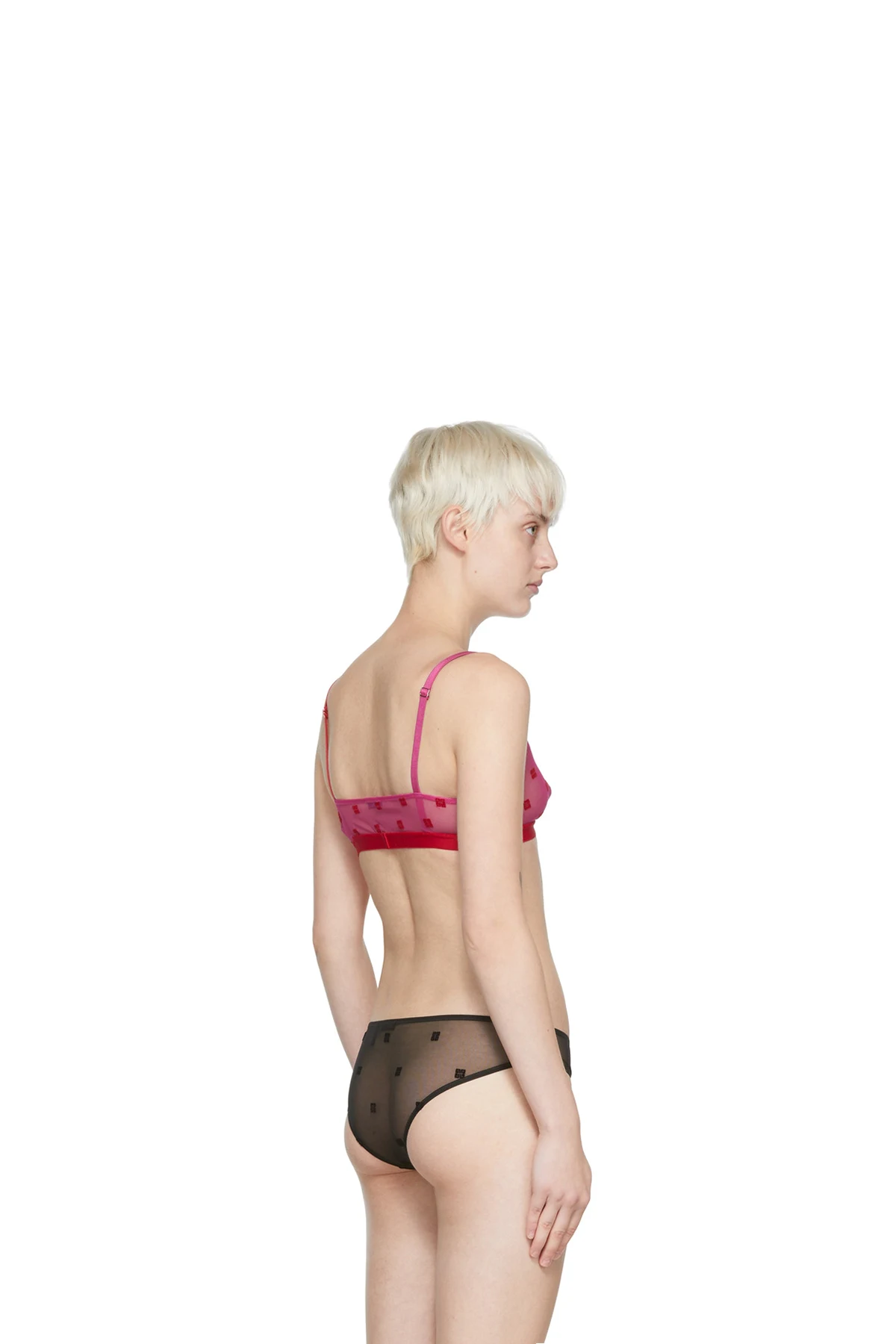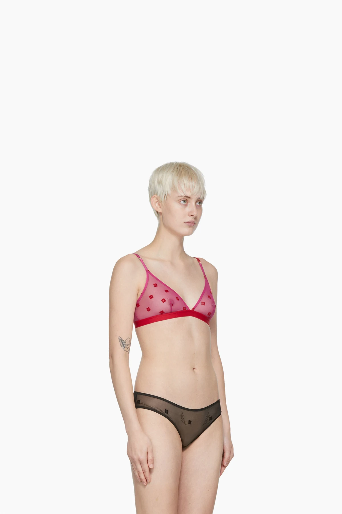 Semi-sheer stretch nylon mesh bra. Logo pattern flocked throughout.