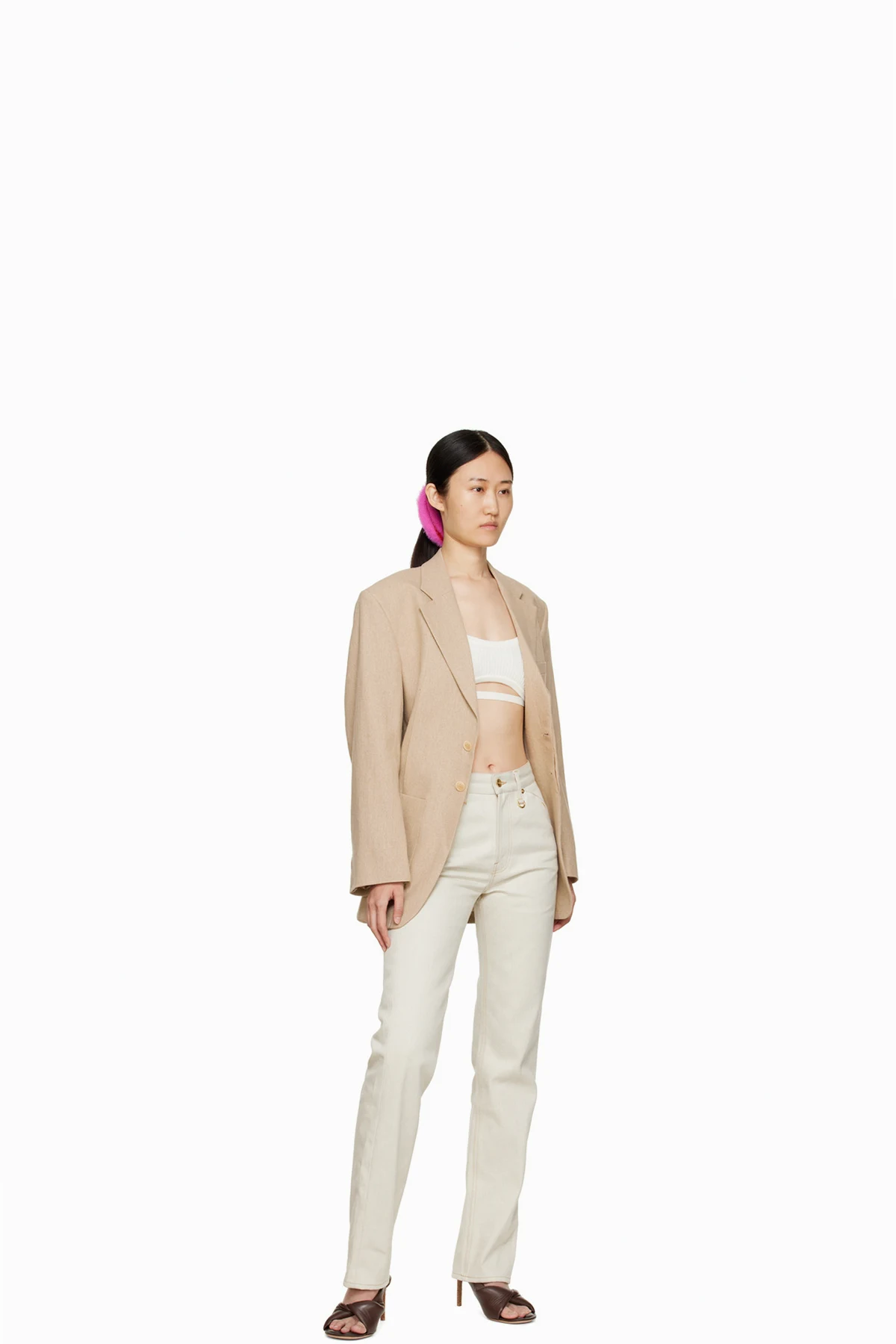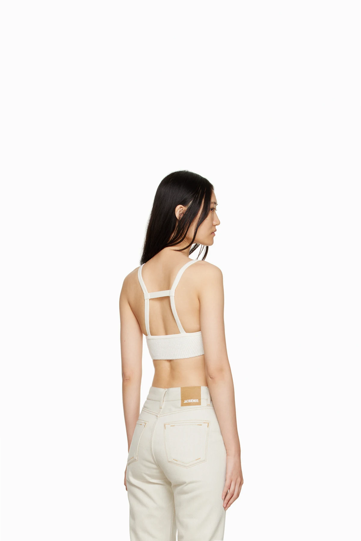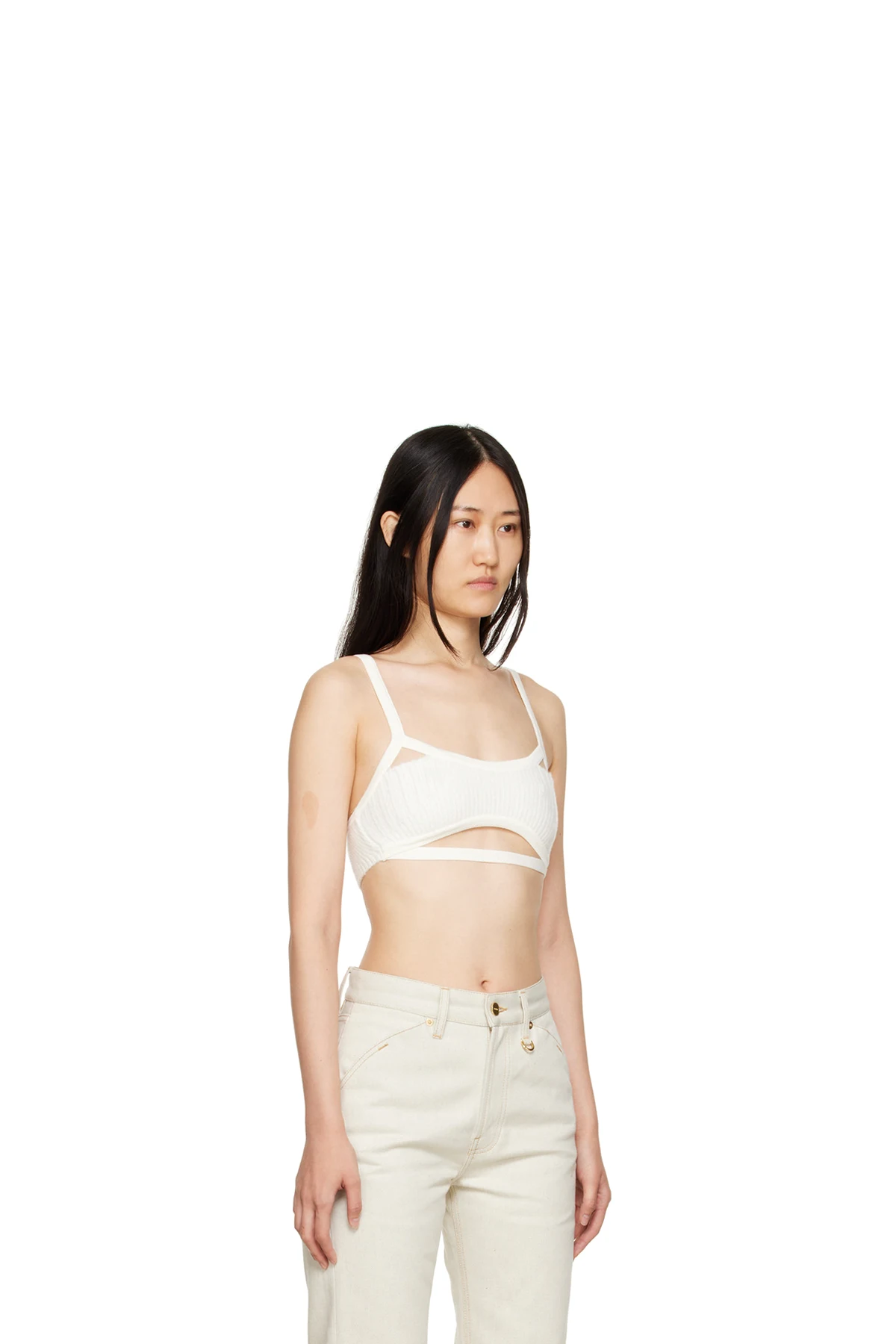 Brushed rib knit polyester, nylon, and virgin wool-blend bra.