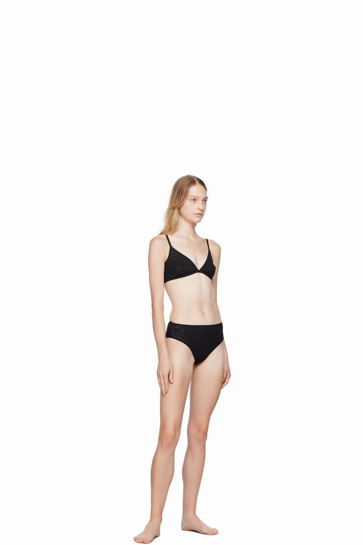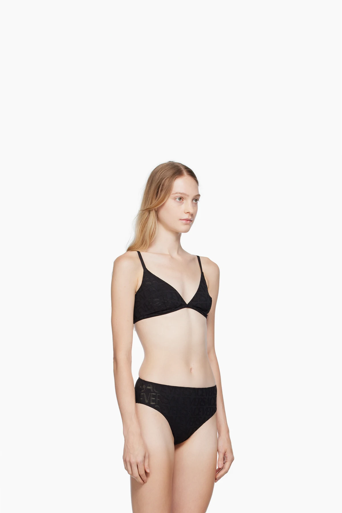 Semi-sheer stretch nylon mesh bra. Jacquard logo graphic throughout.