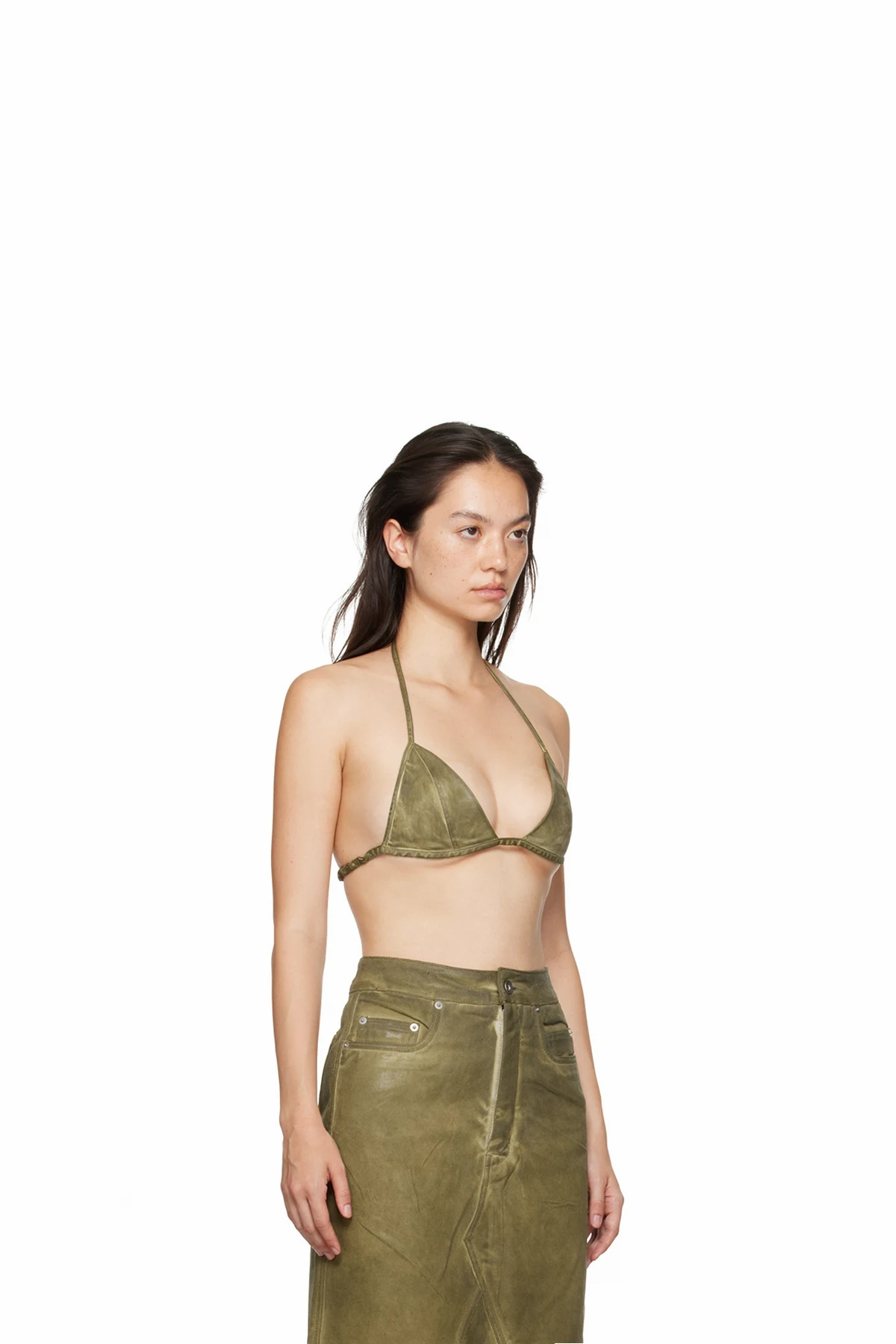 Foil-coated lightweight stretch denim bra.