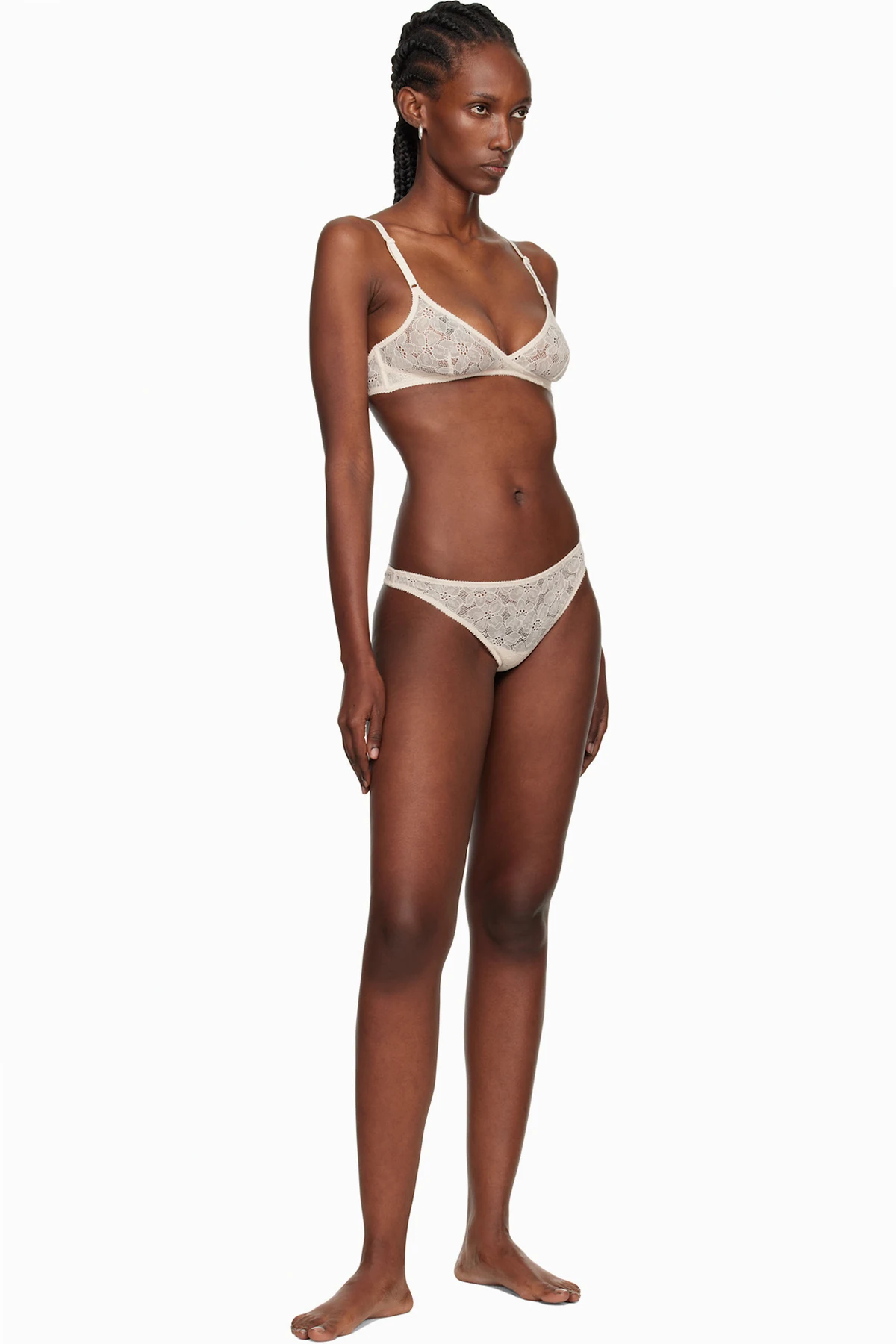 Semi-sheer stretch nylon-blend lace bra.